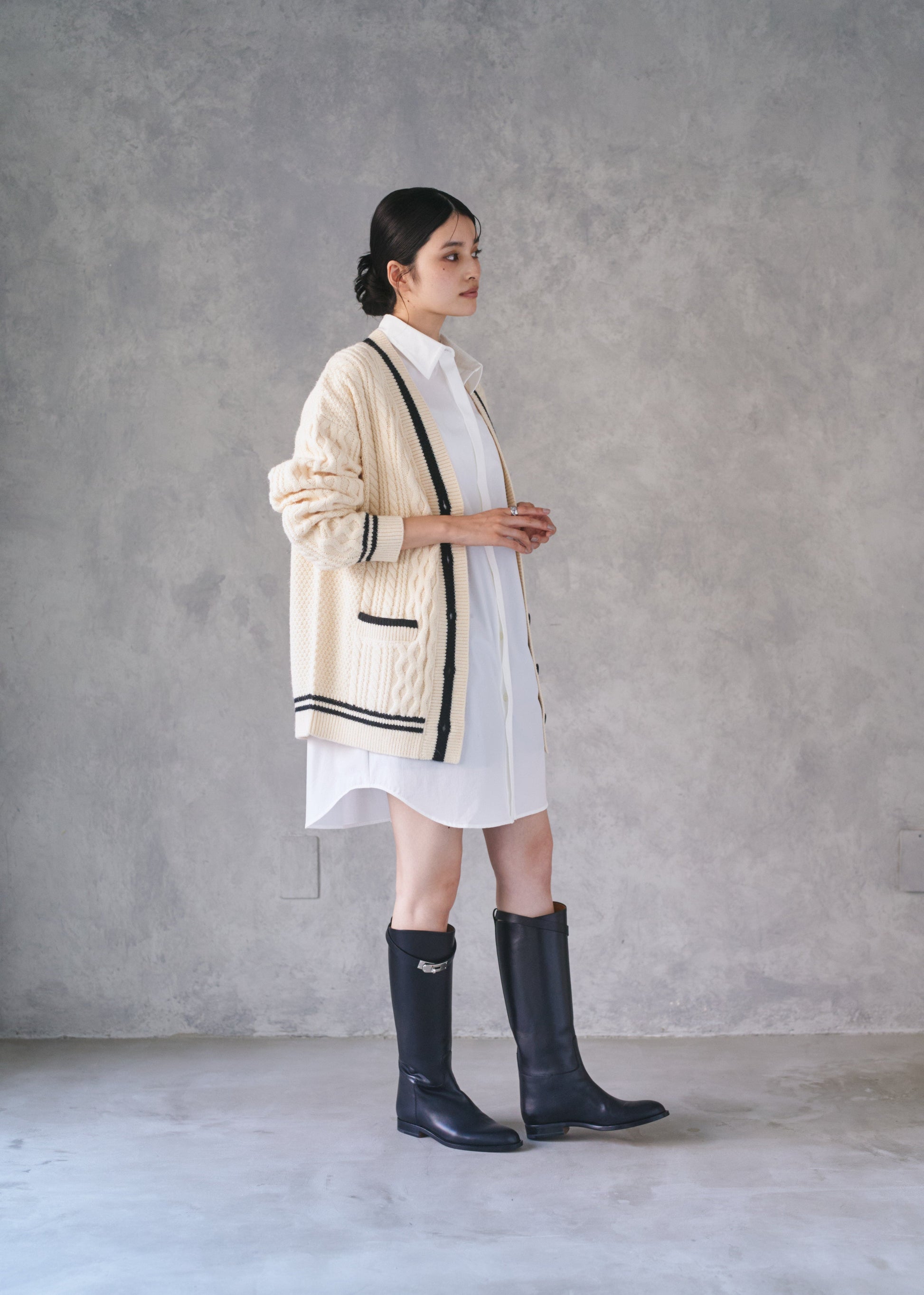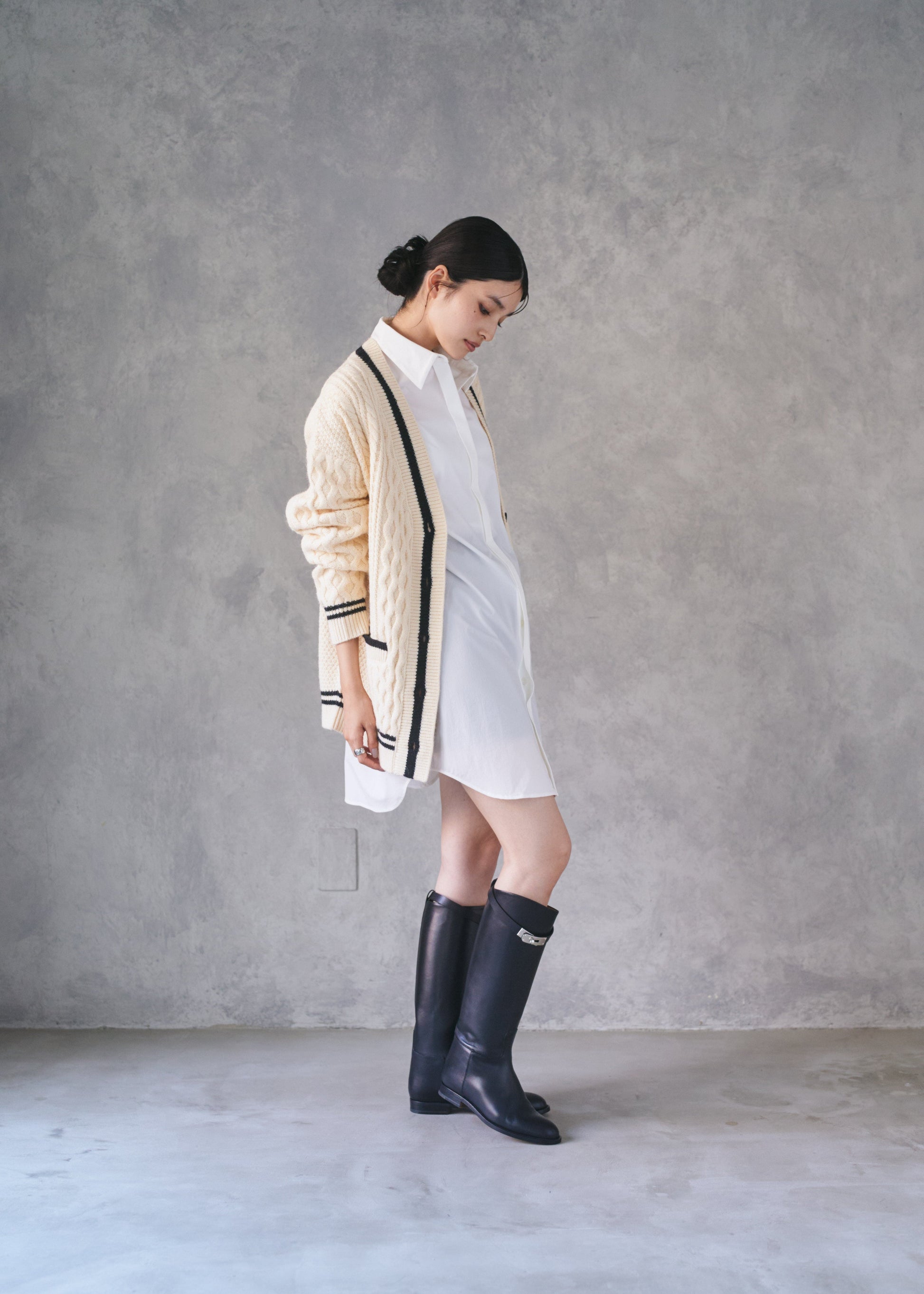 今年らしいロング丈で、体型カバーや寒さ対策にも一枚あれば重宝すること間違いなしのアイテムです。シャツワンピースと合わせたコーディネートがおすすめです。
