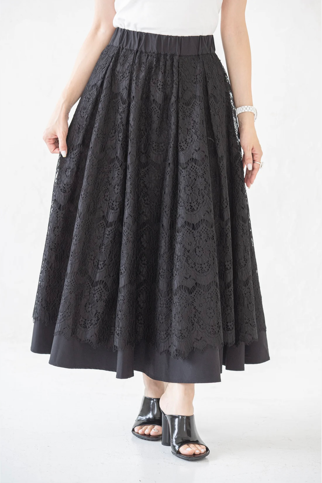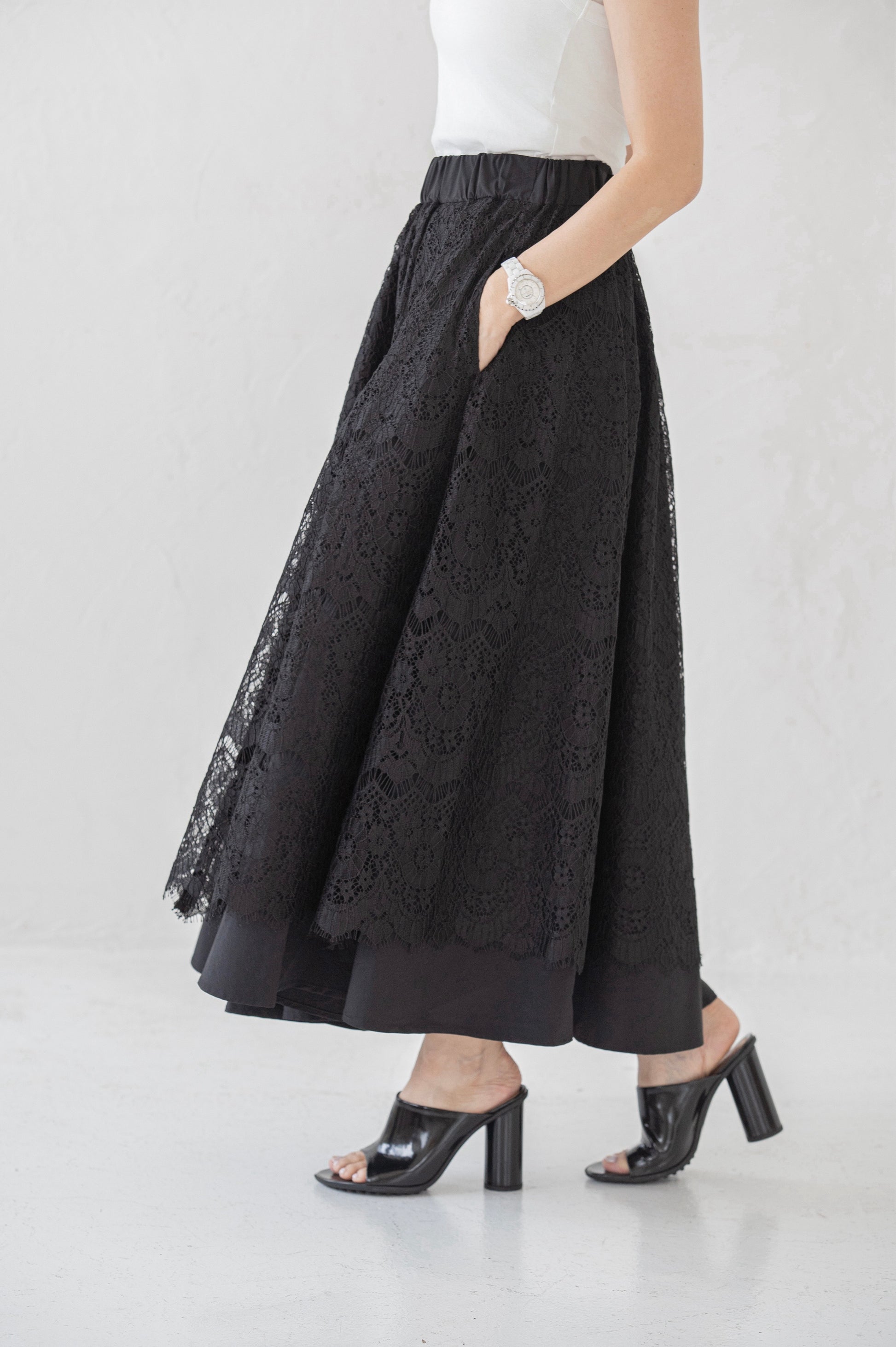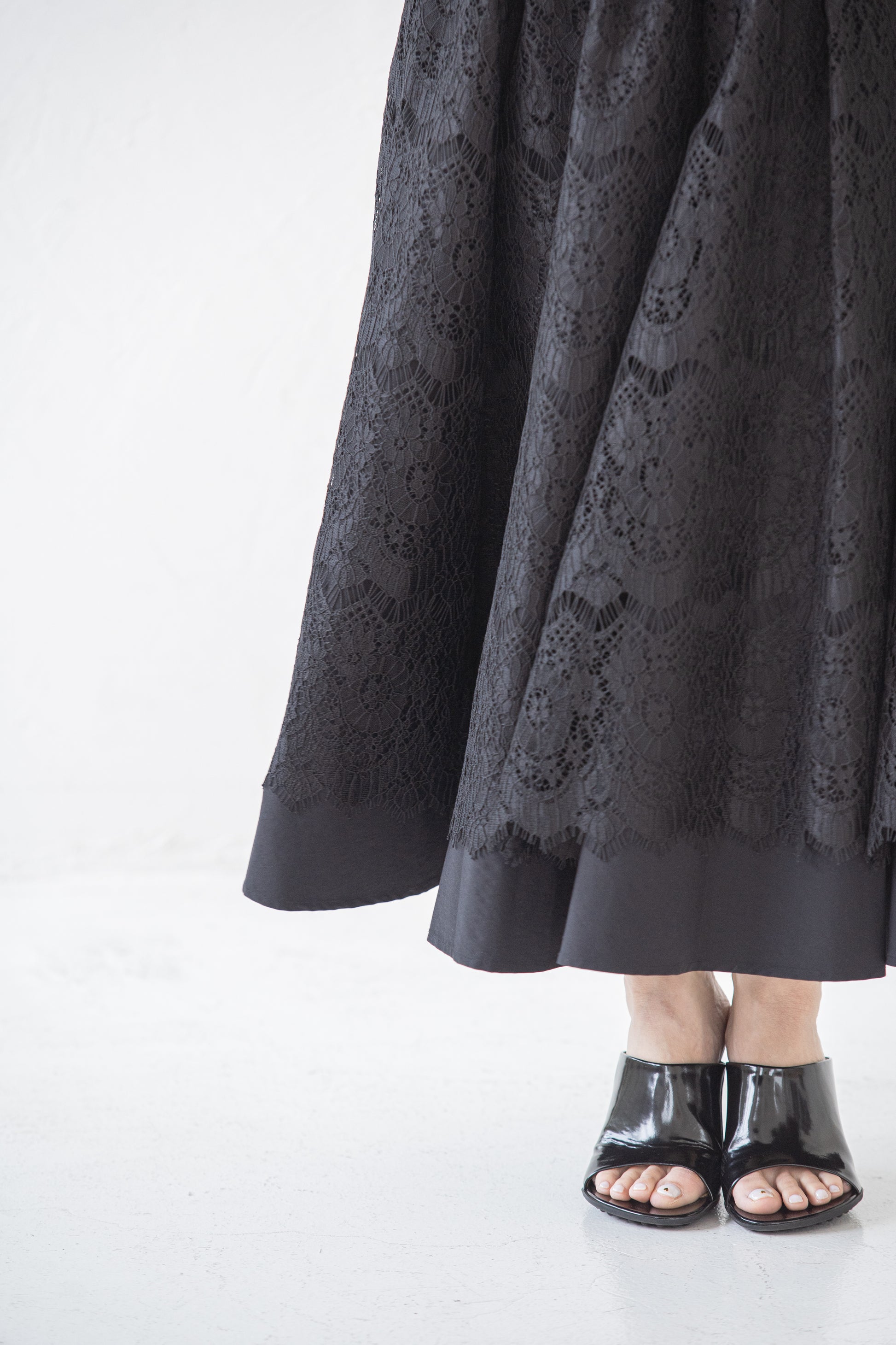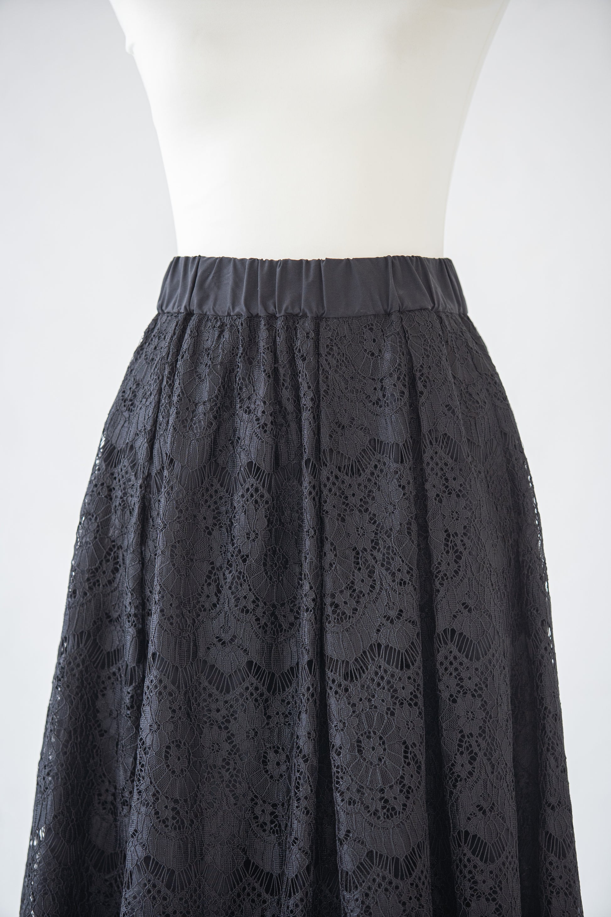 洗練されたディテールとロマンテックな魅力のあるボリューム感が特徴のレースのフルスカート。エレガントで洗練されたデザインにもかかわらずウエストぐるりゴムのためストレスなくどんな体型の方にも、日常的にお使いいただきやすいデザインに仕上げました。