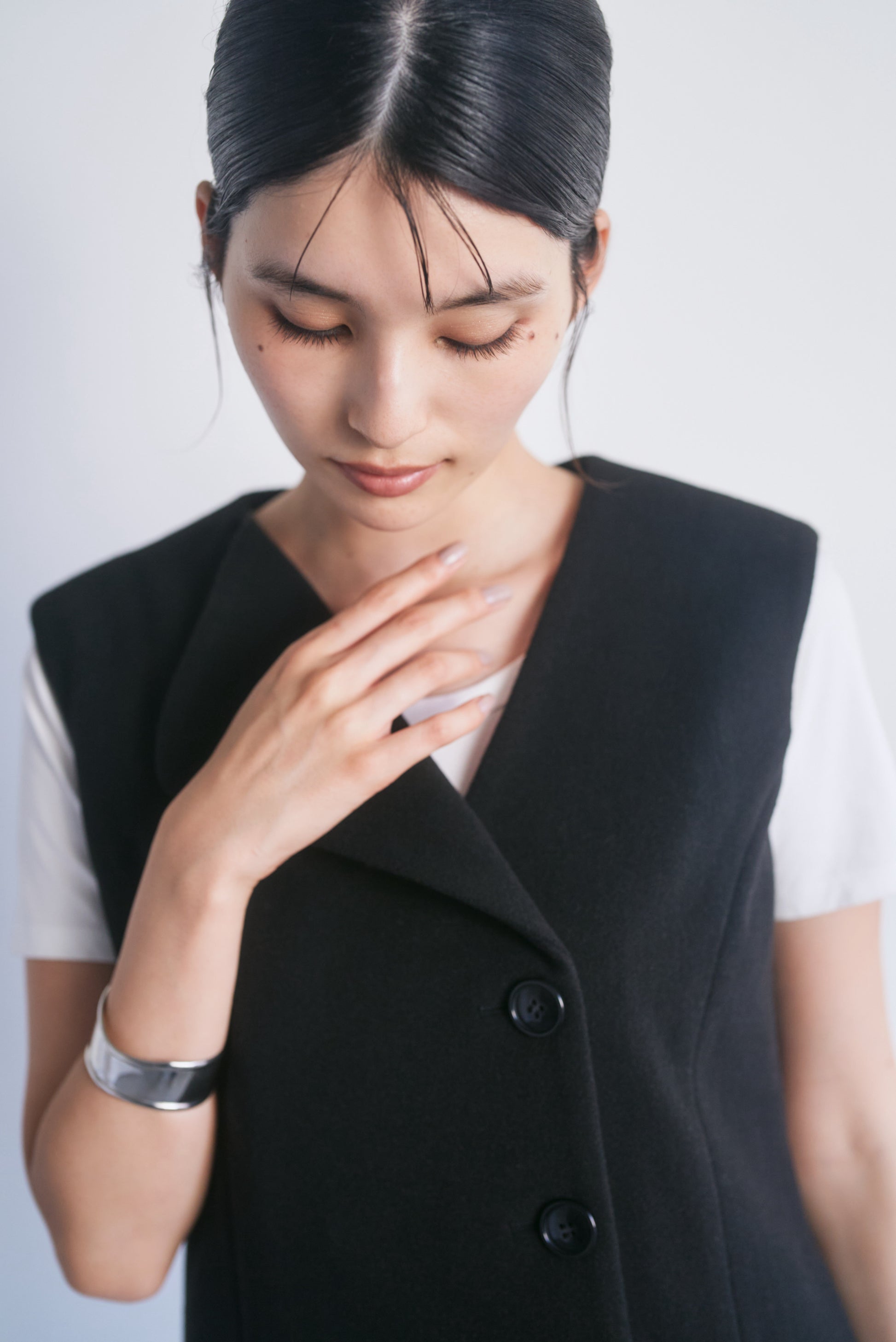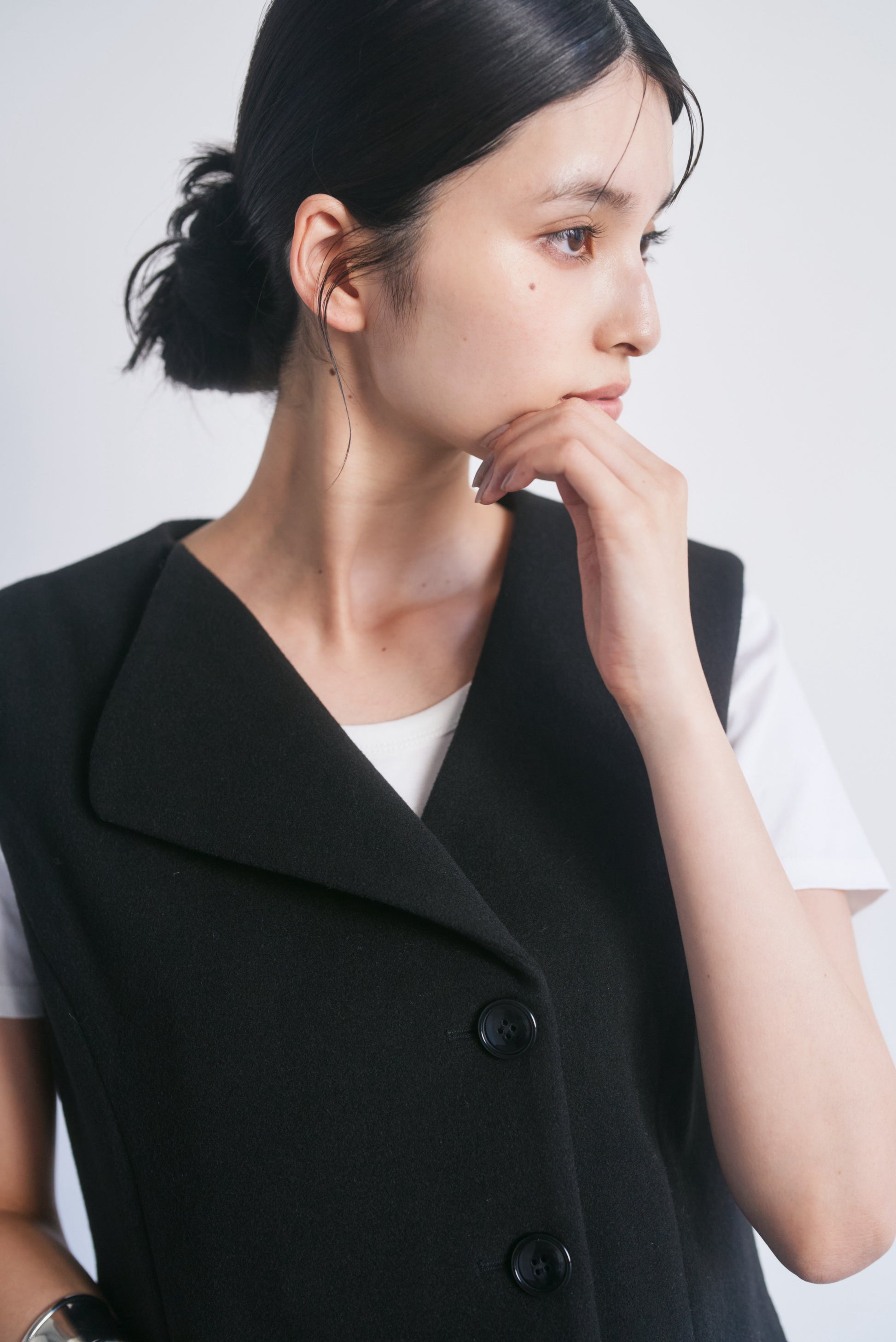 前を開けて着ていただくとジレとしてもお使いいただける万能アイテムです。