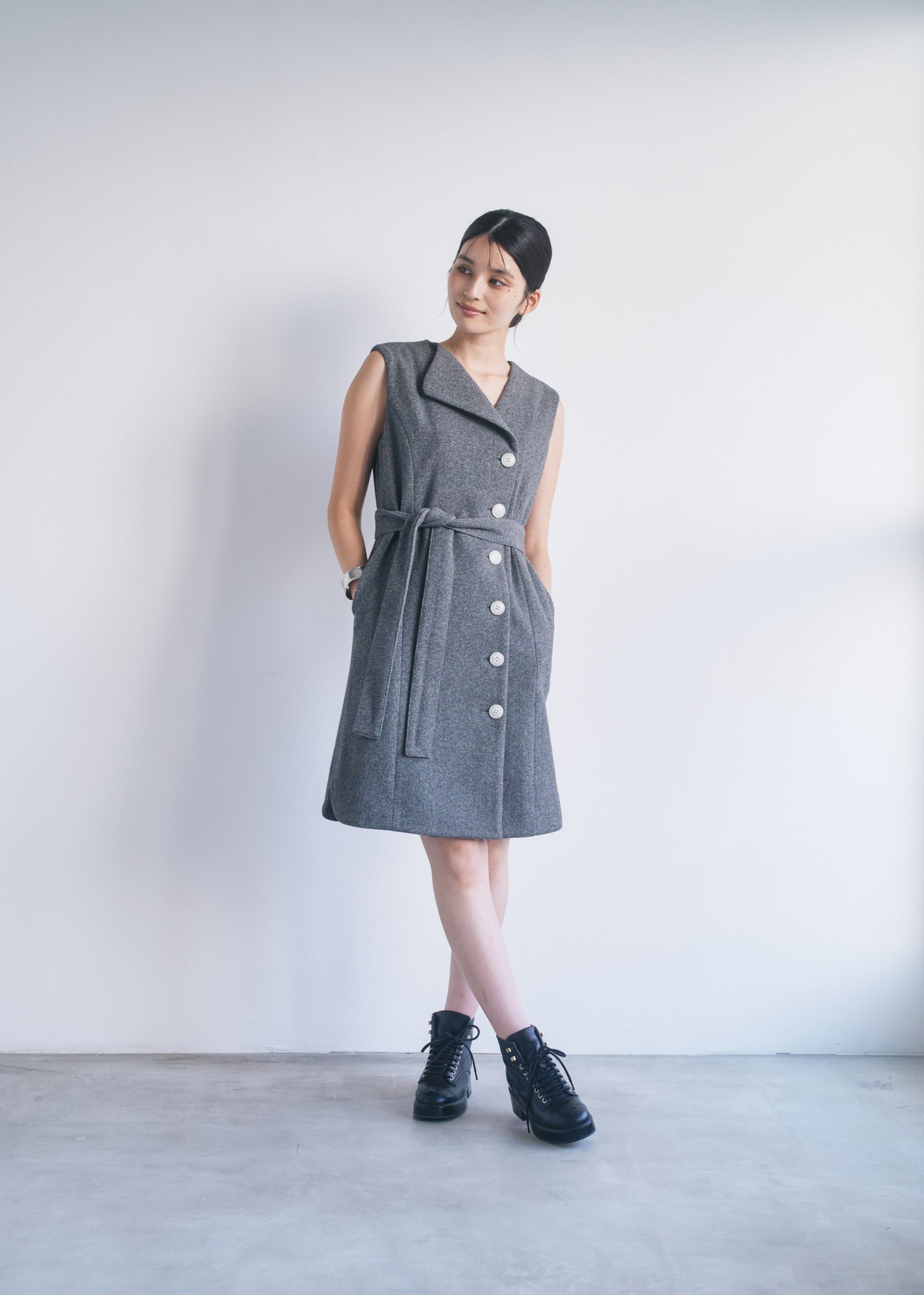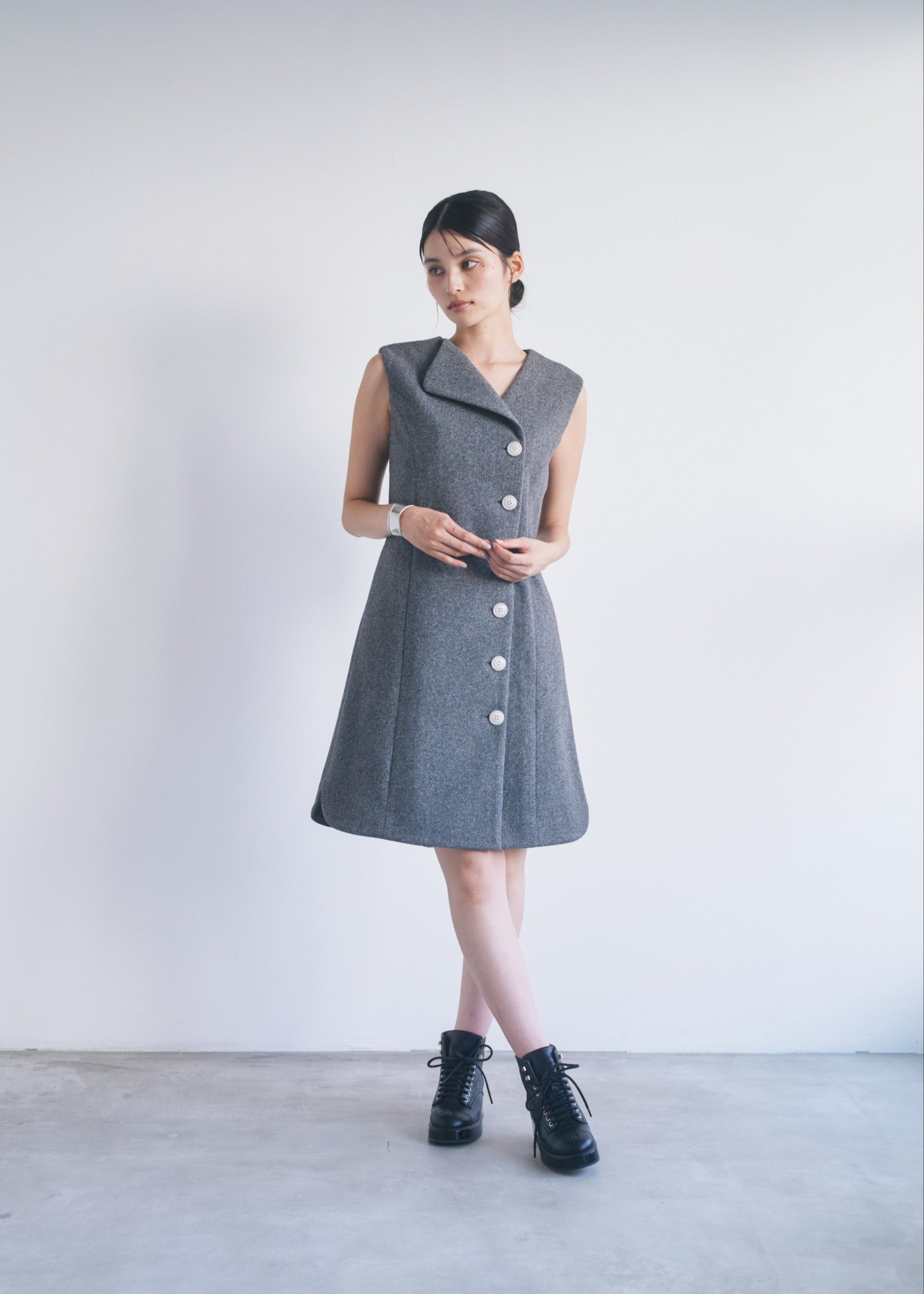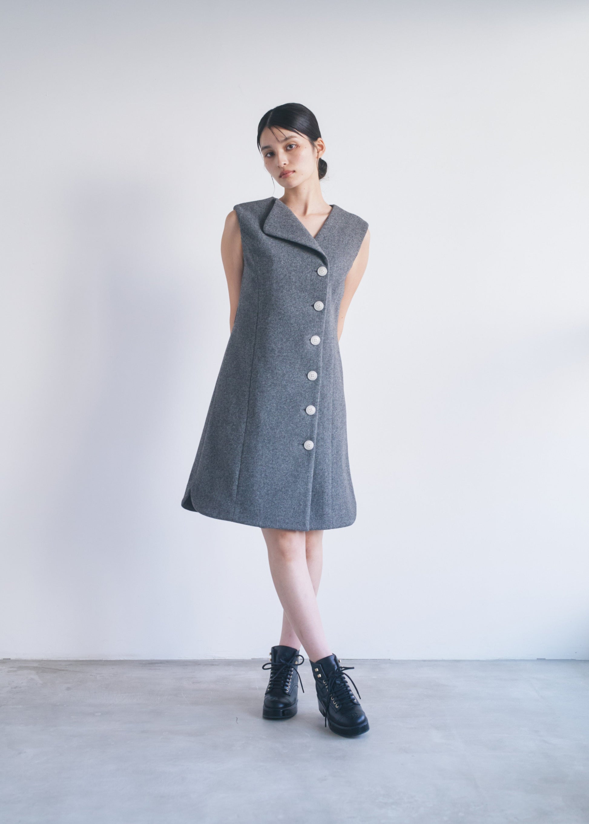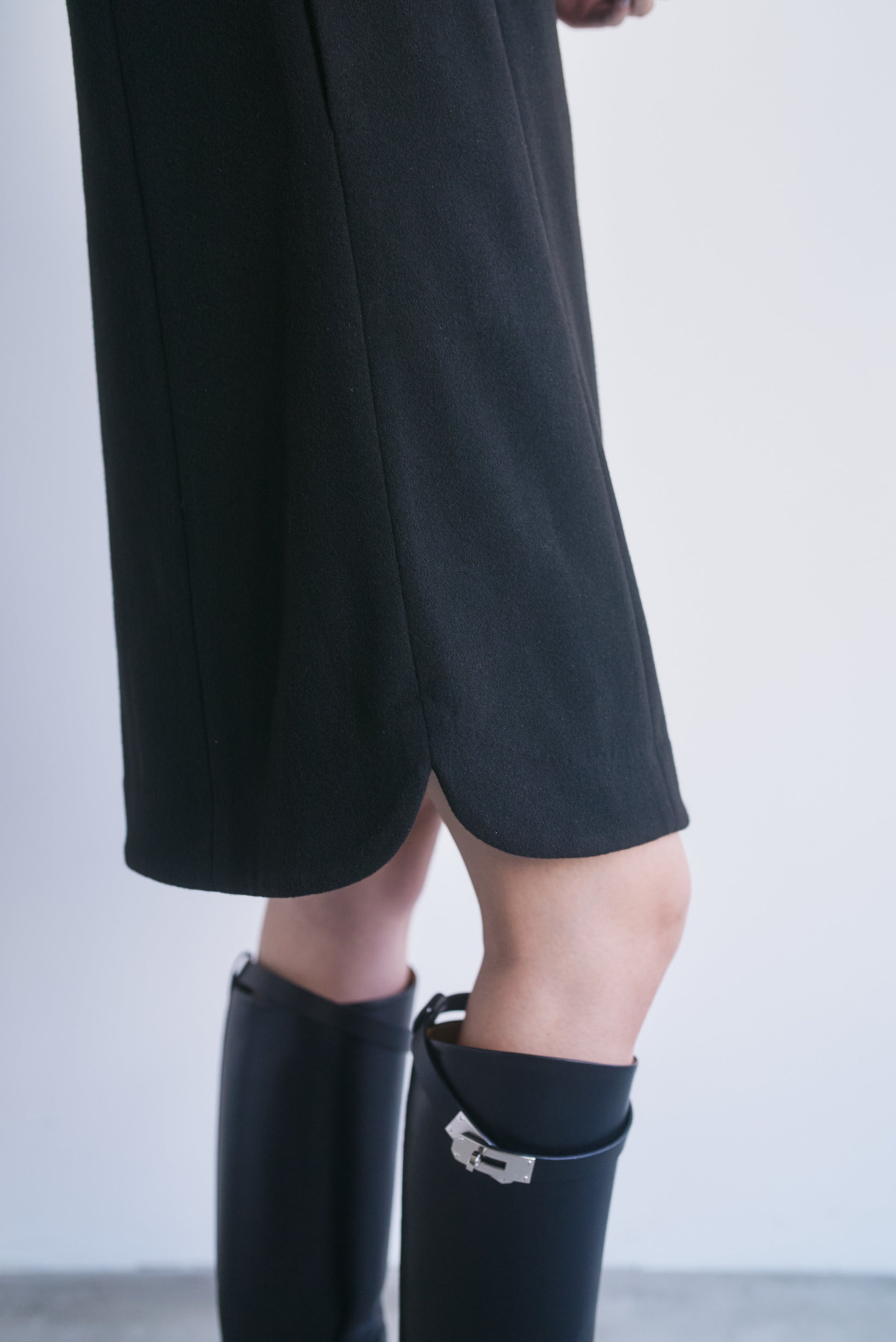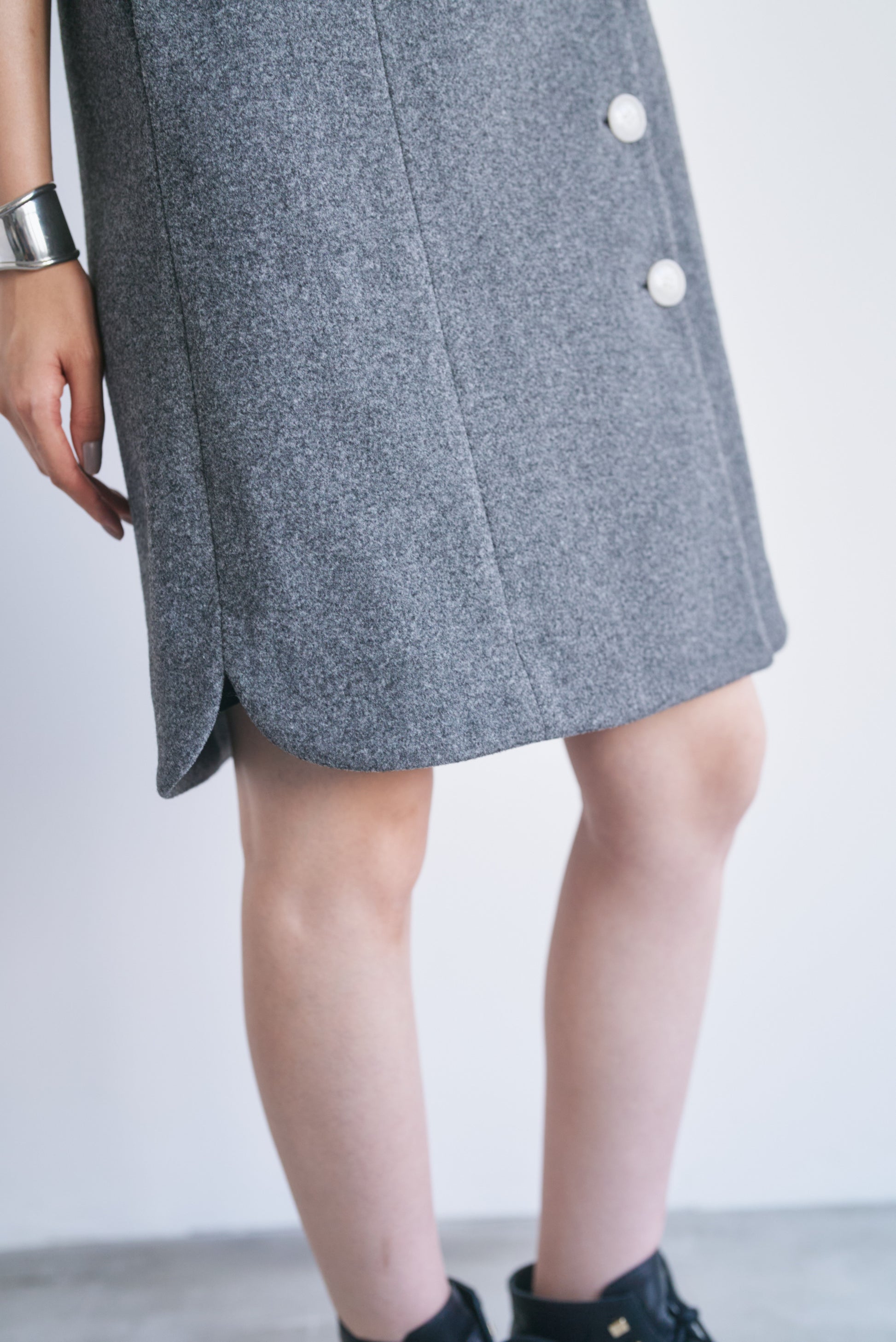 適度なハリがあるので、Vネックやアシンメトリーのシルエットがくっきり出やすいです。スカート部分も広がりすぎず、構築的なラインをキープできます。