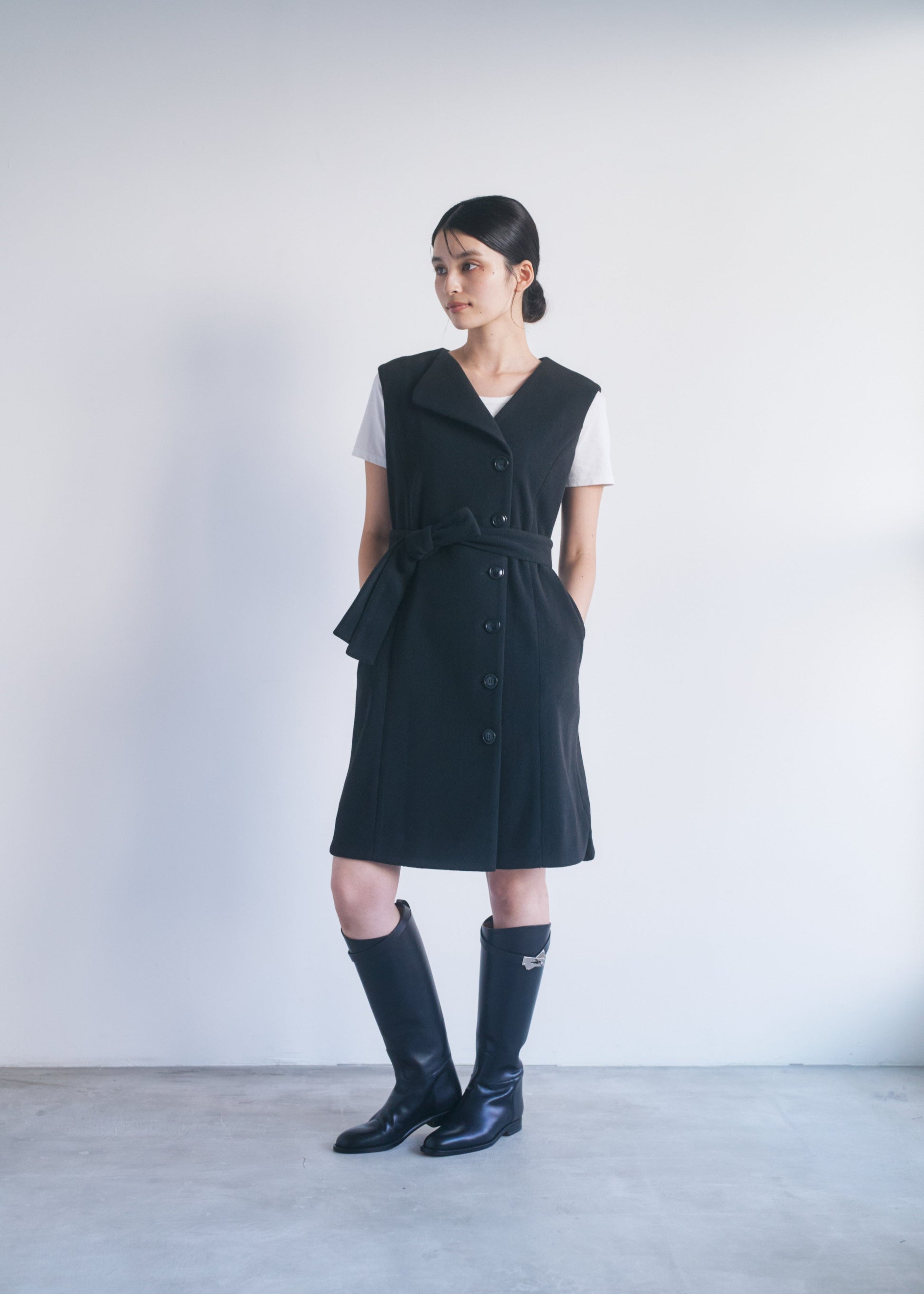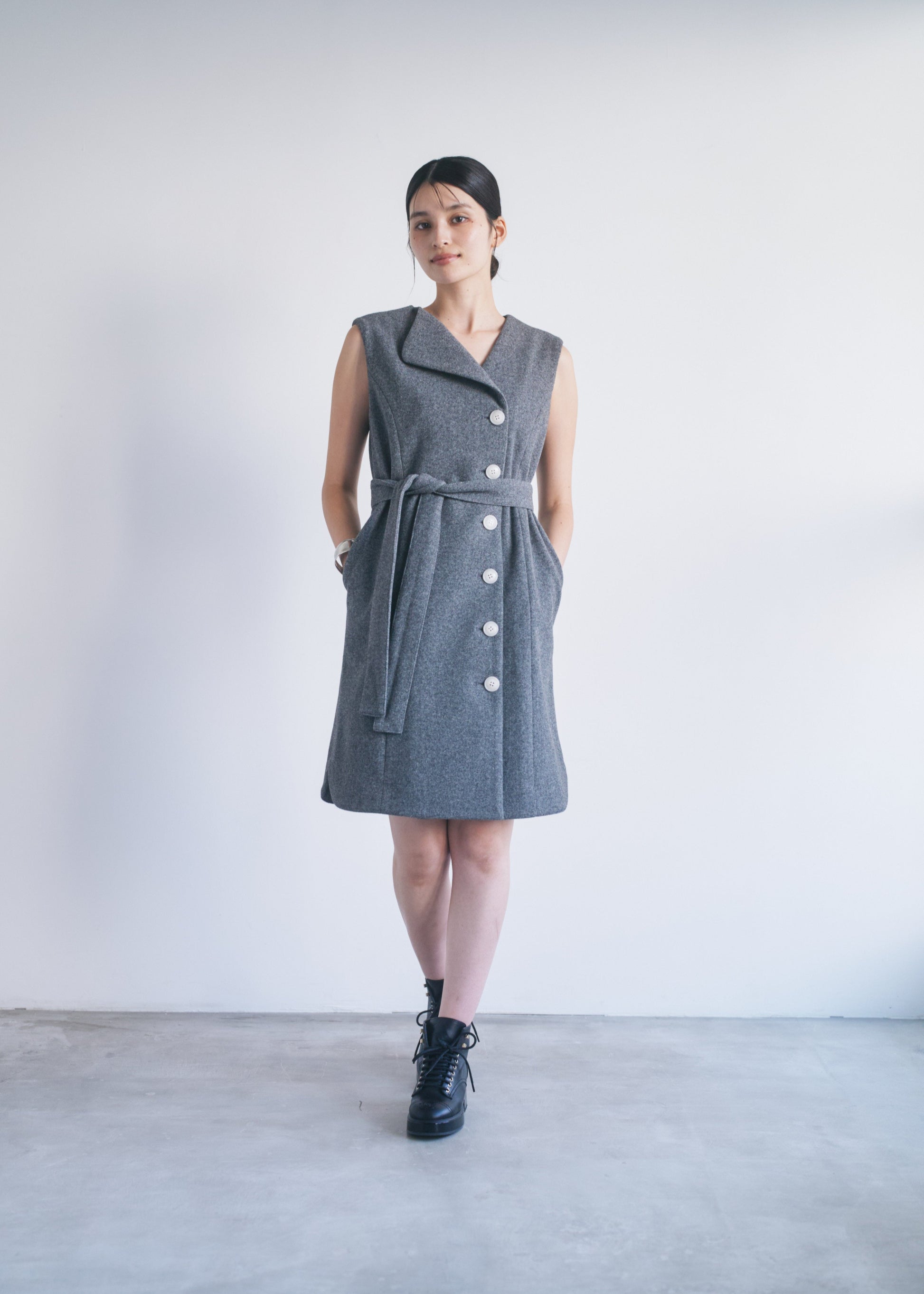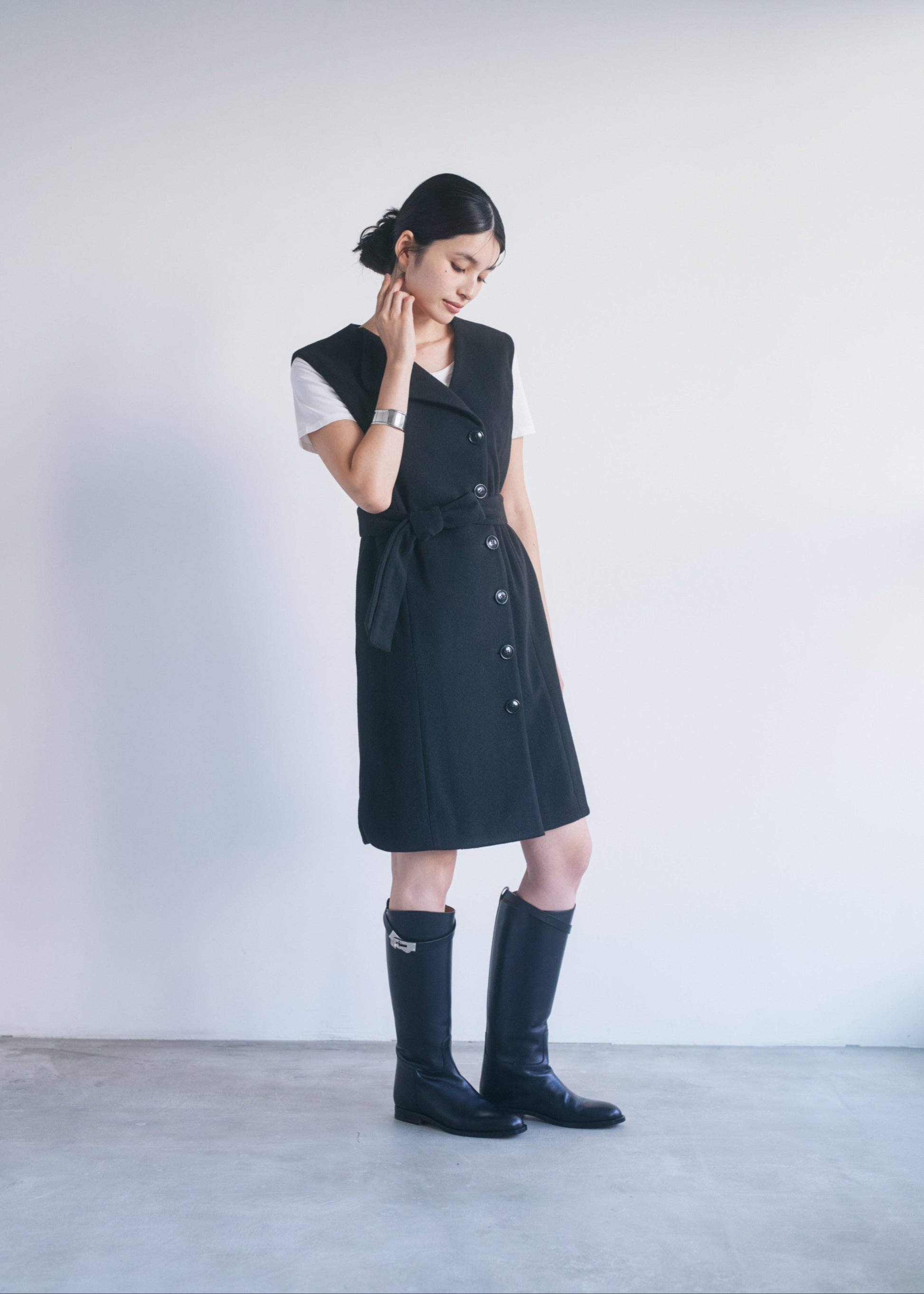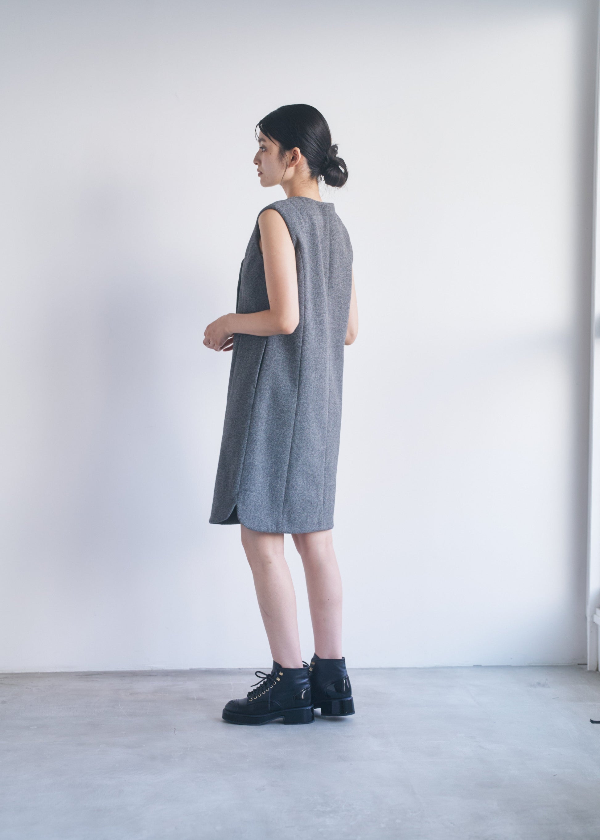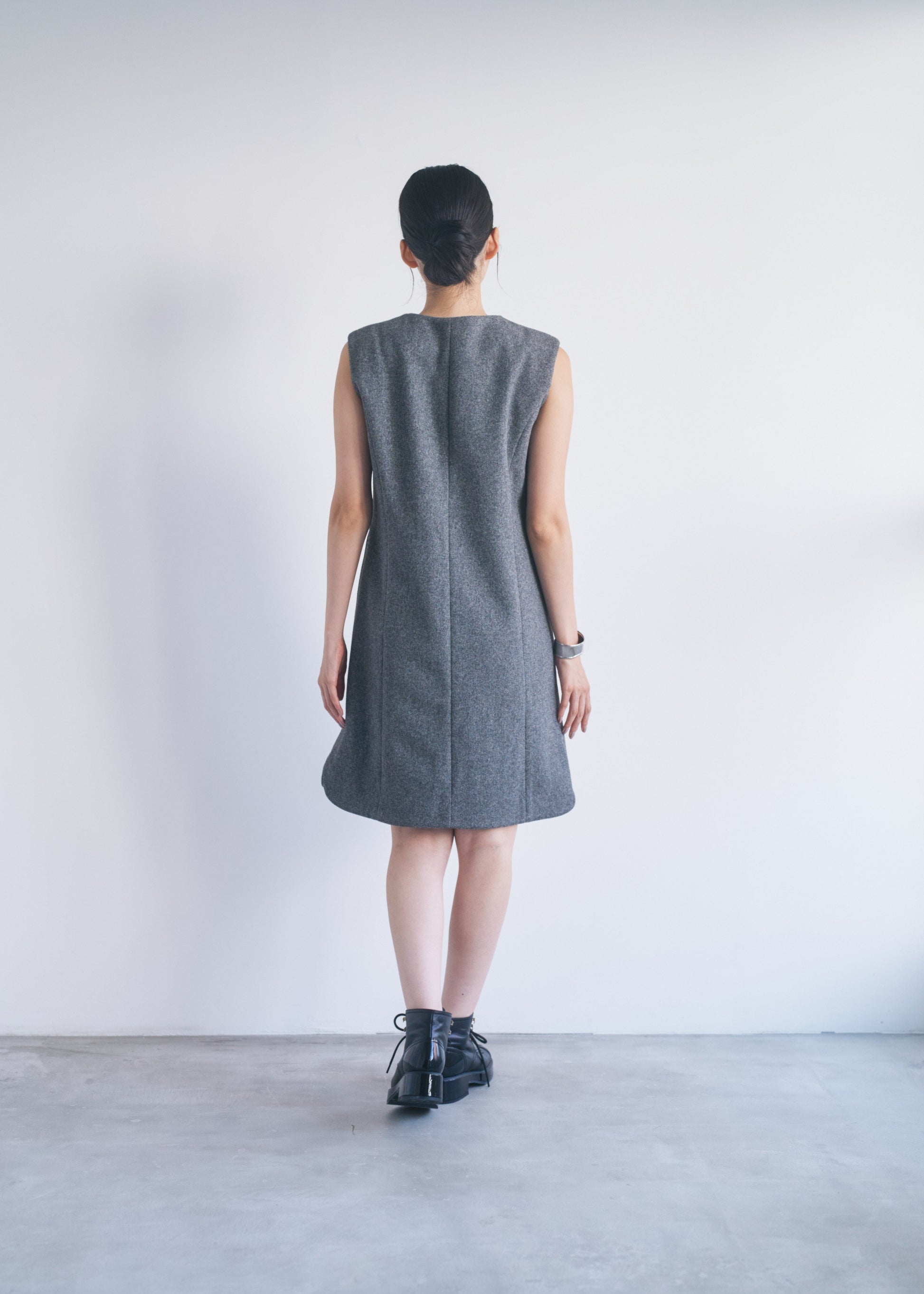 適度なハリがあるので、Vネックやアシンメトリーのシルエットがくっきり出やすいです。スカート部分も広がりすぎず、構築的なラインをキープできます。