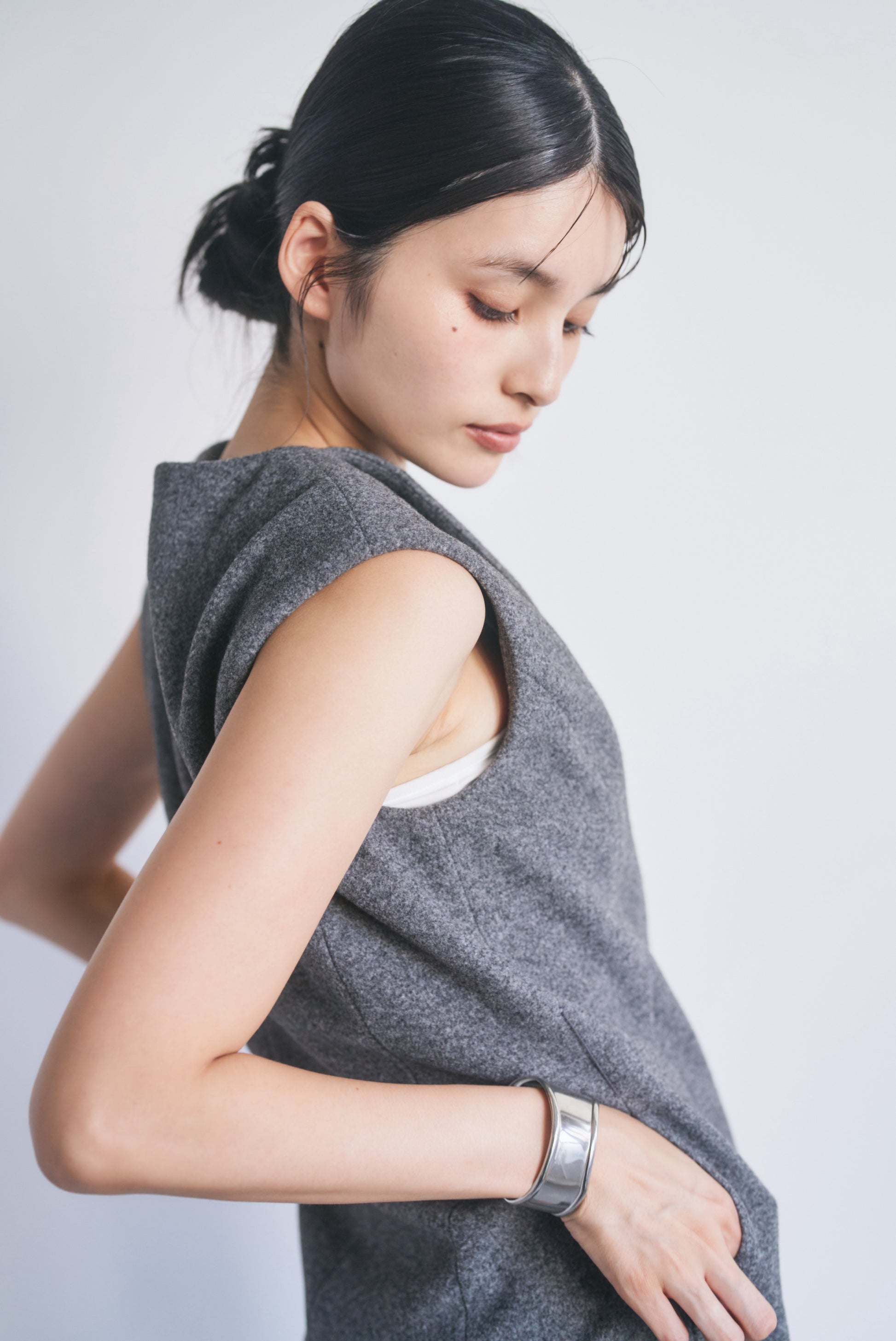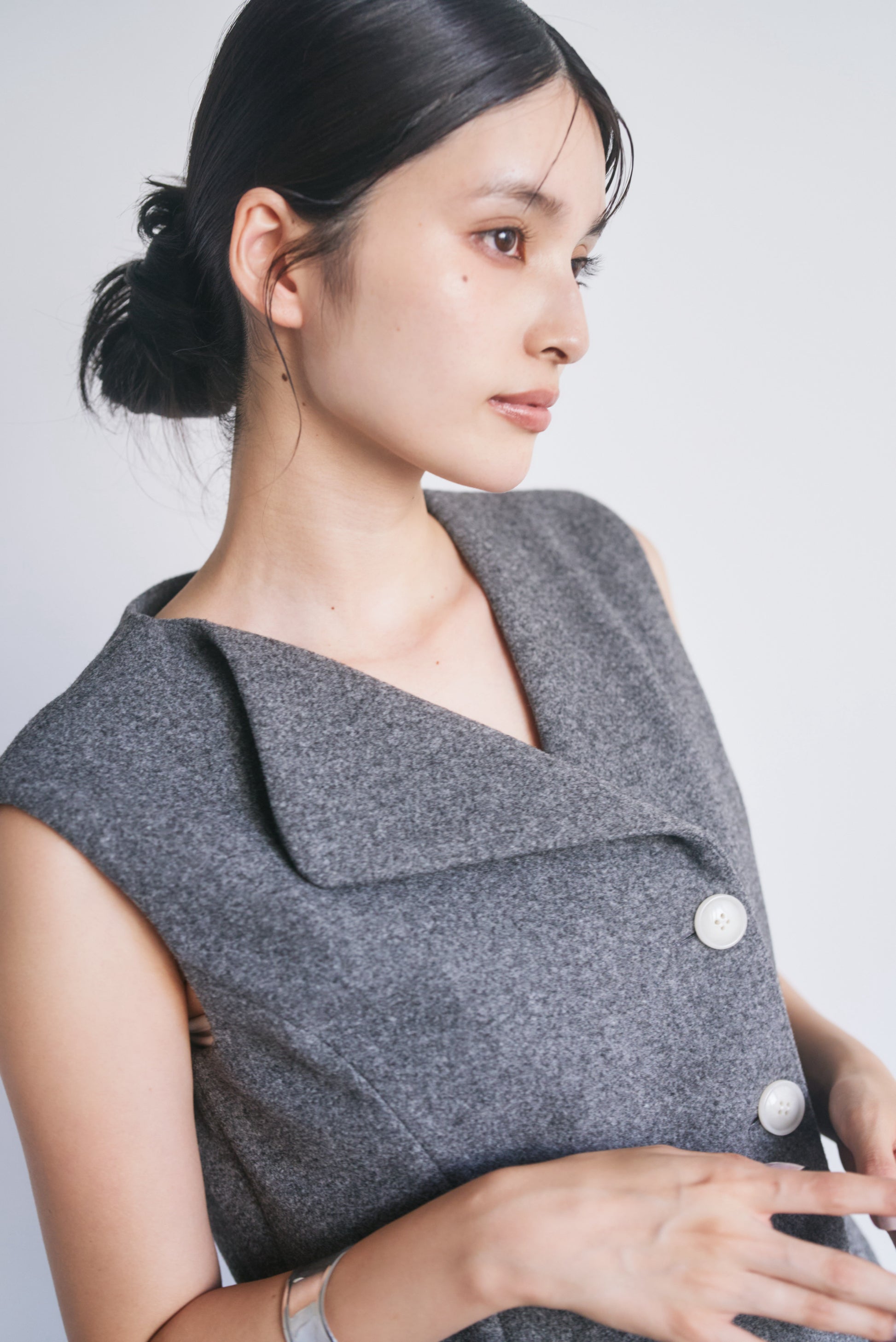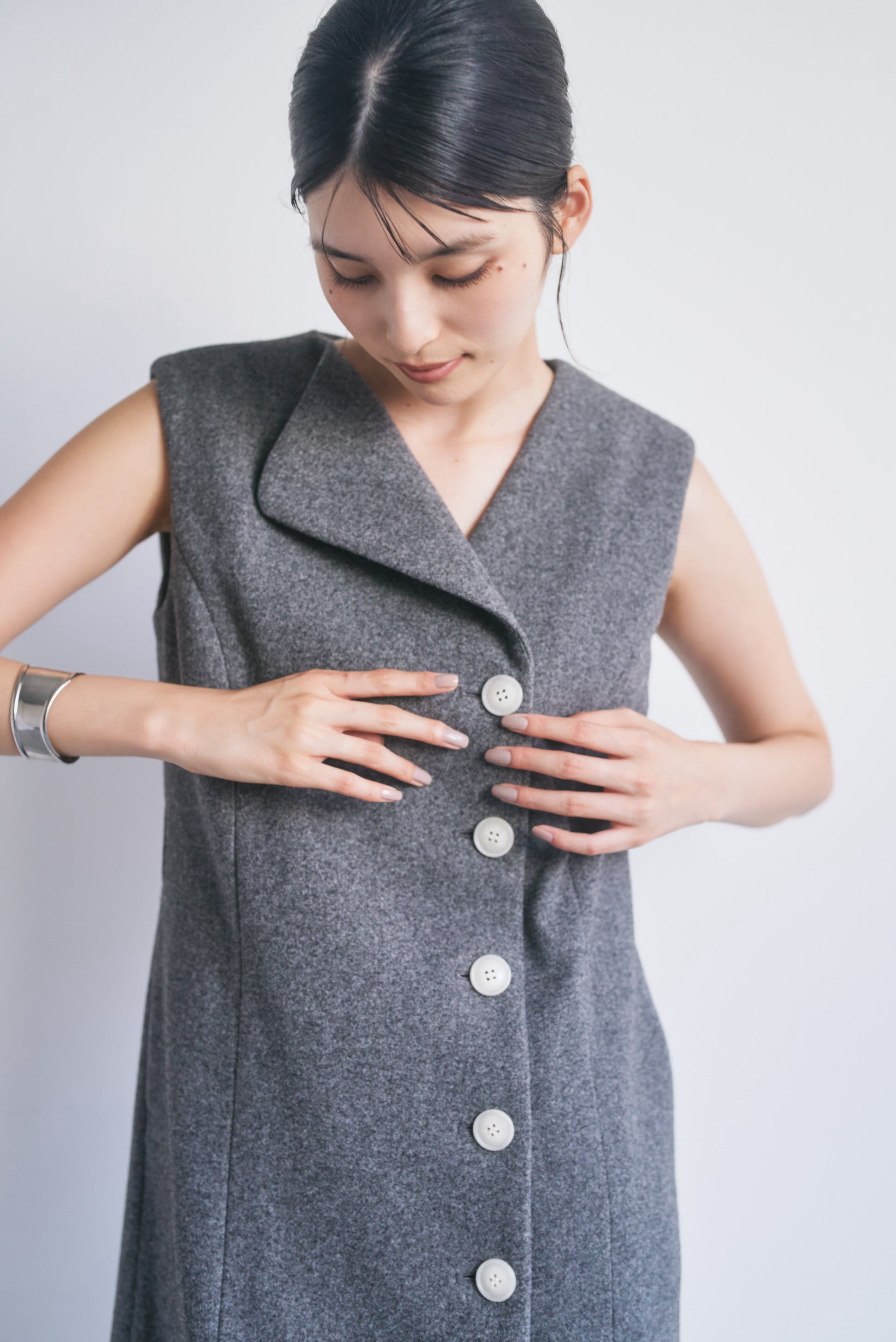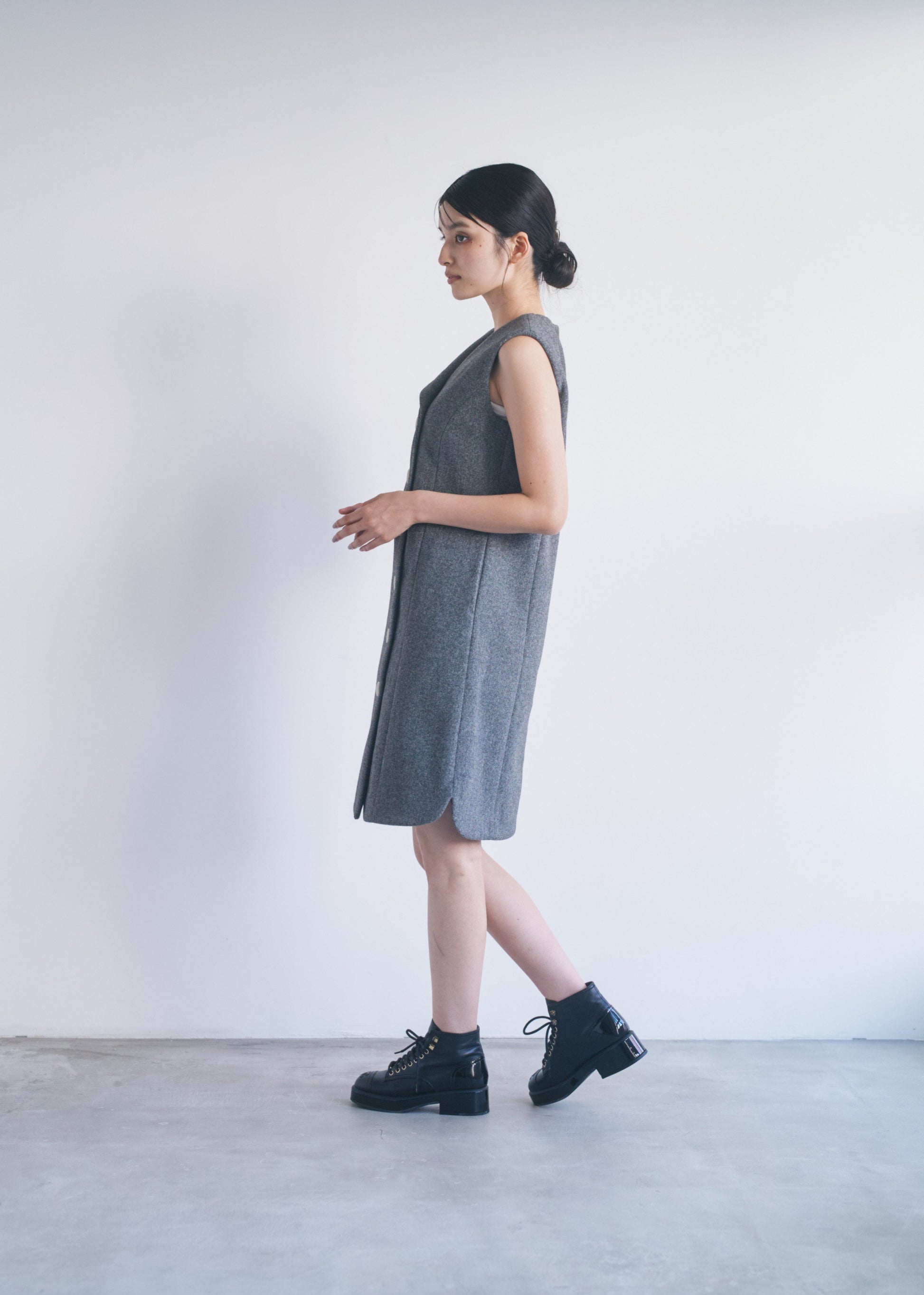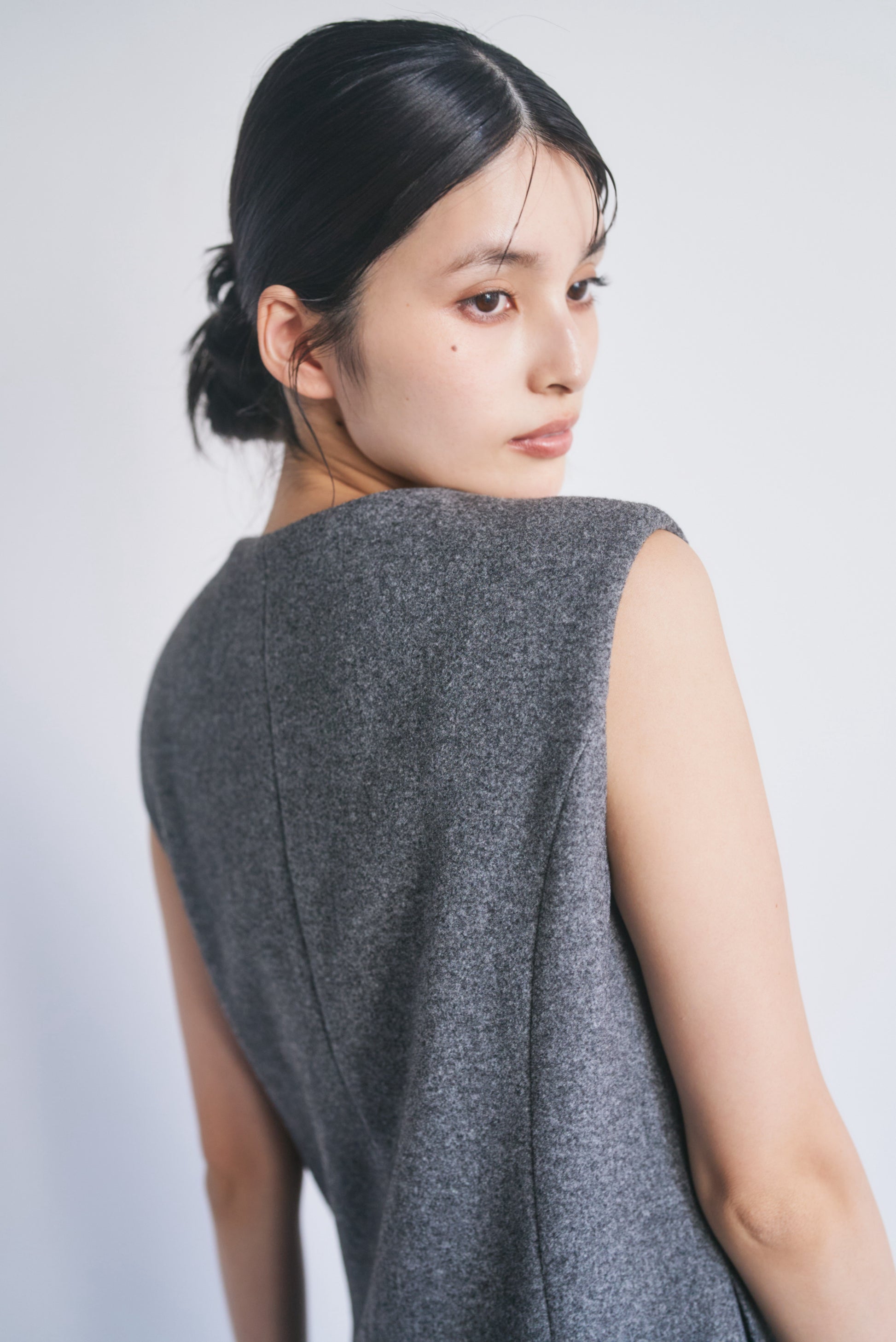 適度なハリがあるので、Vネックやアシンメトリーのシルエットがくっきり出やすいです。スカート部分も広がりすぎず、構築的なラインをキープできます。