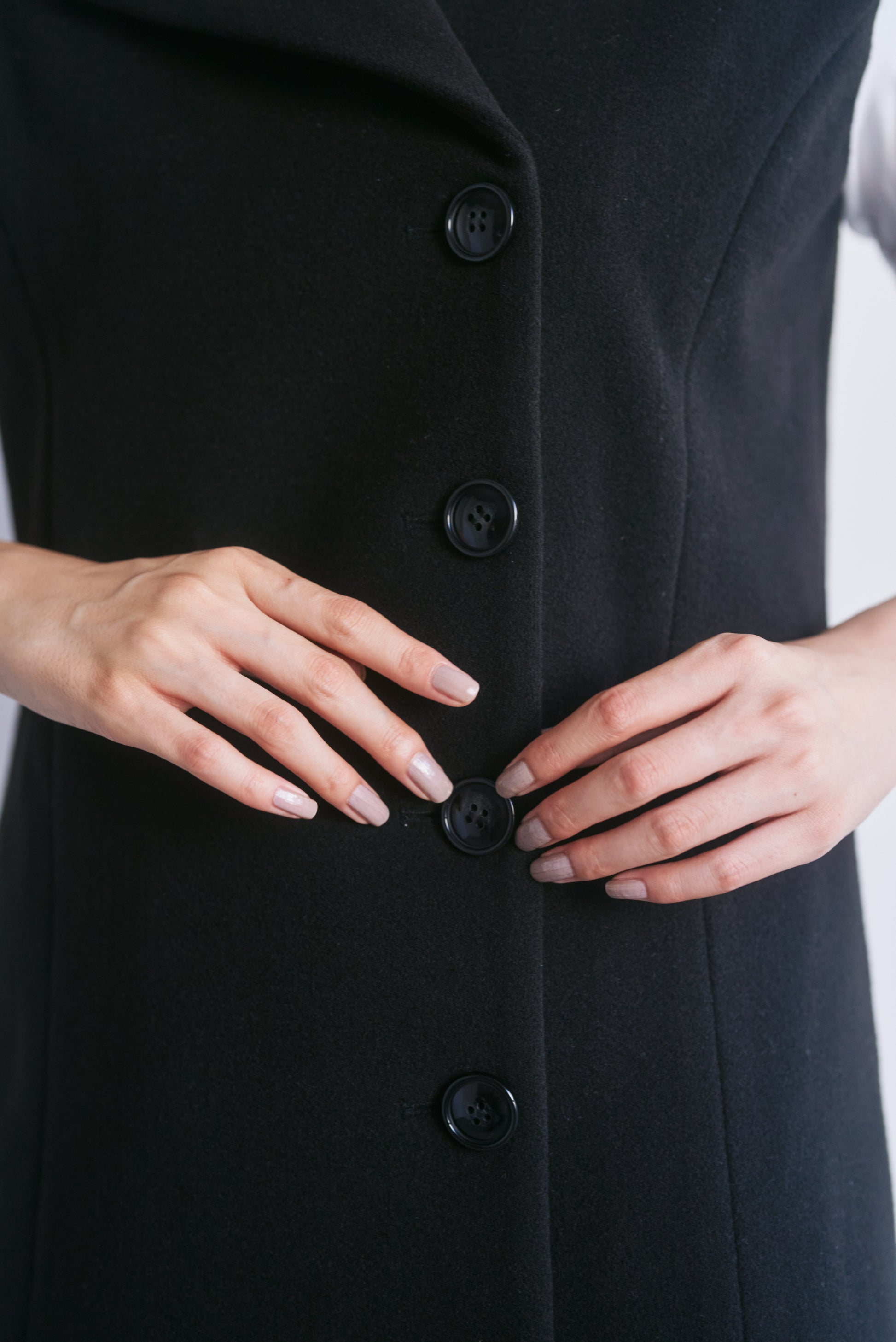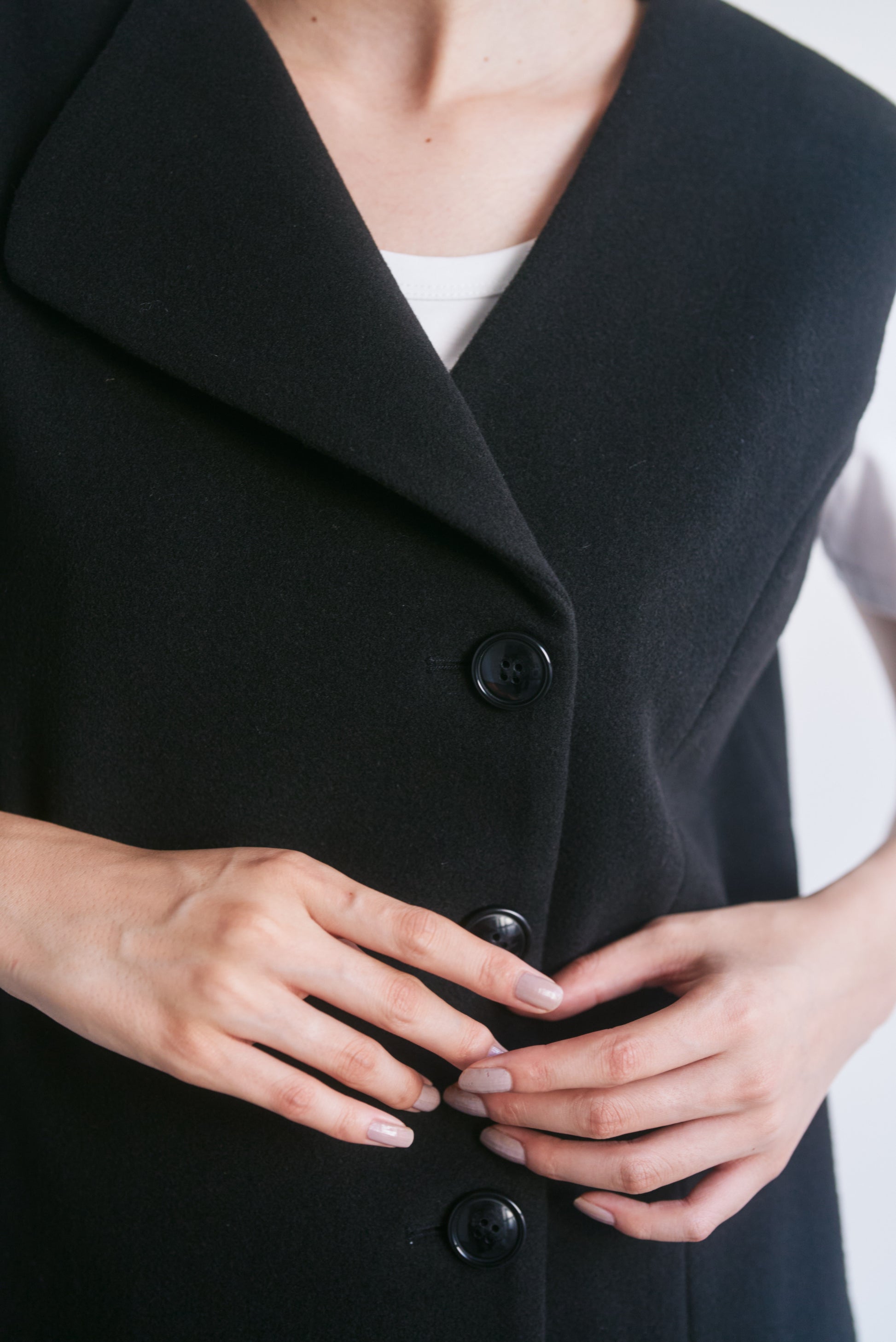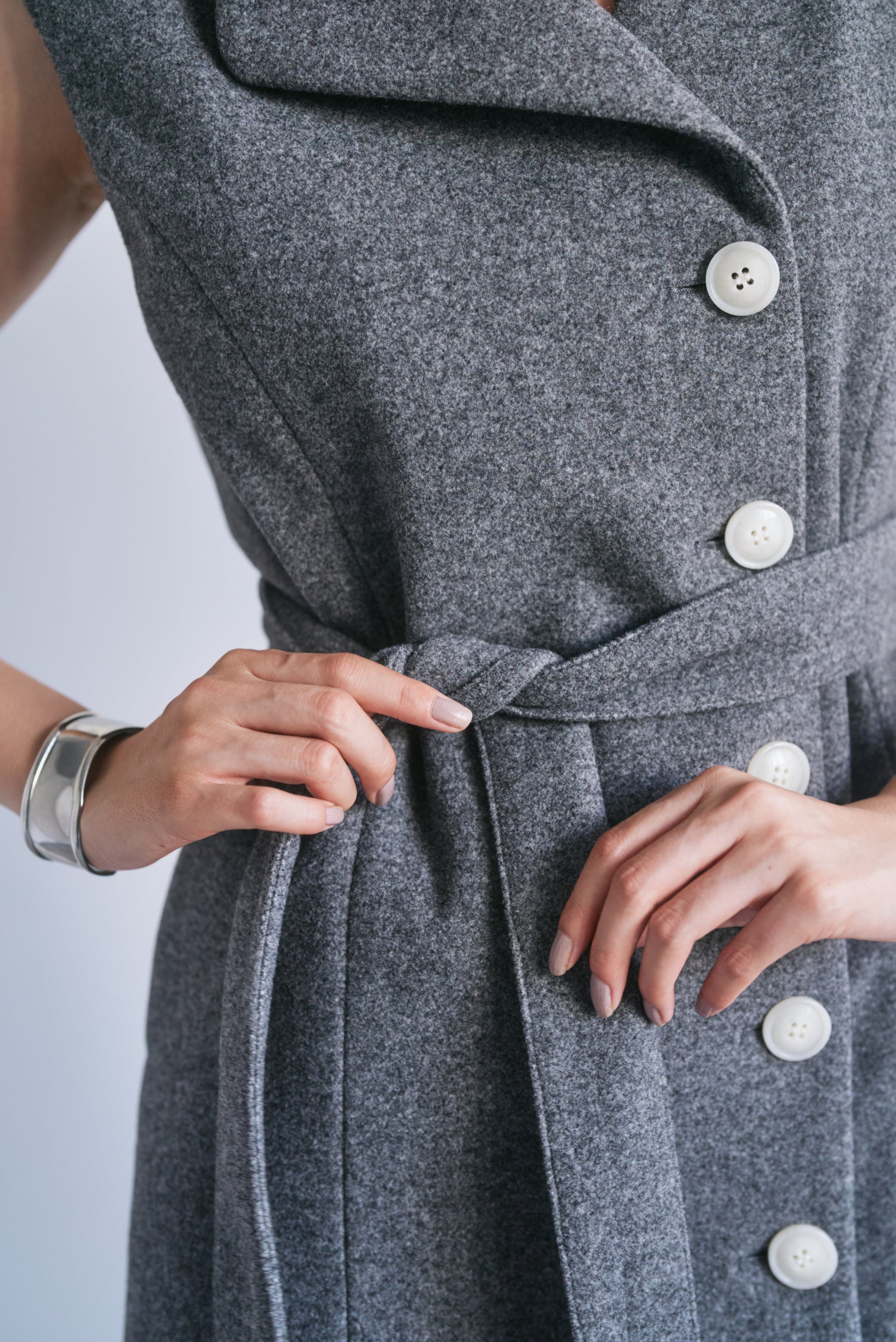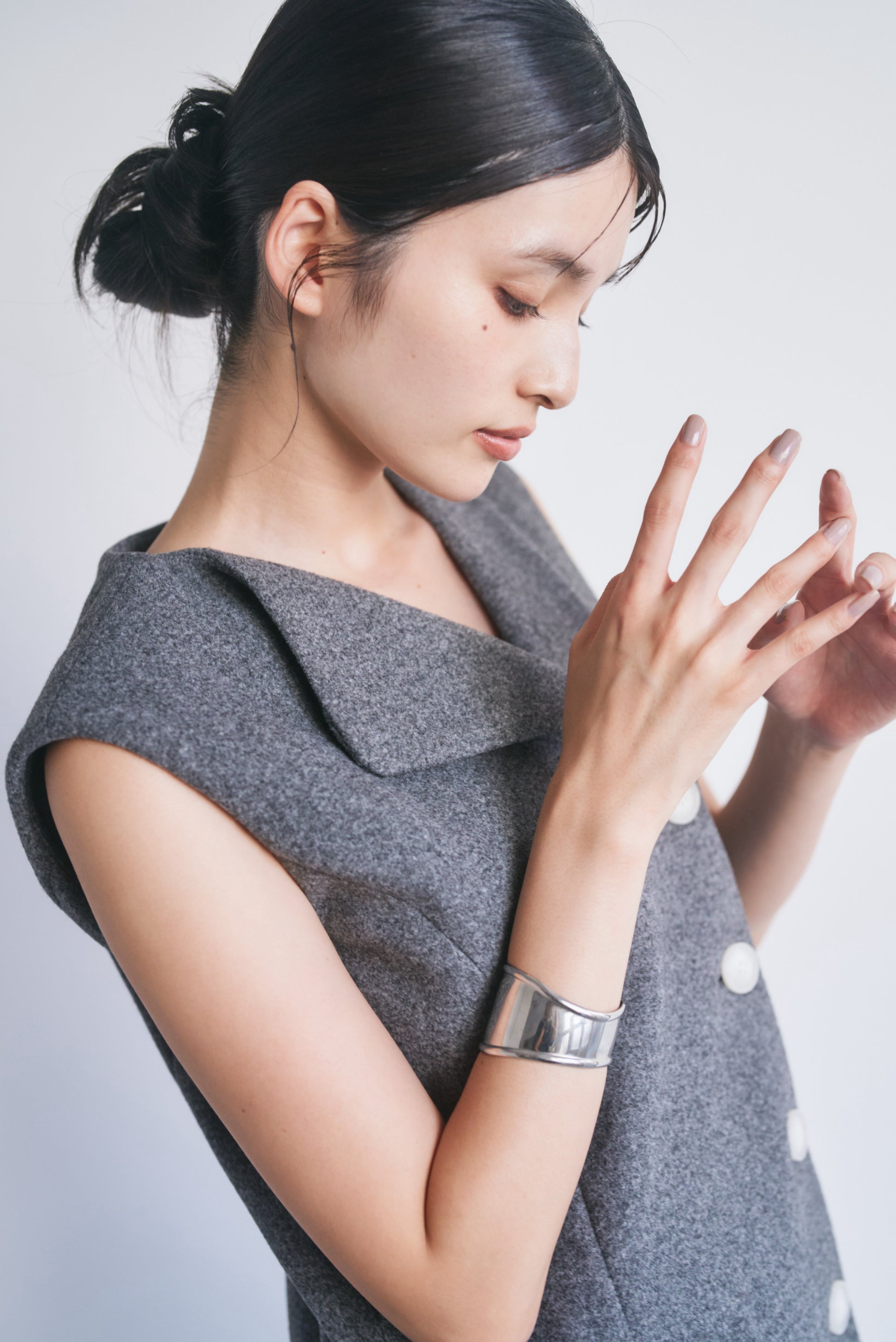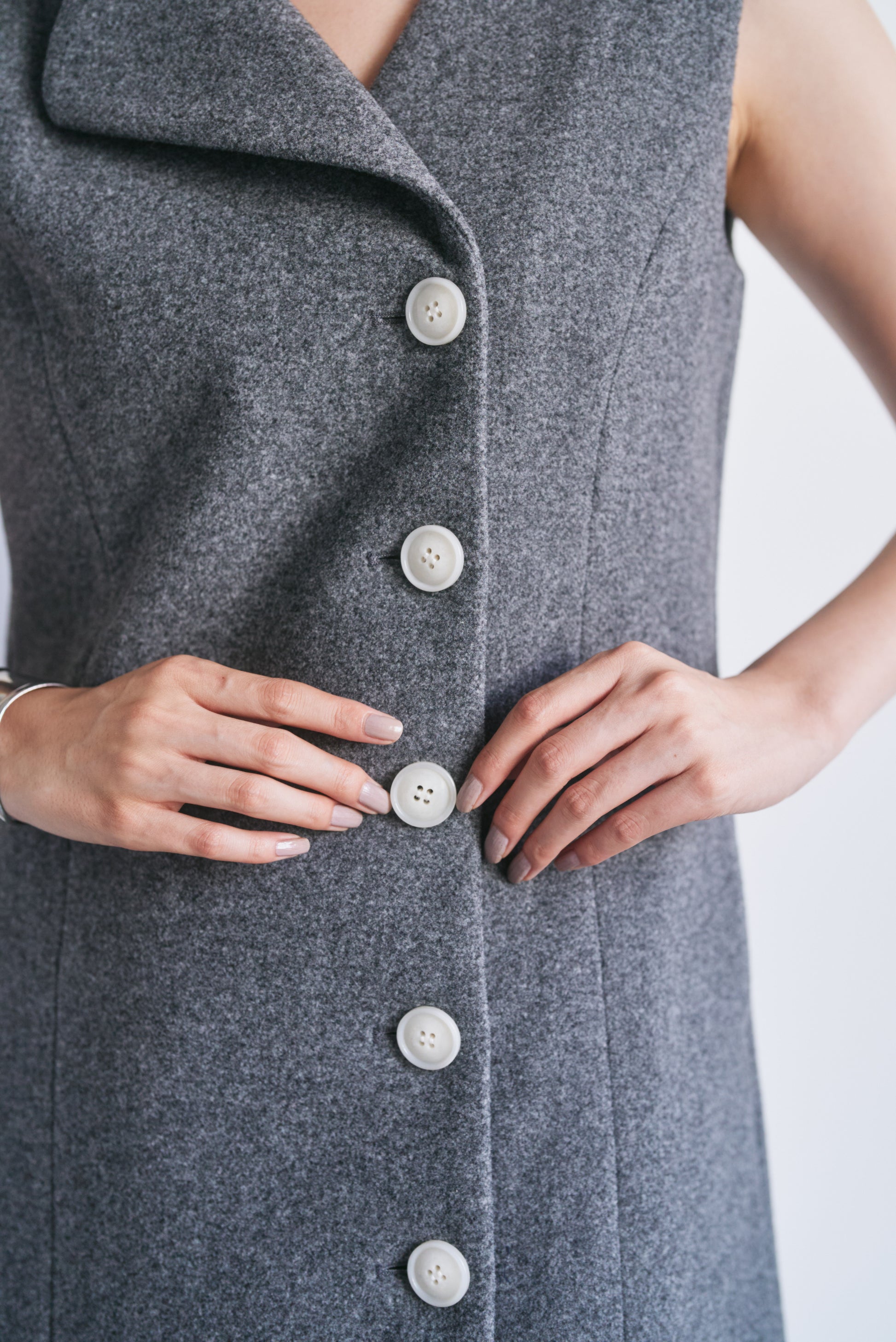 適度なハリがあるので、Vネックやアシンメトリーのシルエットがくっきり出やすいです。スカート部分も広がりすぎず、構築的なラインをキープできます。