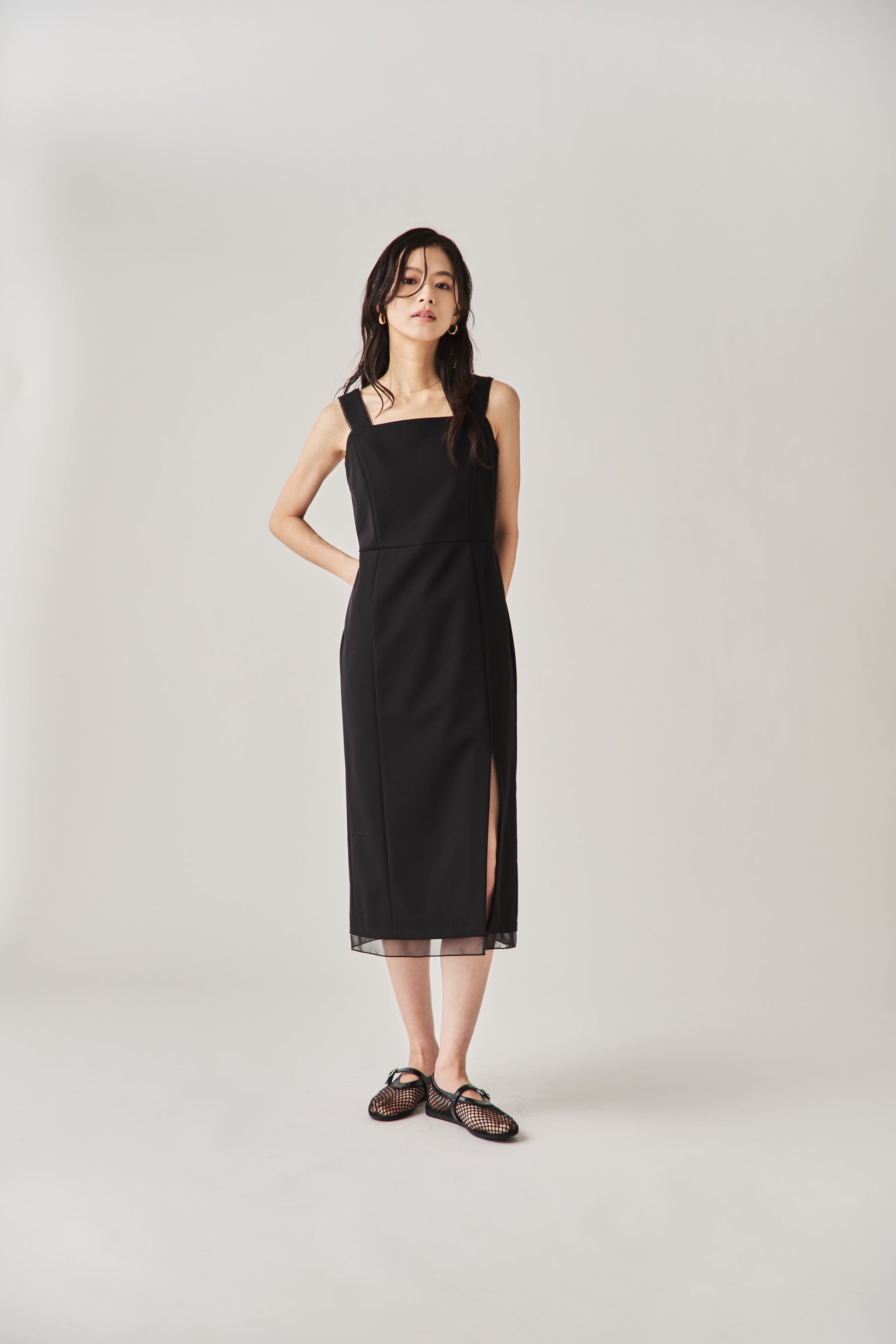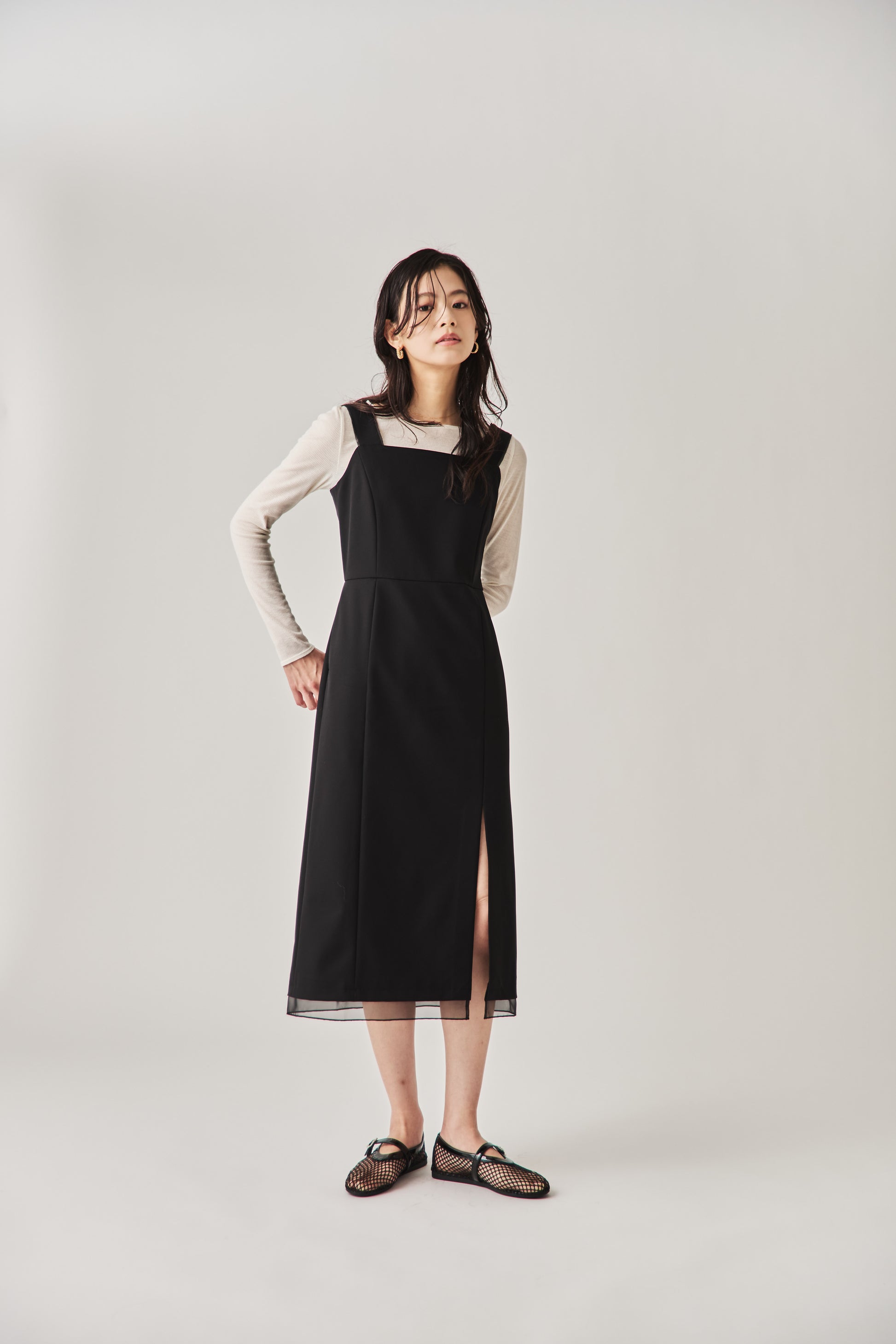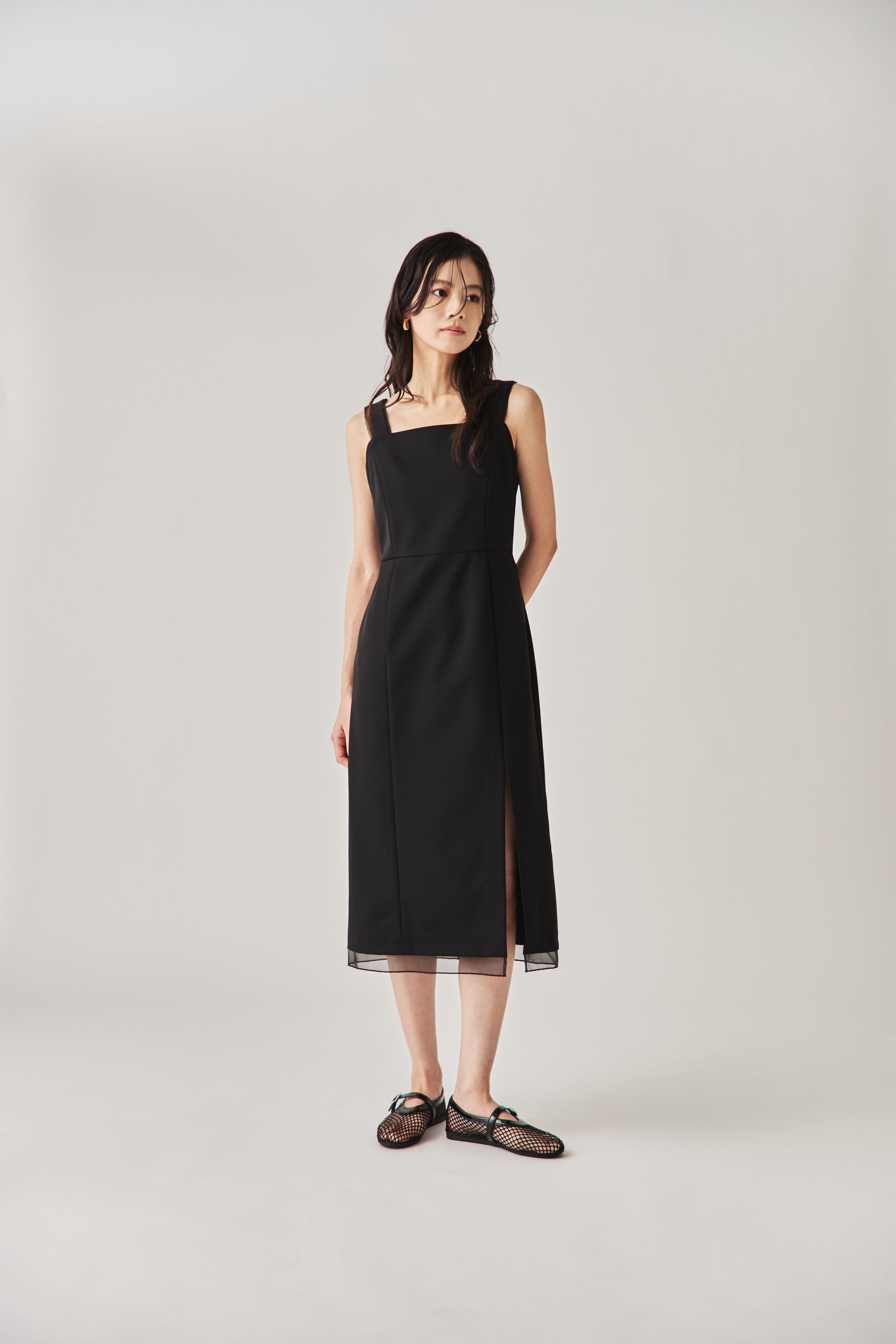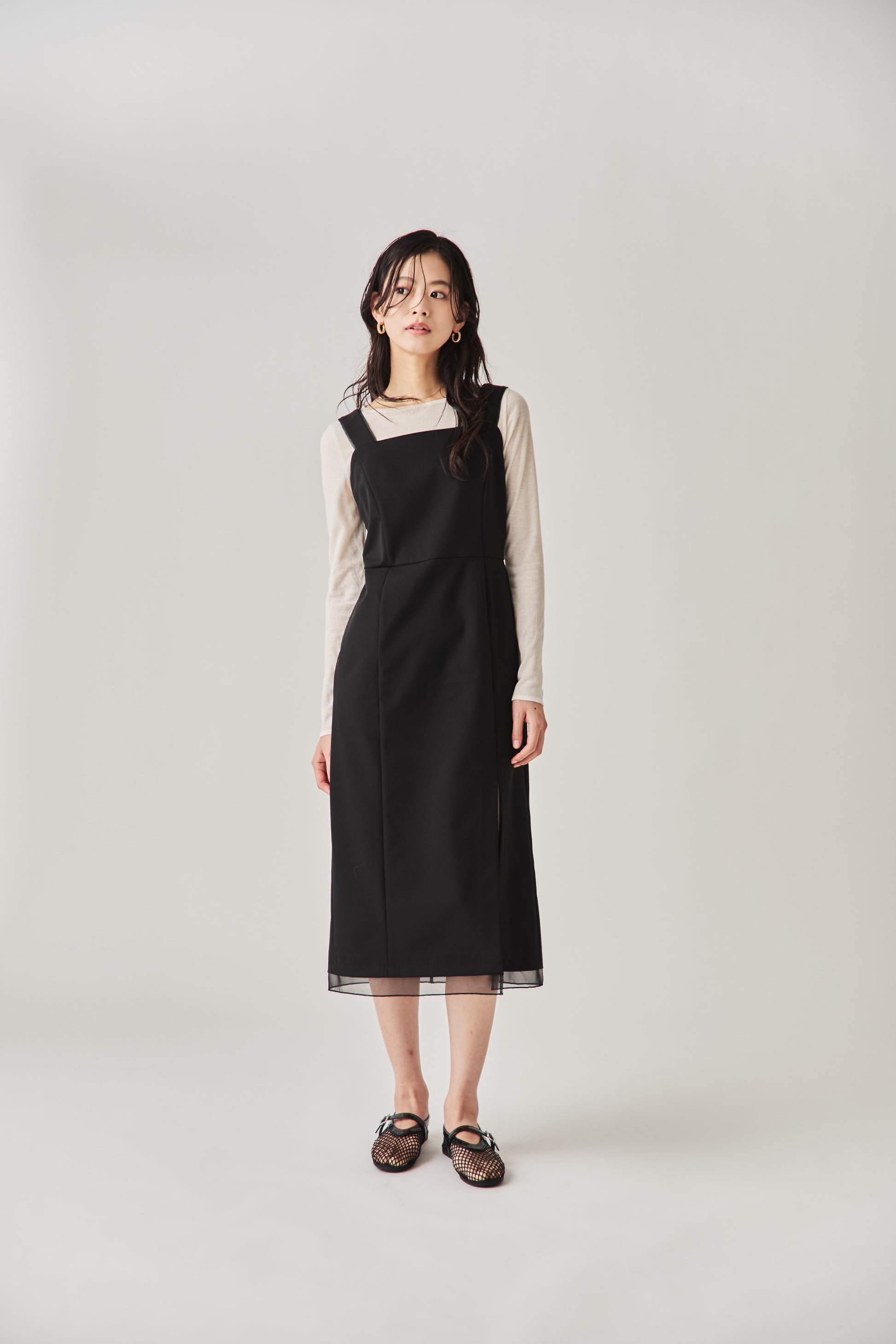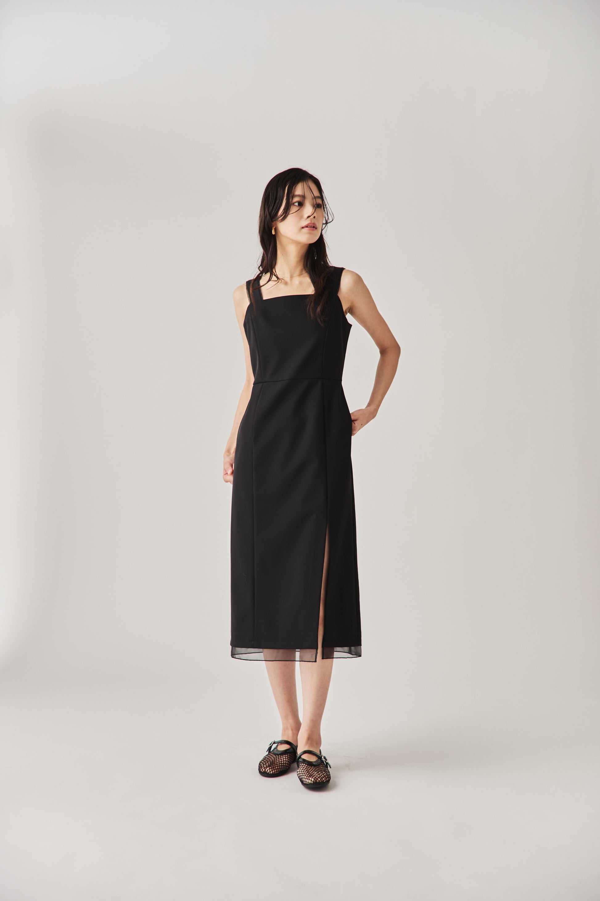 シャープなスクエアネックと、裾から覗く繊細なシアー素材の切り替わりが目を惹くジャンパードレス。 ミニマルなシルエットの中に、サイドスリットや背面のギャザーなど、360度どこから見ても美しいこだわりを詰め込みました。 裾部分に透け感のある素材を使用することで 足元に抜け感を演出し、ブラック特有の重さを軽減します。  背面にはゴムシャーリングを施し、程よいフィット感と動きやすさを両立。デコルテを美しく見せる直線的なラインが、1枚でも、インナーを重ねてもスッキリとした印象に。