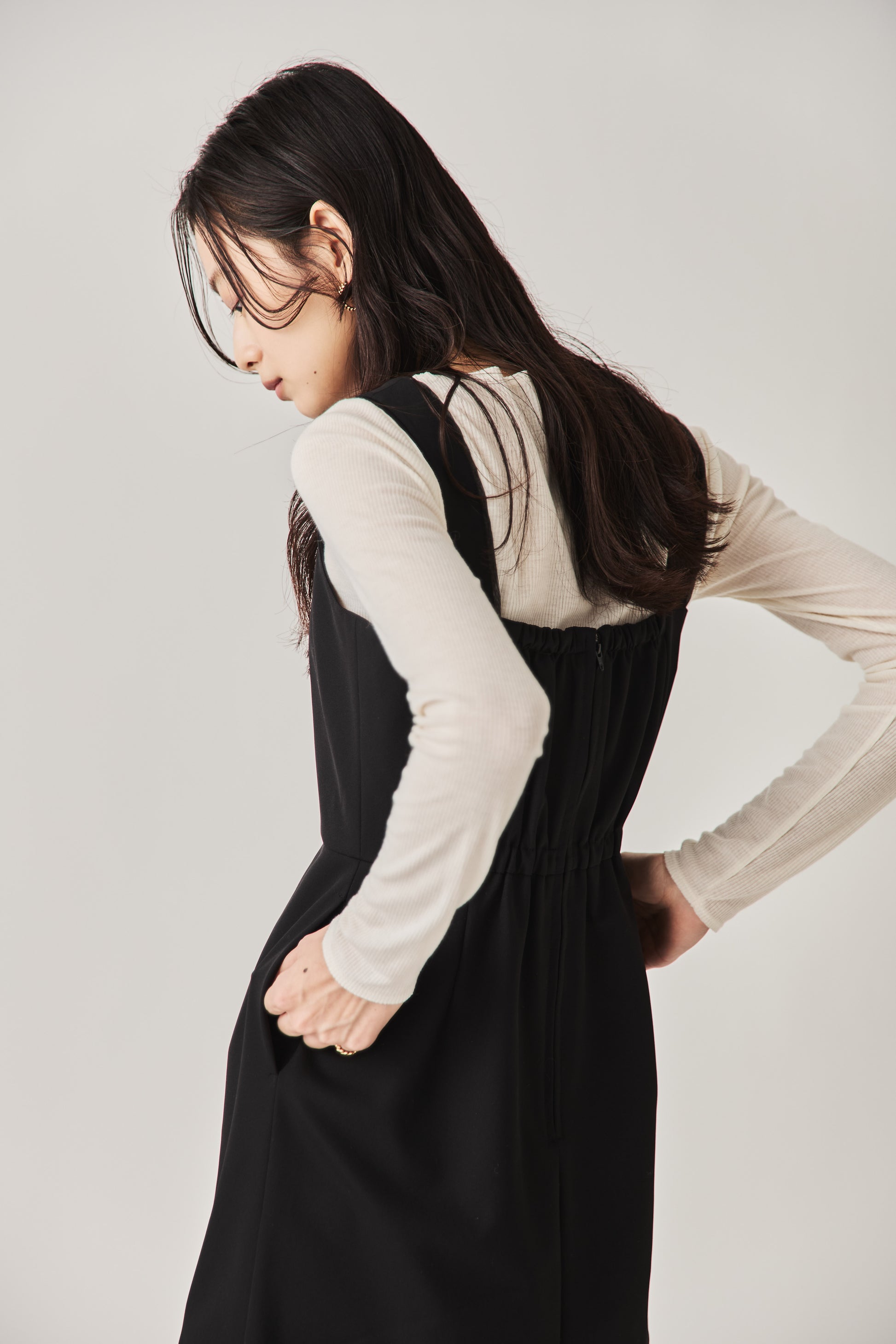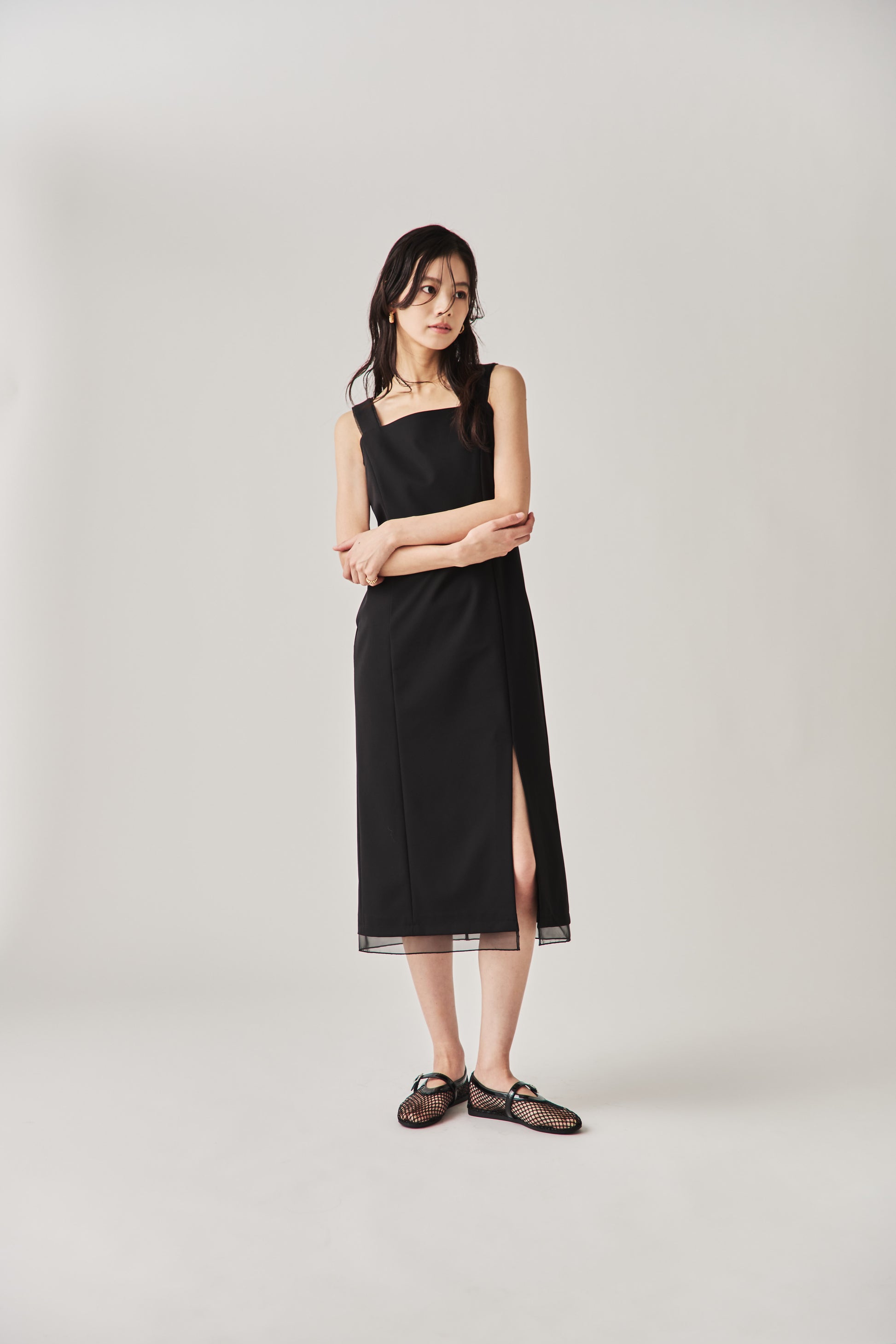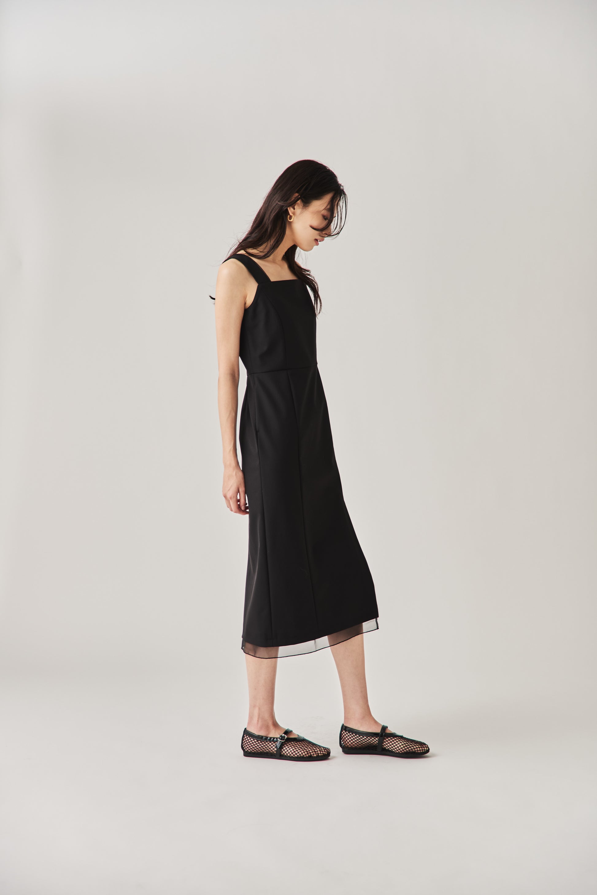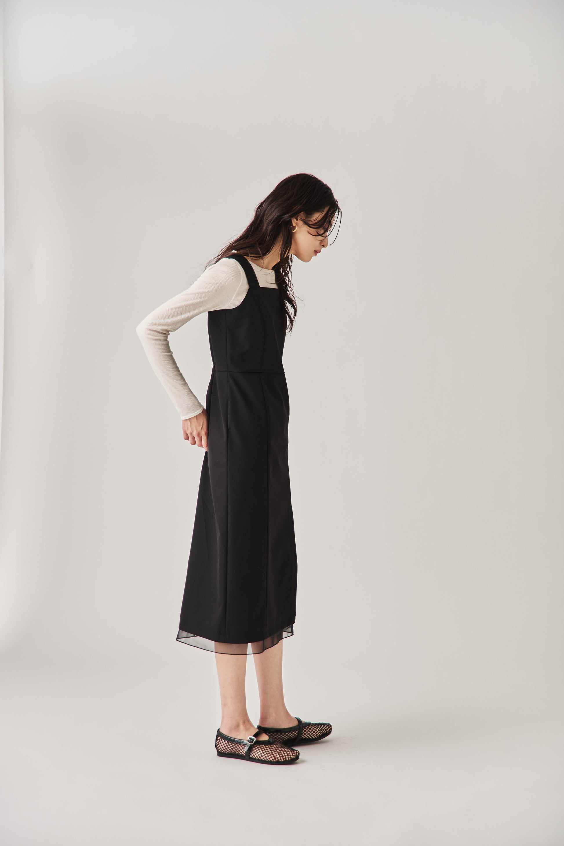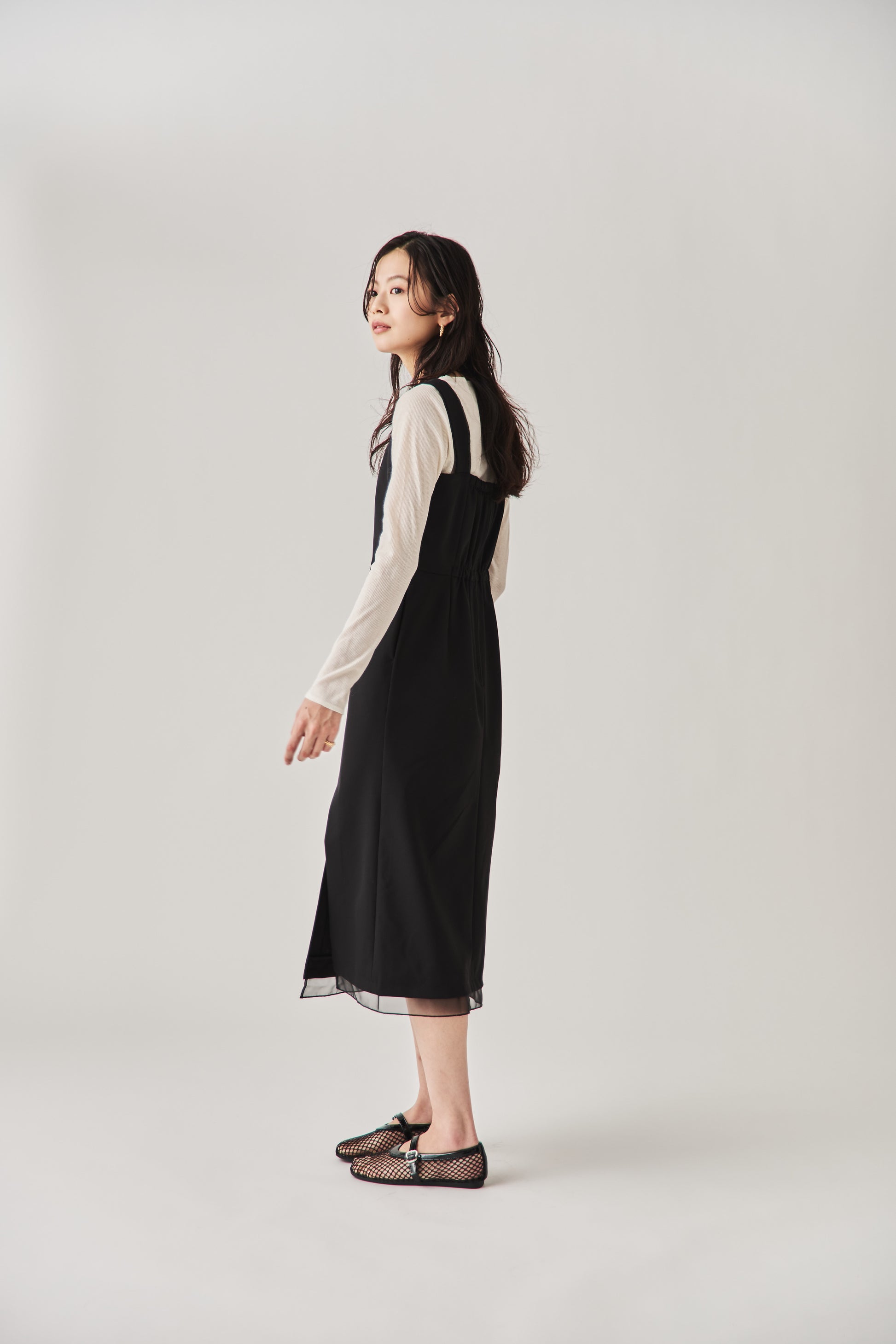 シャープなスクエアネックと、裾から覗く繊細なシアー素材の切り替わりが目を惹くジャンパードレス。 ミニマルなシルエットの中に、サイドスリットや背面のギャザーなど、360度どこから見ても美しいこだわりを詰め込みました。 裾部分に透け感のある素材を使用することで 足元に抜け感を演出し、ブラック特有の重さを軽減します。  背面にはゴムシャーリングを施し、程よいフィット感と動きやすさを両立。デコルテを美しく見せる直線的なラインが、1枚でも、インナーを重ねてもスッキリとした印象に。