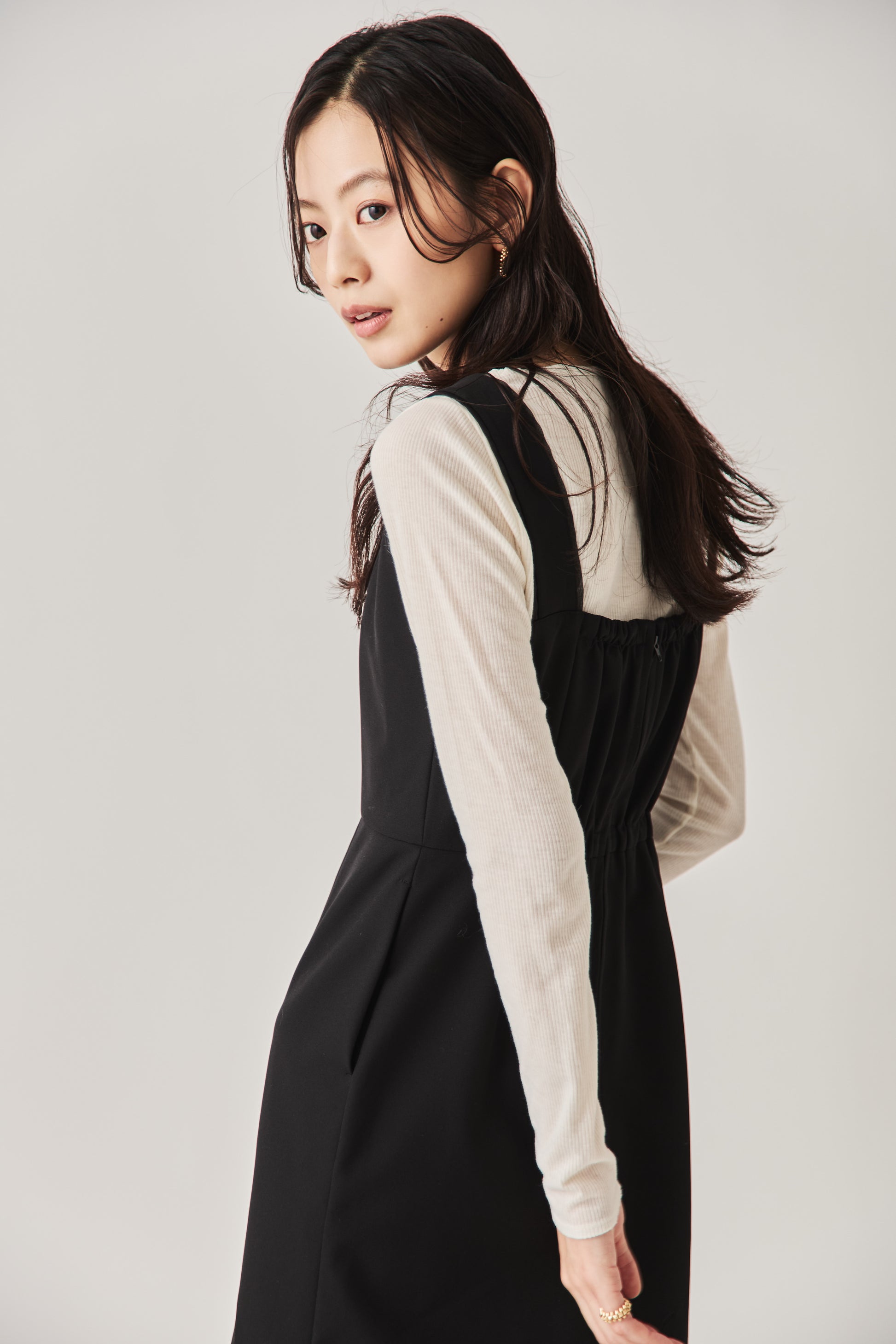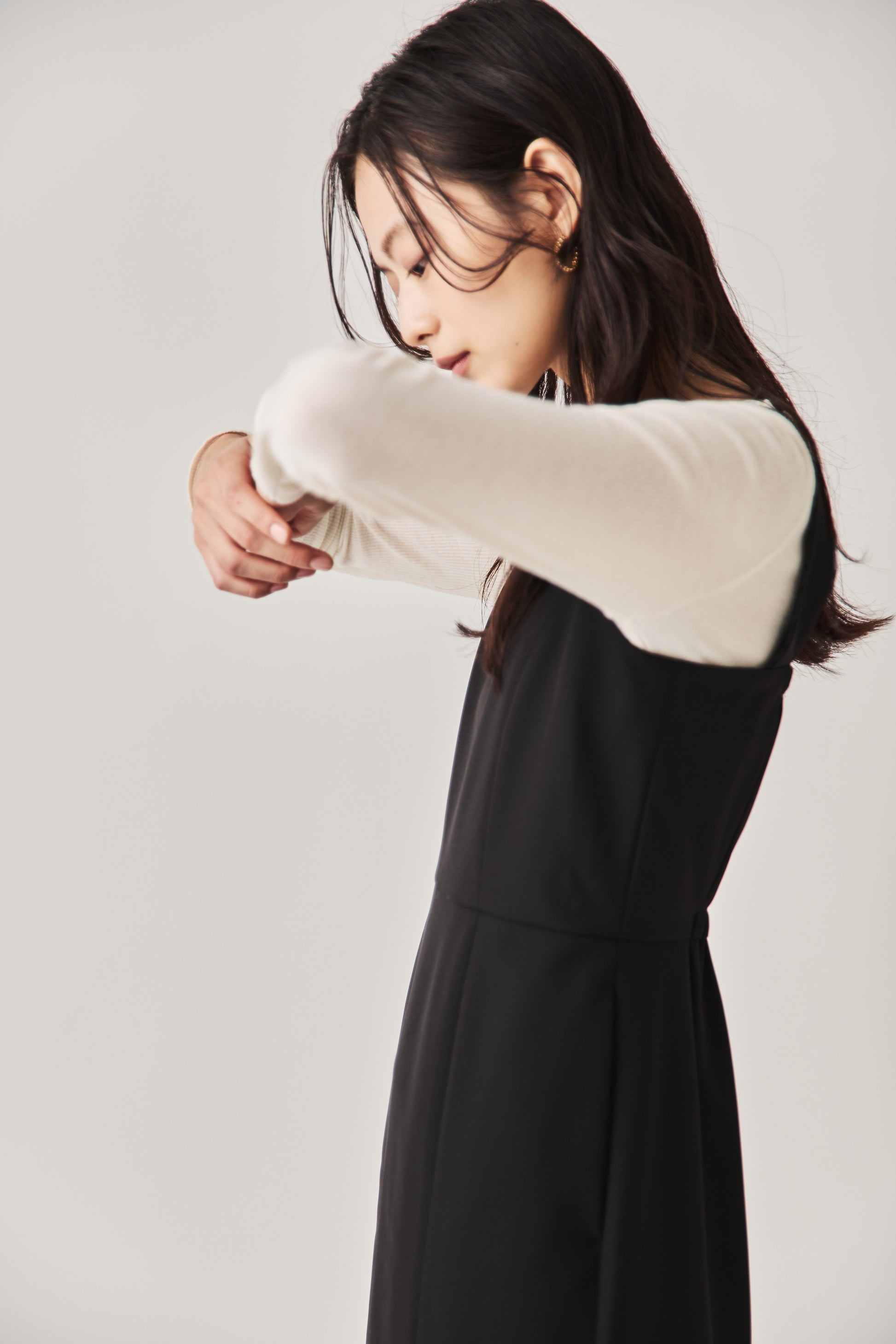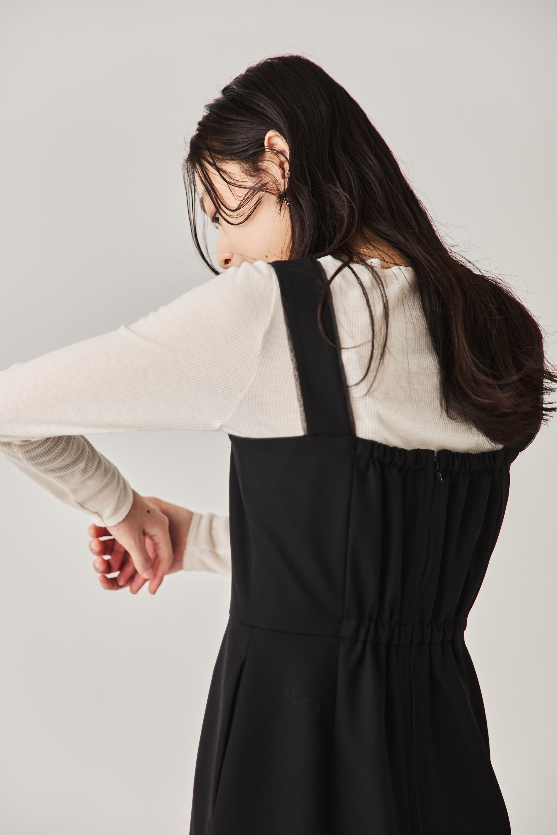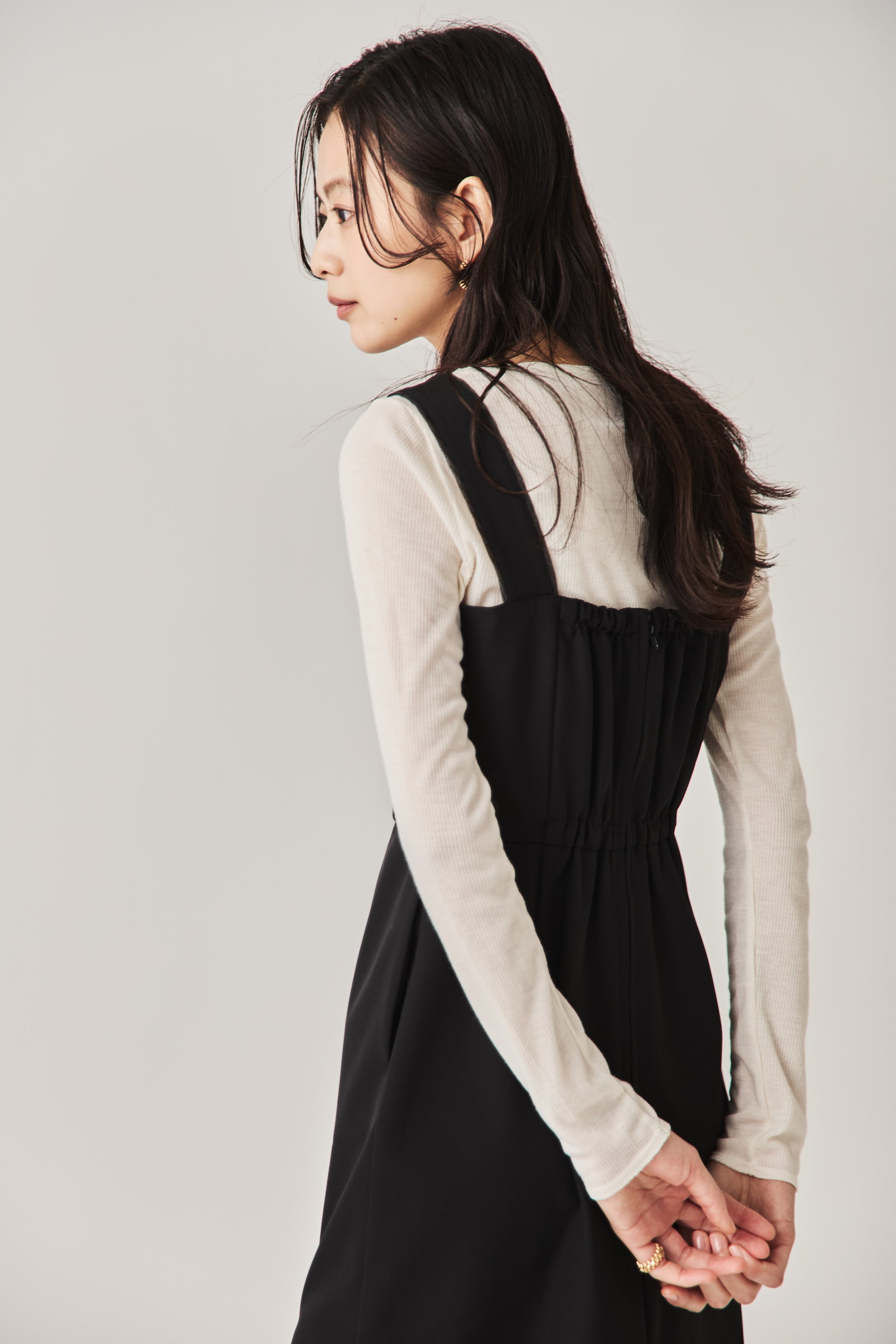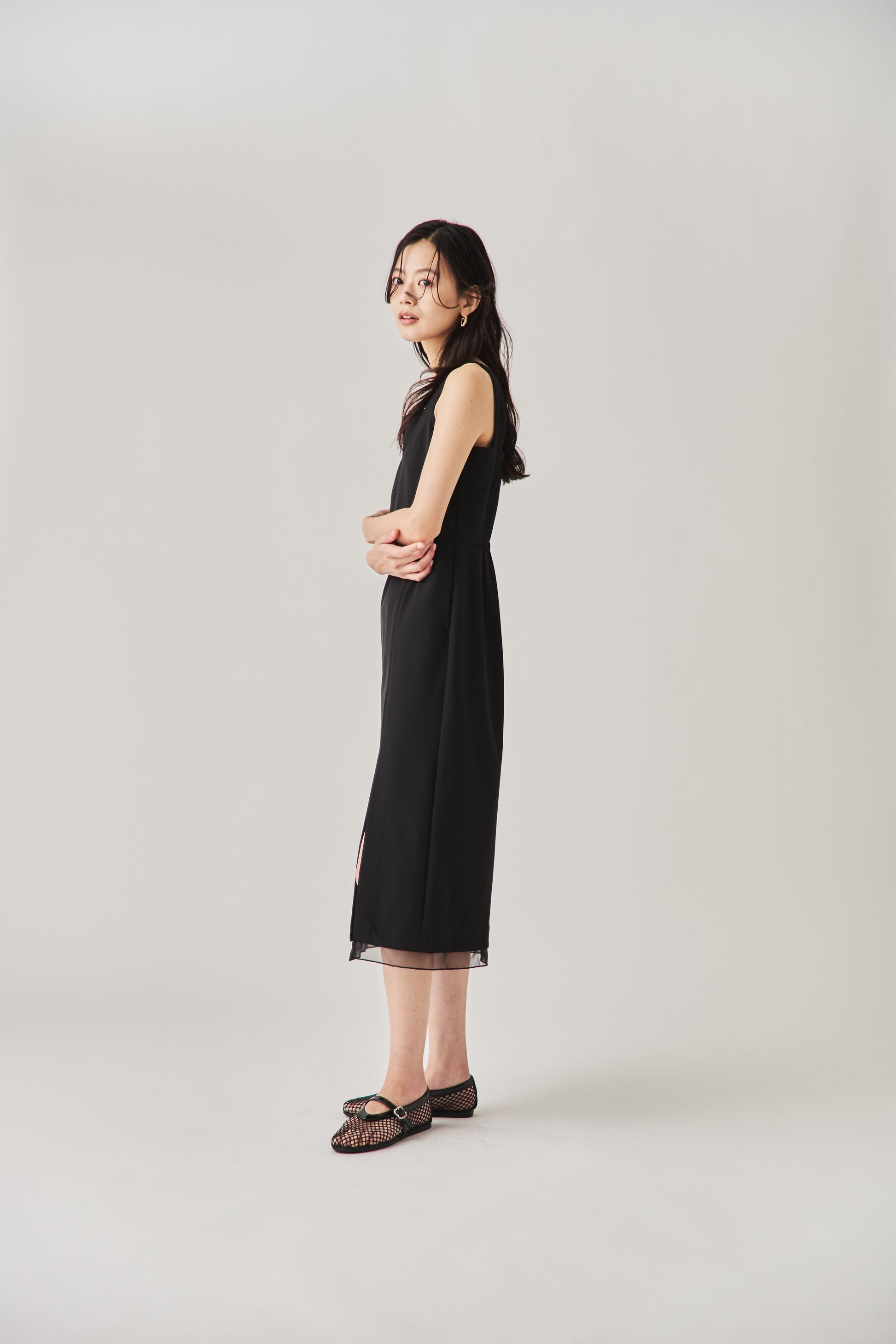 シャープなスクエアネックと、裾から覗く繊細なシアー素材の切り替わりが目を惹くジャンパードレス。 ミニマルなシルエットの中に、サイドスリットや背面のギャザーなど、360度どこから見ても美しいこだわりを詰め込みました。 裾部分に透け感のある素材を使用することで 足元に抜け感を演出し、ブラック特有の重さを軽減します。  背面にはゴムシャーリングを施し、程よいフィット感と動きやすさを両立。デコルテを美しく見せる直線的なラインが、1枚でも、インナーを重ねてもスッキリとした印象に。