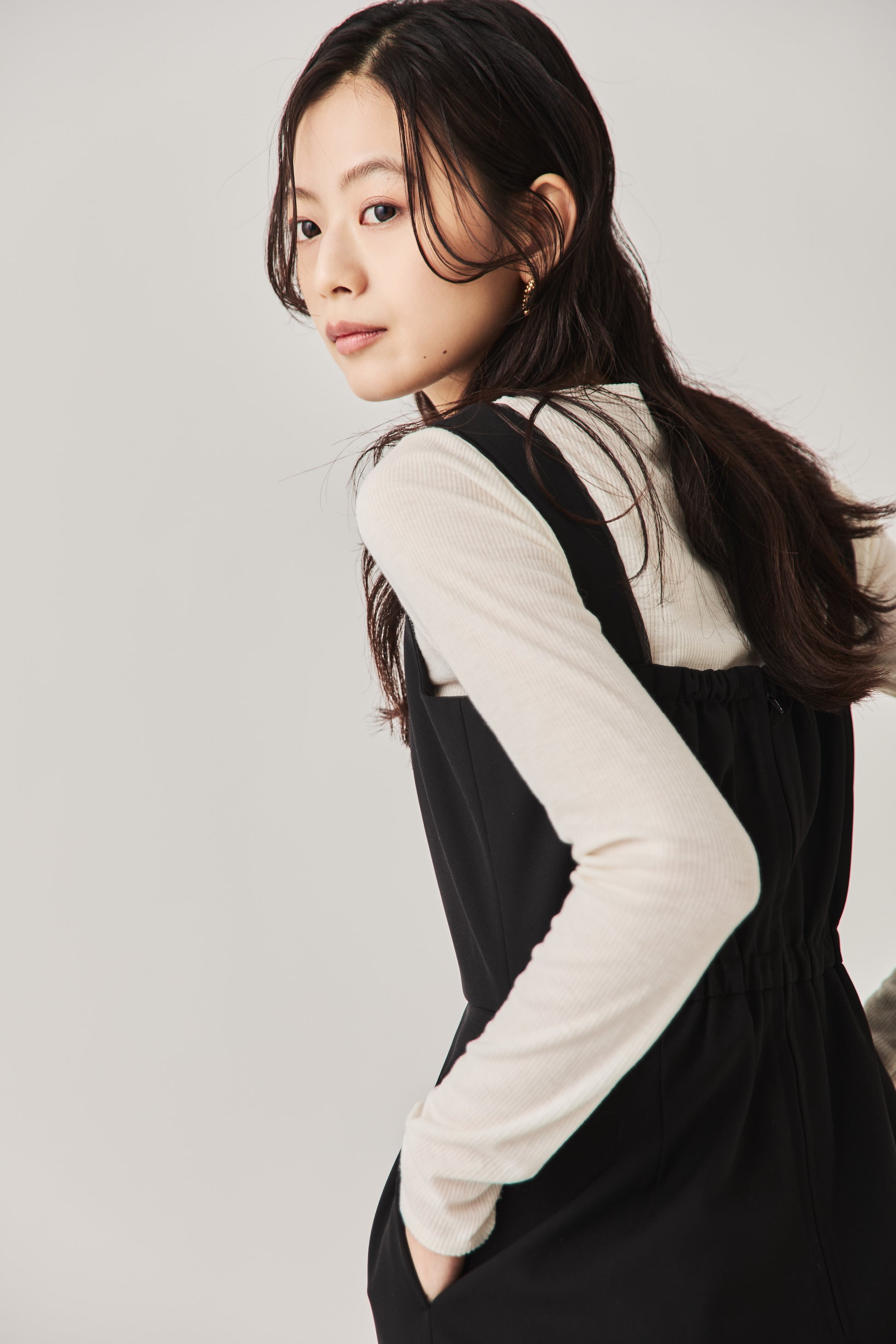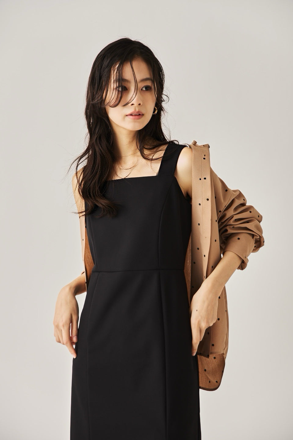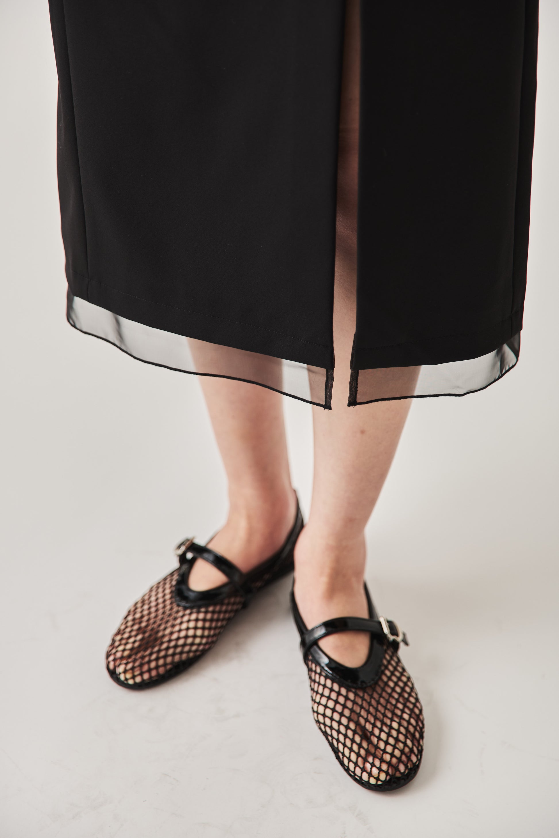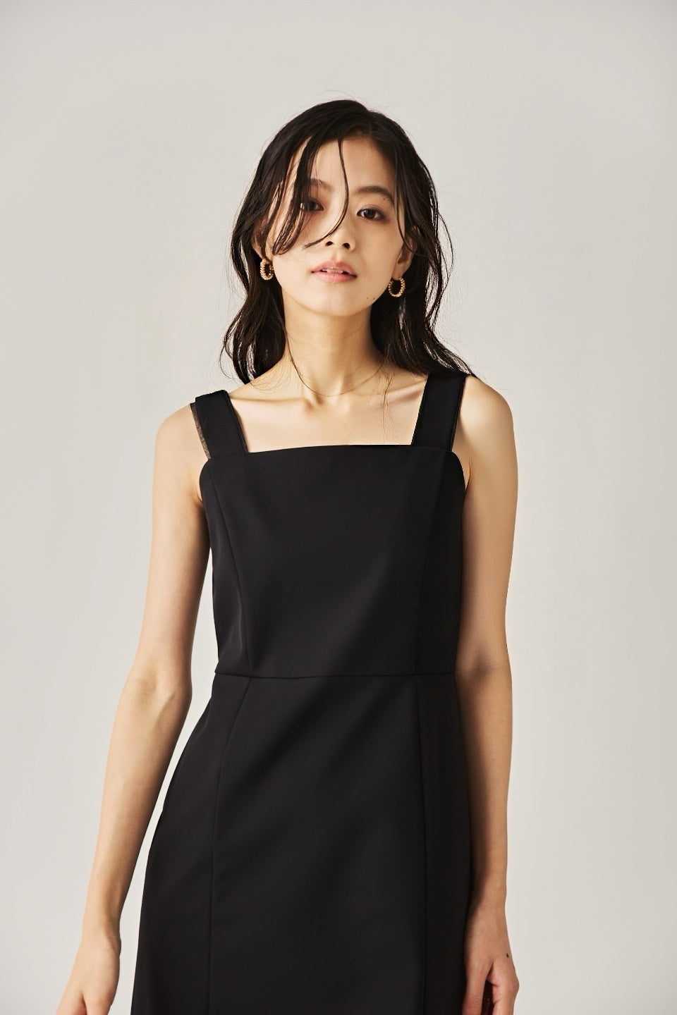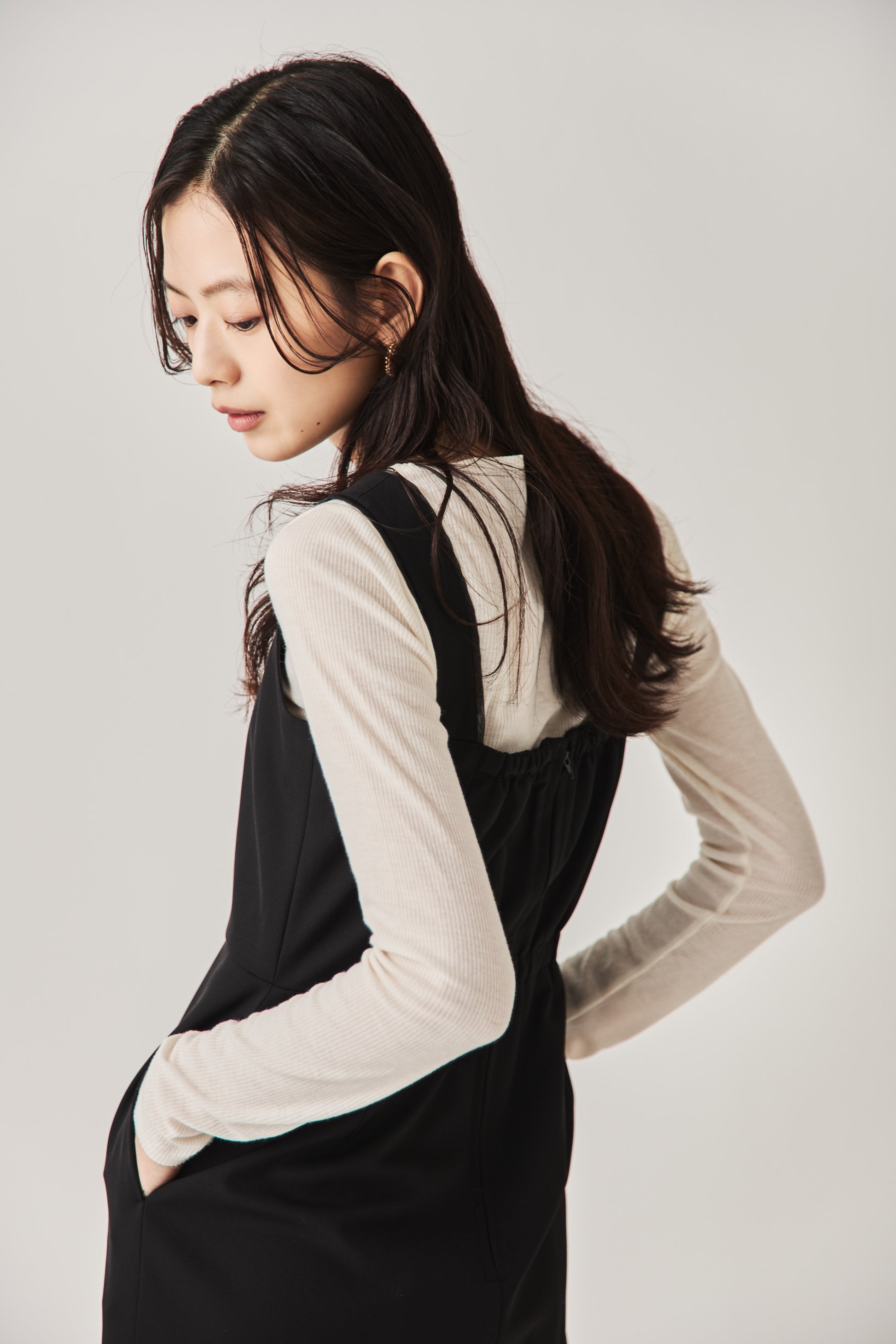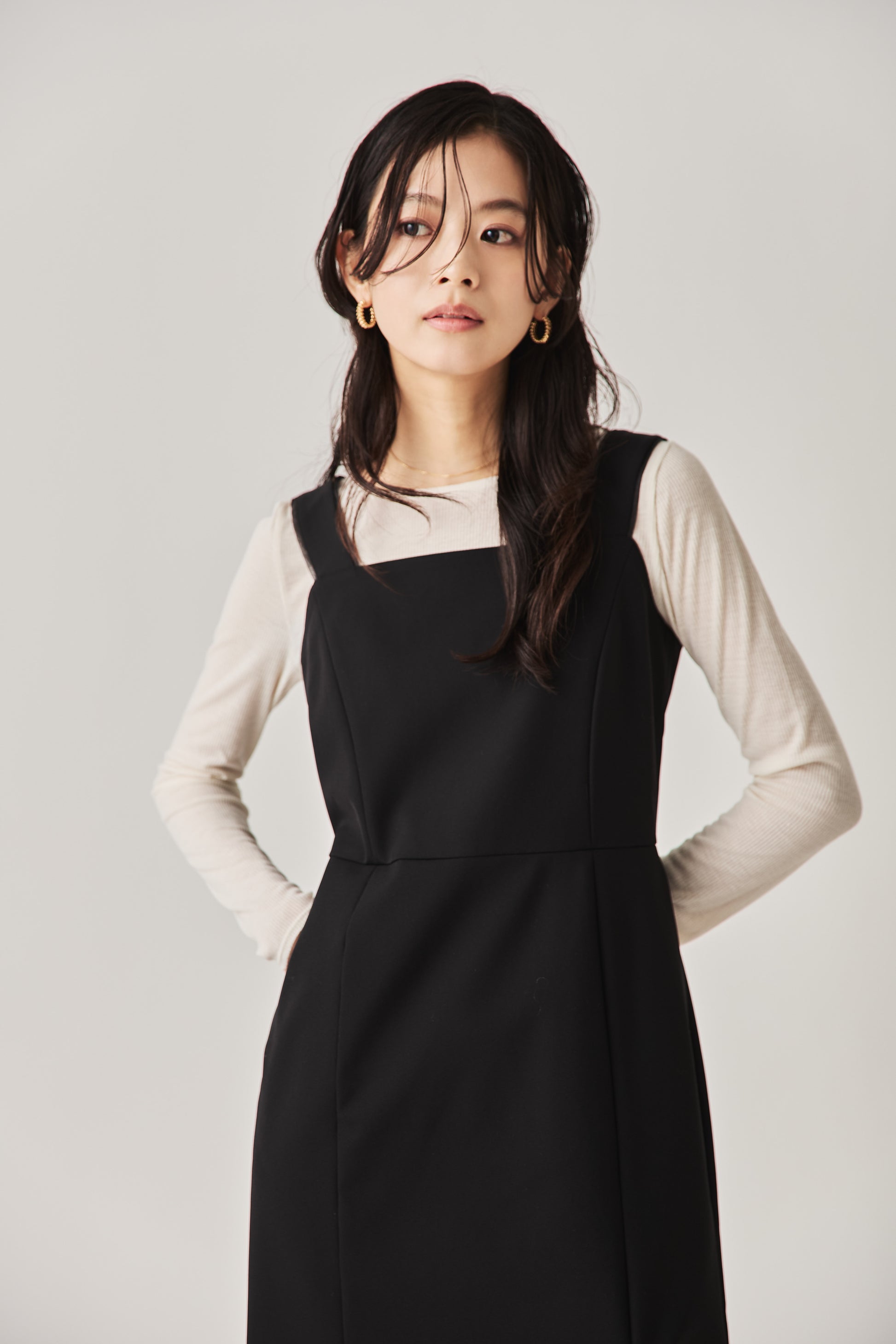 シャープなスクエアネックと、裾から覗く繊細なシアー素材の切り替わりが目を惹くジャンパードレス。 ミニマルなシルエットの中に、サイドスリットや背面のギャザーなど、360度どこから見ても美しいこだわりを詰め込みました。 裾部分に透け感のある素材を使用することで 足元に抜け感を演出し、ブラック特有の重さを軽減します。  背面にはゴムシャーリングを施し、程よいフィット感と動きやすさを両立。デコルテを美しく見せる直線的なラインが、1枚でも、インナーを重ねてもスッキリとした印象に。