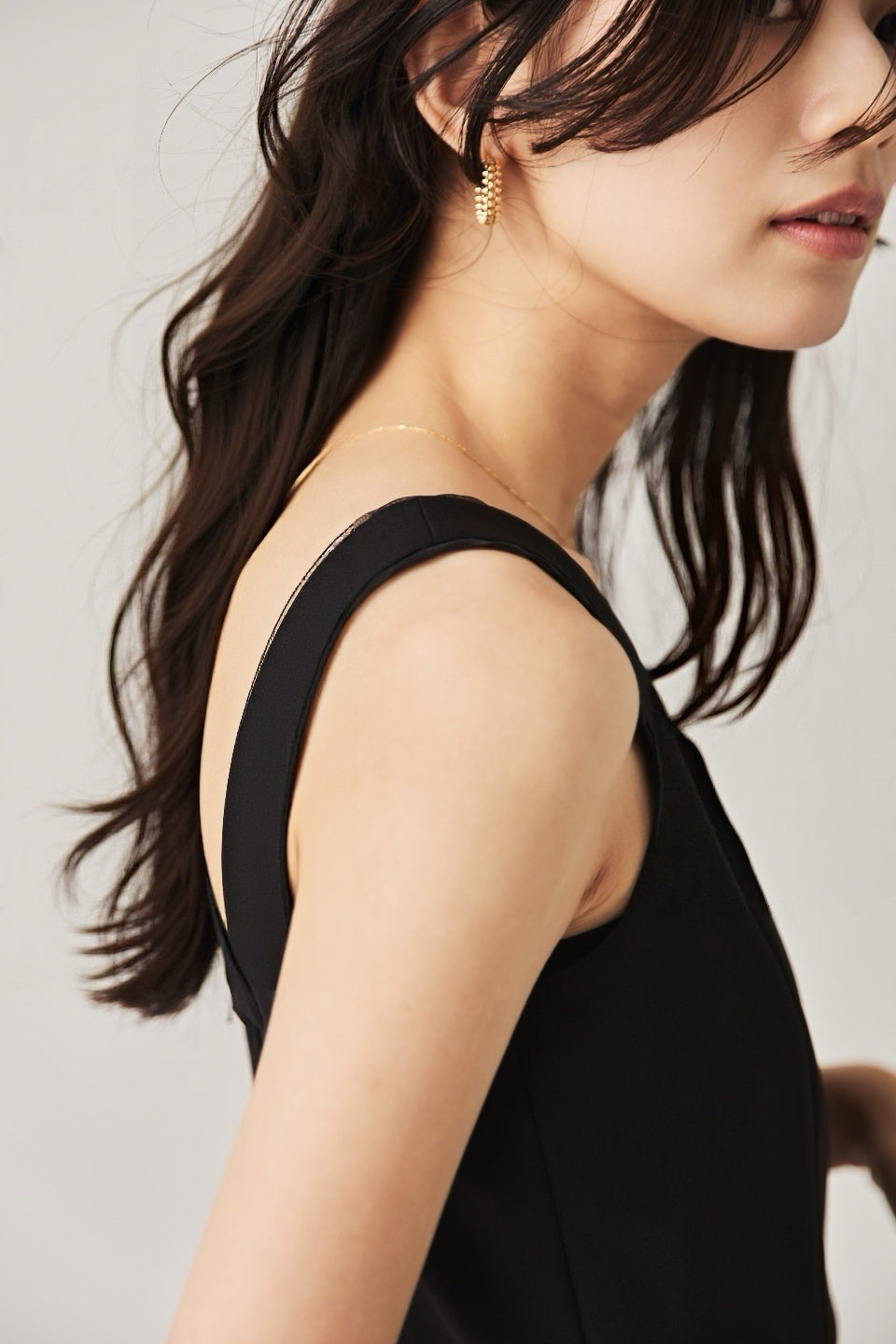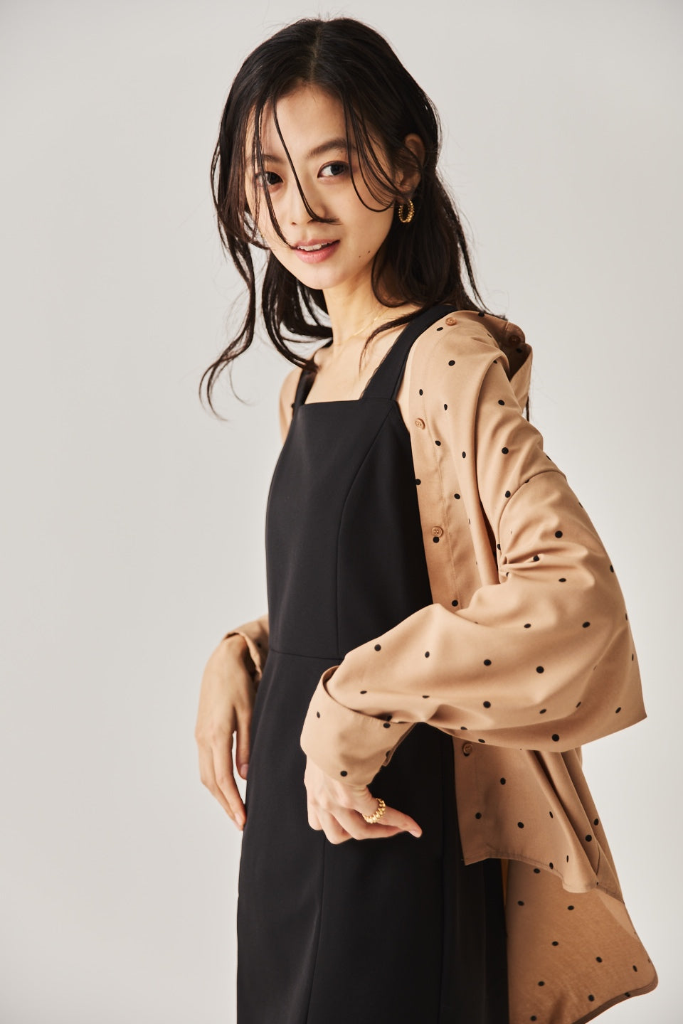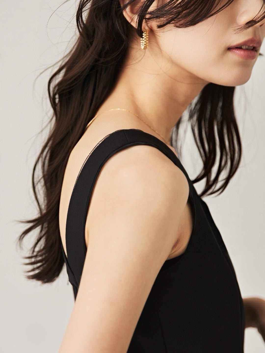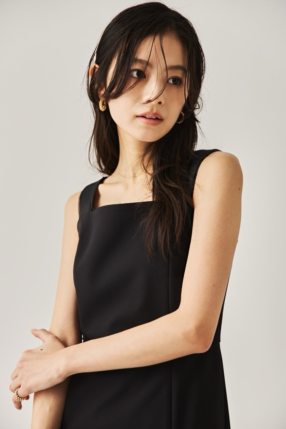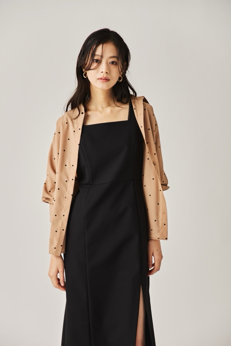 シャープなスクエアネックと、裾から覗く繊細なシアー素材の切り替わりが目を惹くジャンパードレス。 ミニマルなシルエットの中に、サイドスリットや背面のギャザーなど、360度どこから見ても美しいこだわりを詰め込みました。 裾部分に透け感のある素材を使用することで 足元に抜け感を演出し、ブラック特有の重さを軽減します。  背面にはゴムシャーリングを施し、程よいフィット感と動きやすさを両立。デコルテを美しく見せる直線的なラインが、1枚でも、インナーを重ねてもスッキリとした印象に。