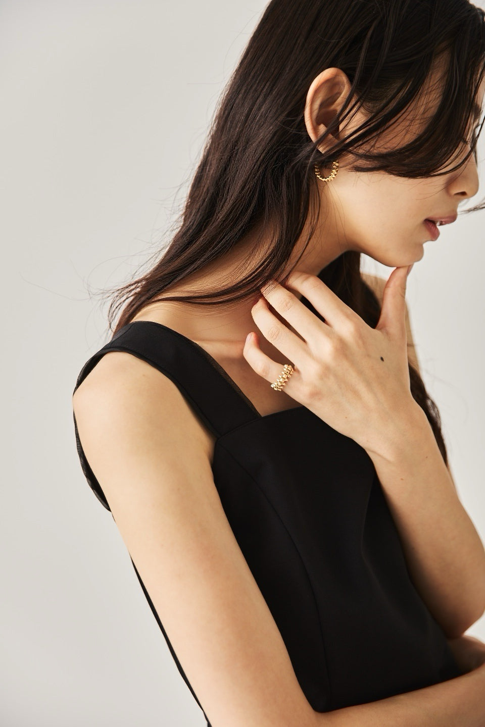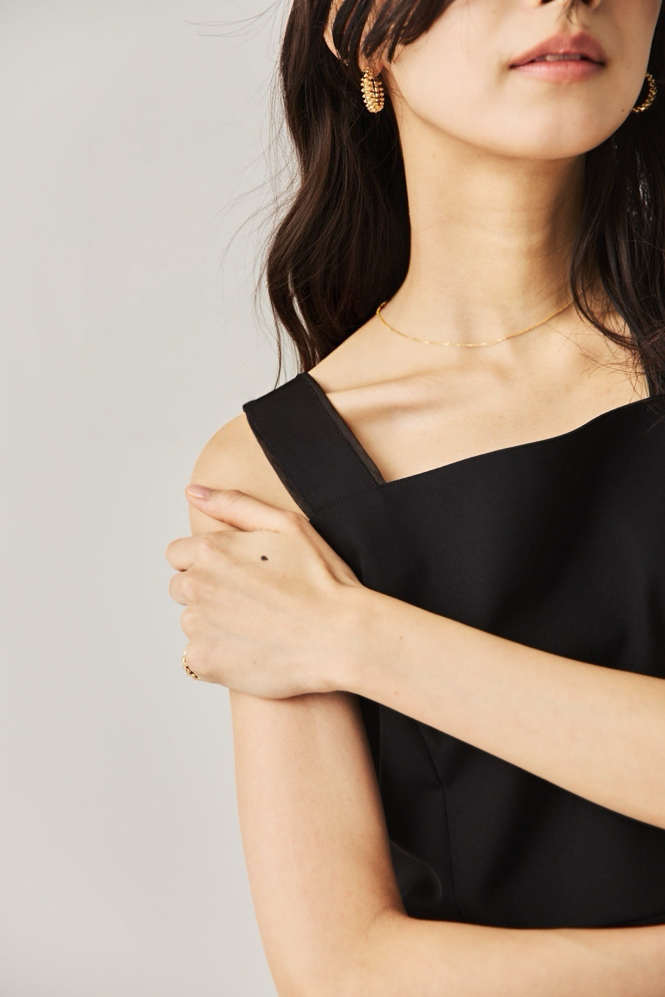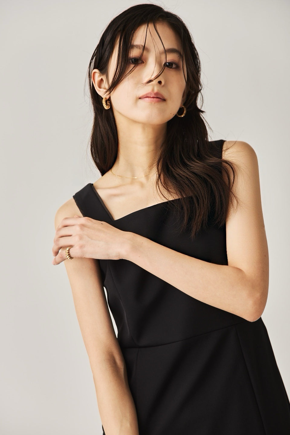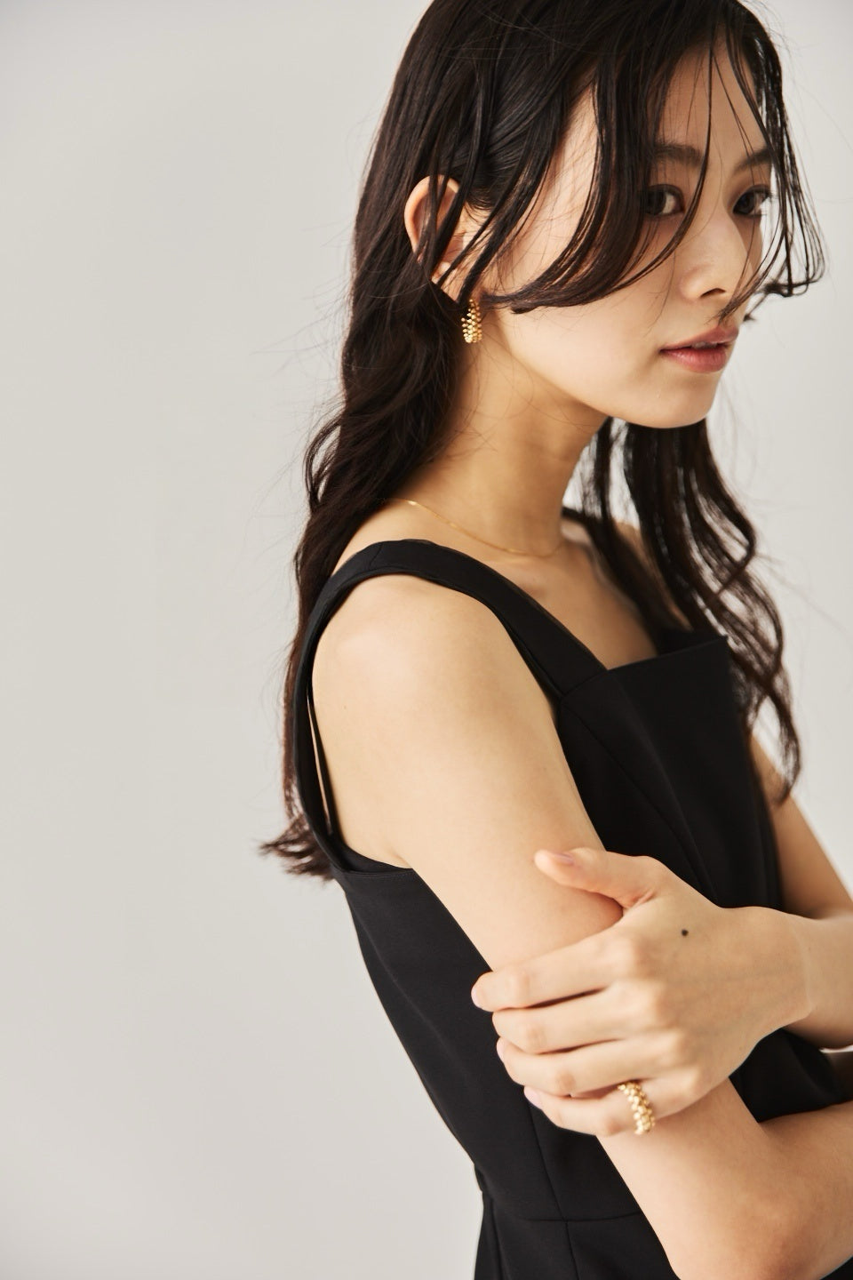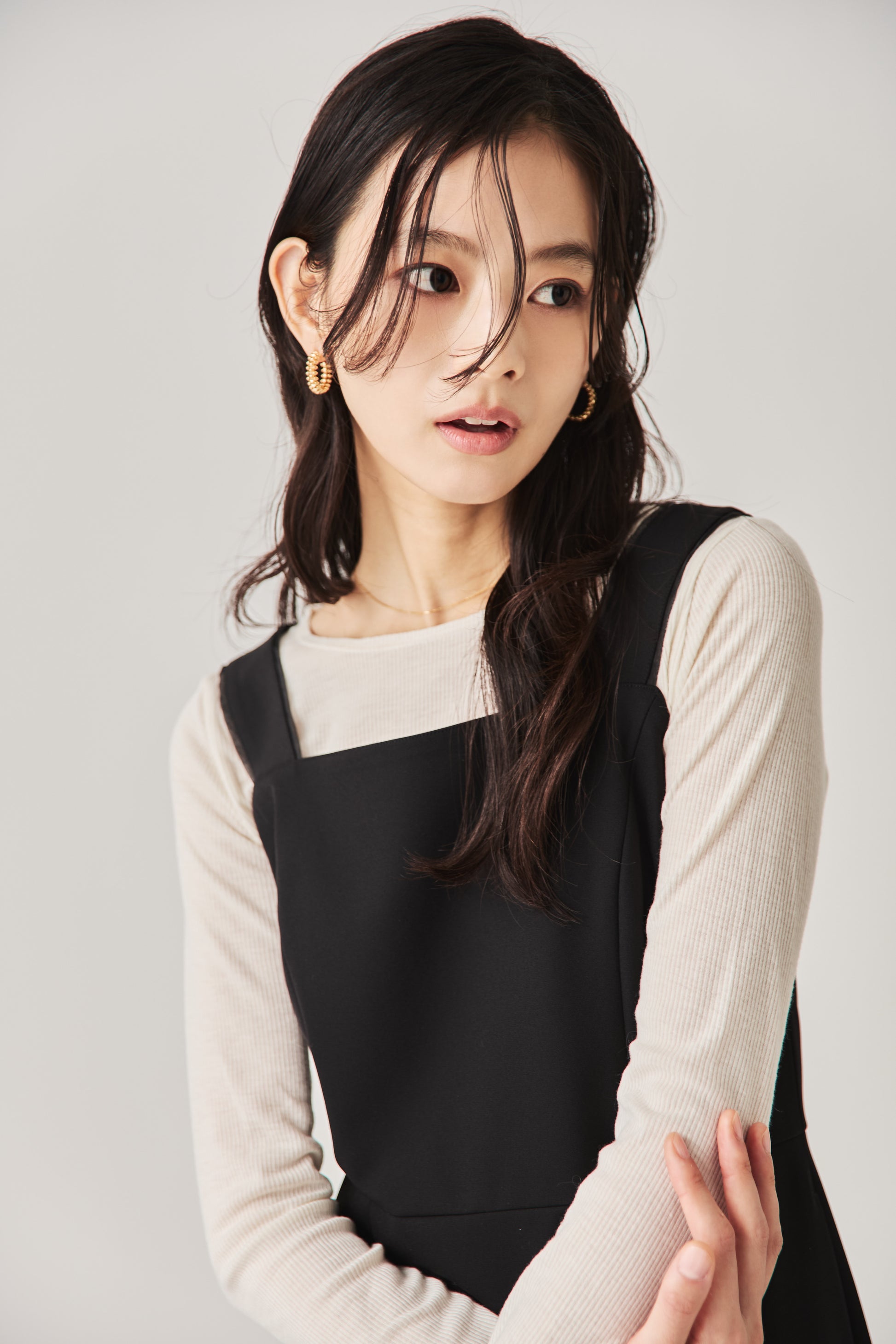 シャープなスクエアネックと、裾から覗く繊細なシアー素材の切り替わりが目を惹くジャンパードレス。 ミニマルなシルエットの中に、サイドスリットや背面のギャザーなど、360度どこから見ても美しいこだわりを詰め込みました。 裾部分に透け感のある素材を使用することで 足元に抜け感を演出し、ブラック特有の重さを軽減します。  背面にはゴムシャーリングを施し、程よいフィット感と動きやすさを両立。デコルテを美しく見せる直線的なラインが、1枚でも、インナーを重ねてもスッキリとした印象に。