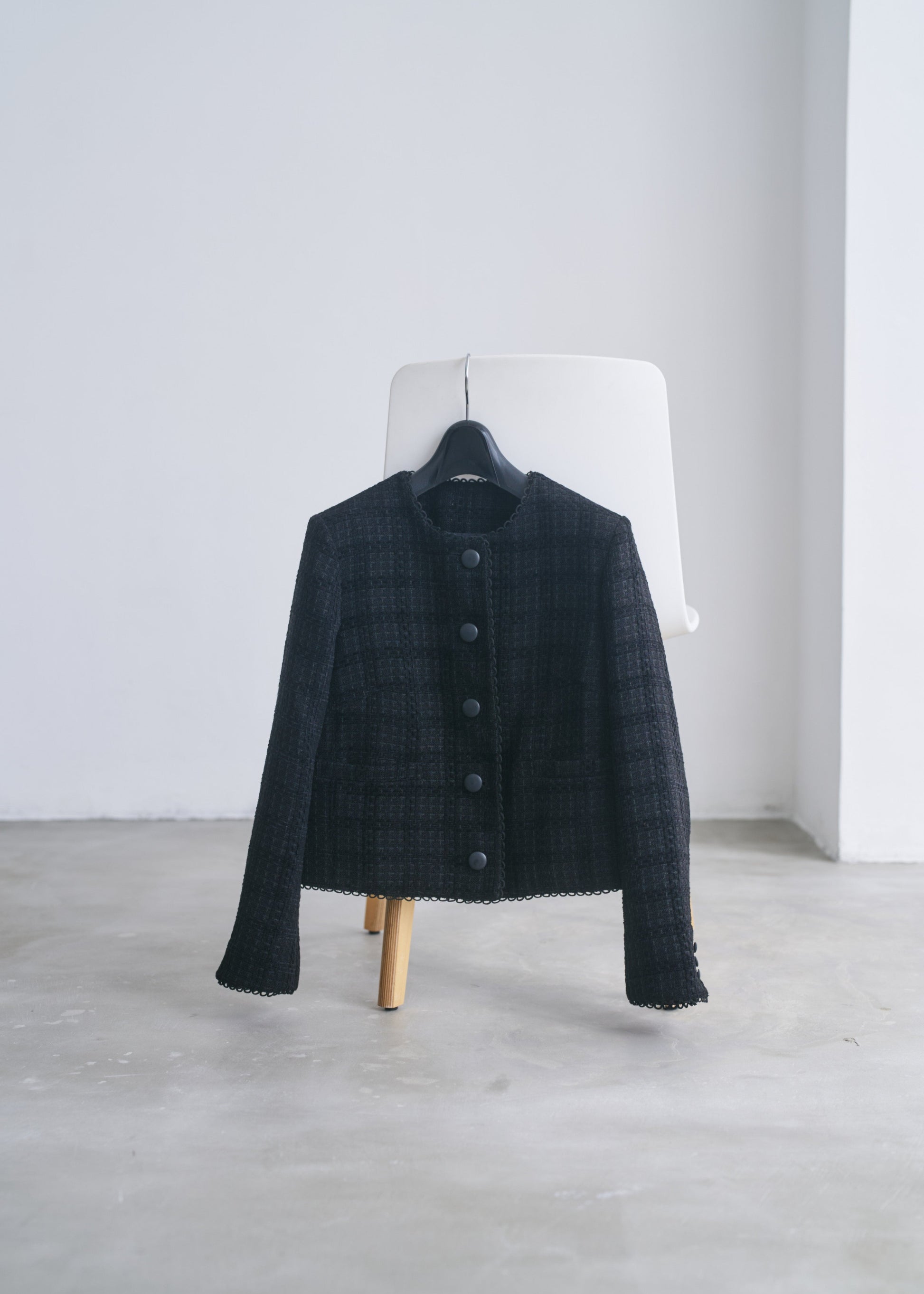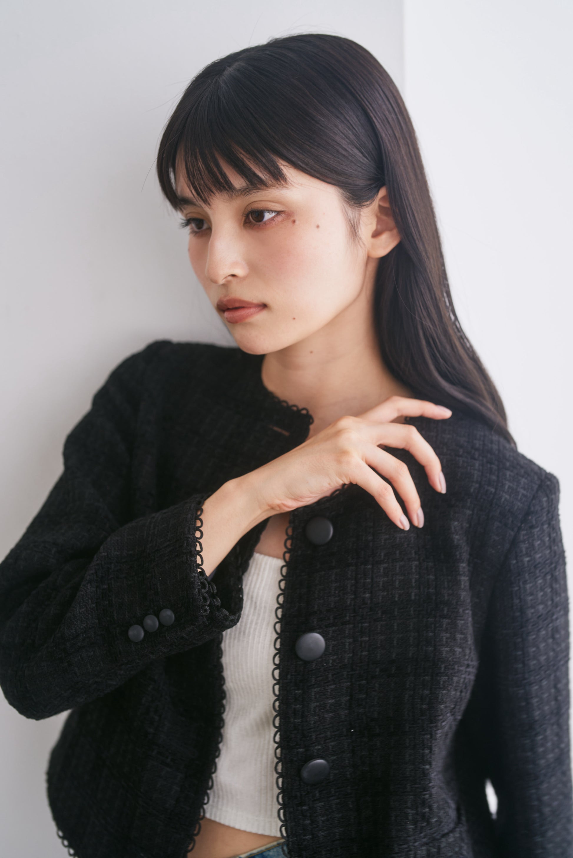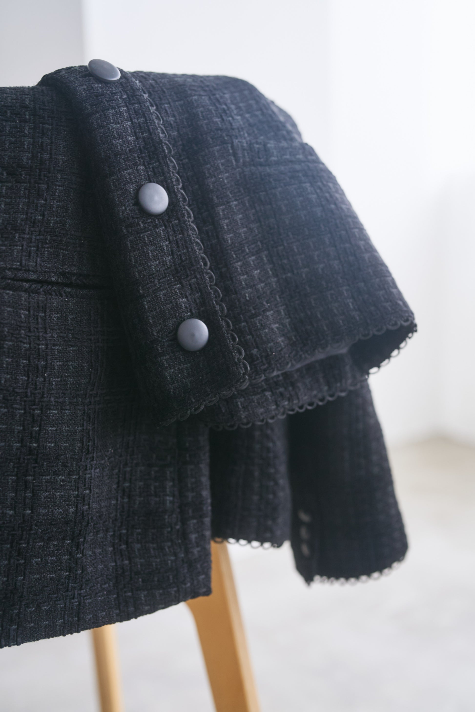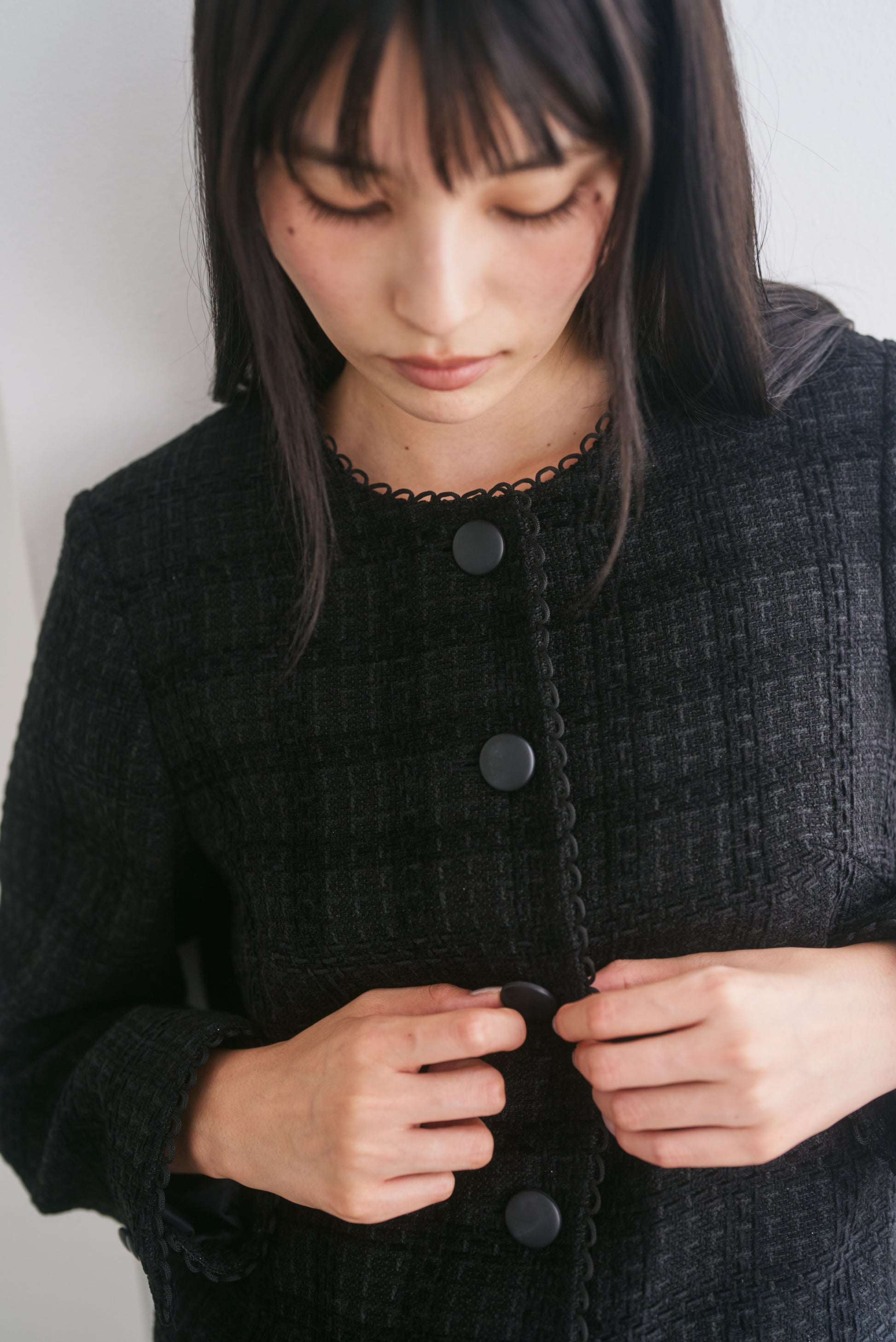 今期イチ押しのツイードシリーズ。丸いマット素材のBLACKボタンとスカラップエッジが際立つCONNSEらしいツイードジャケット。ストレートシルエットに仕上げました。上品な表情を持つツイード素材を使用。太番手と細番手を交互に織り込んだ凹凸感のある織りが、スタイリングに立体感と奥行きをプラスします。デニムやベロアパンツ、ミニ丈のボトムなどで合わせていただくと素敵です。