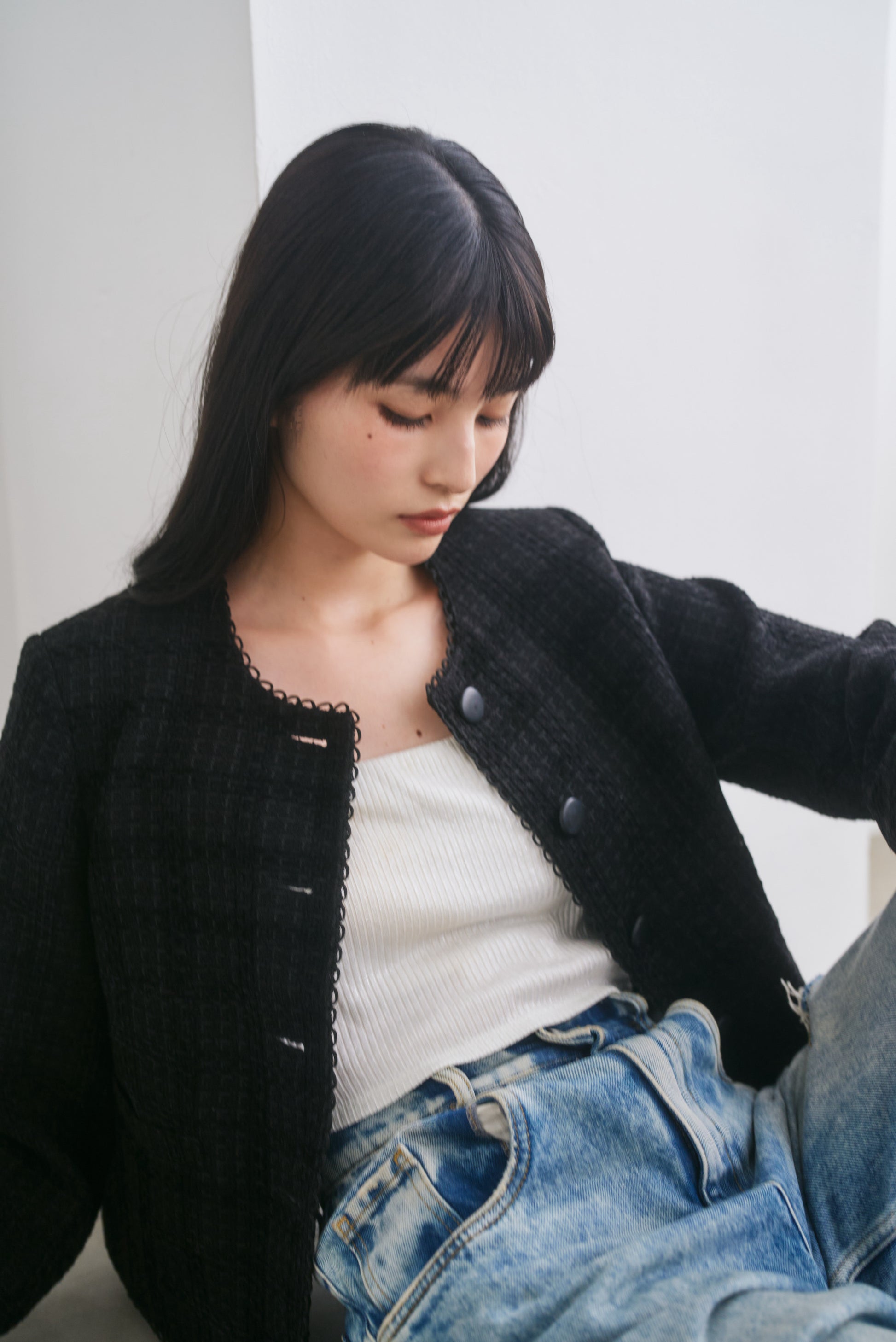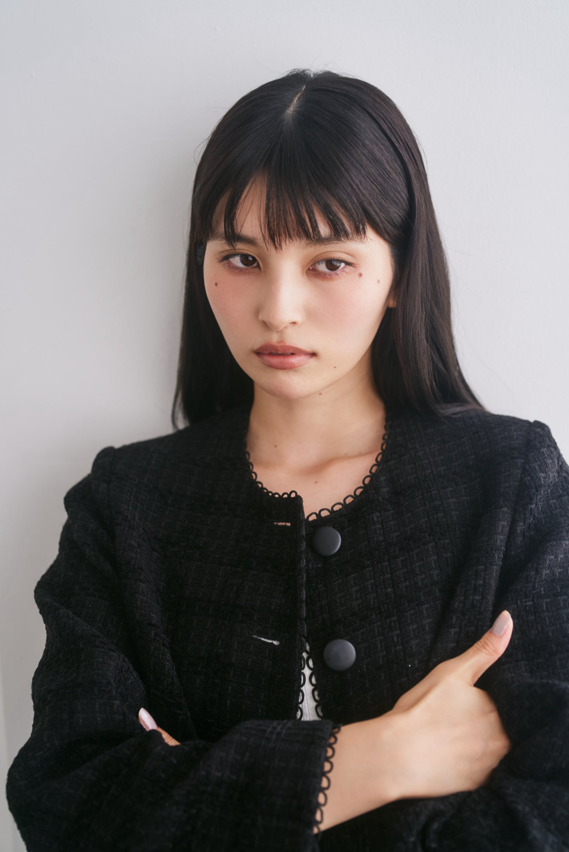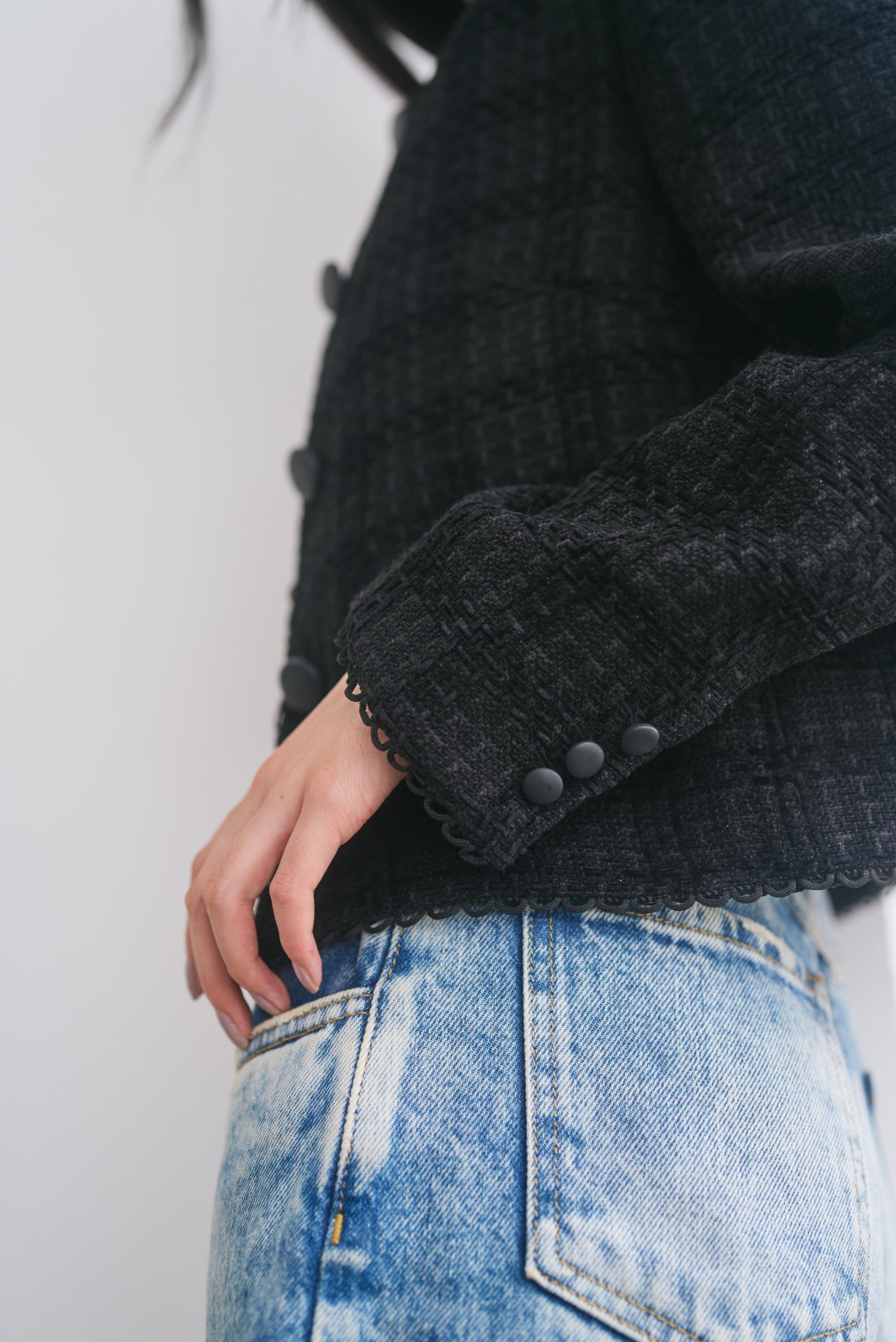 今期イチ押しのツイードシリーズ。丸いマット素材のBLACKボタンとスカラップエッジが際立つCONNSEらしいツイードジャケット。ストレートシルエットに仕上げました。上品な表情を持つツイード素材を使用。太番手と細番手を交互に織り込んだ凹凸感のある織りが、スタイリングに立体感と奥行きをプラスします。デニムやベロアパンツ、ミニ丈のボトムなどで合わせていただくと素敵です。