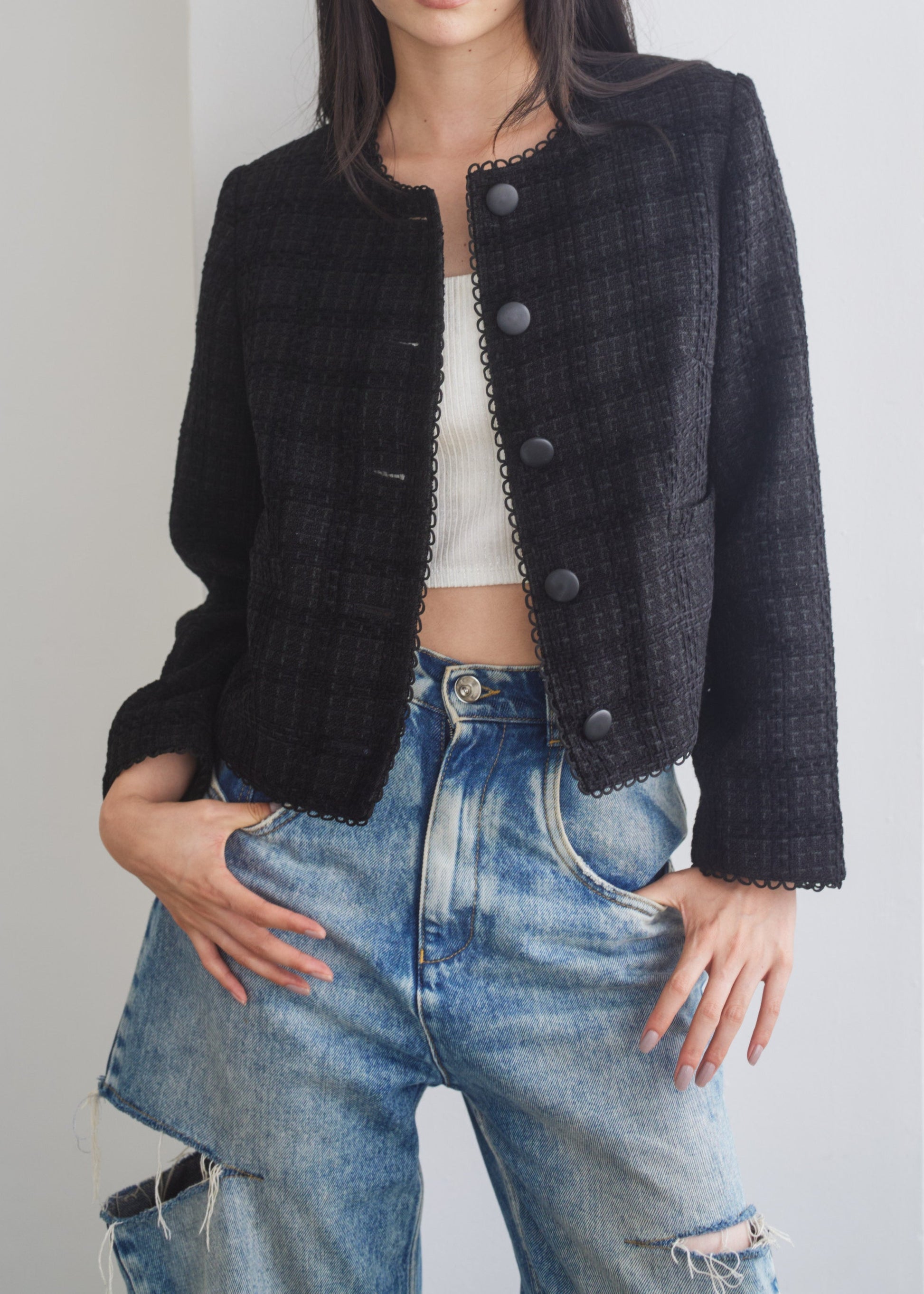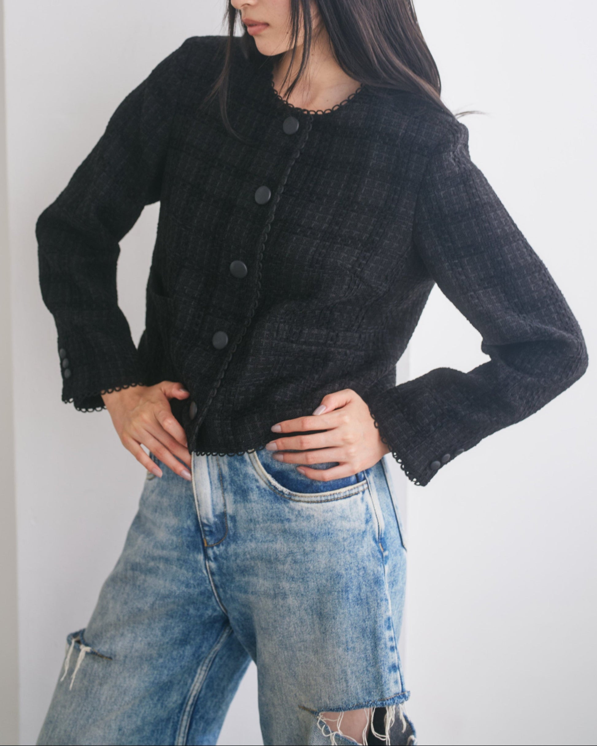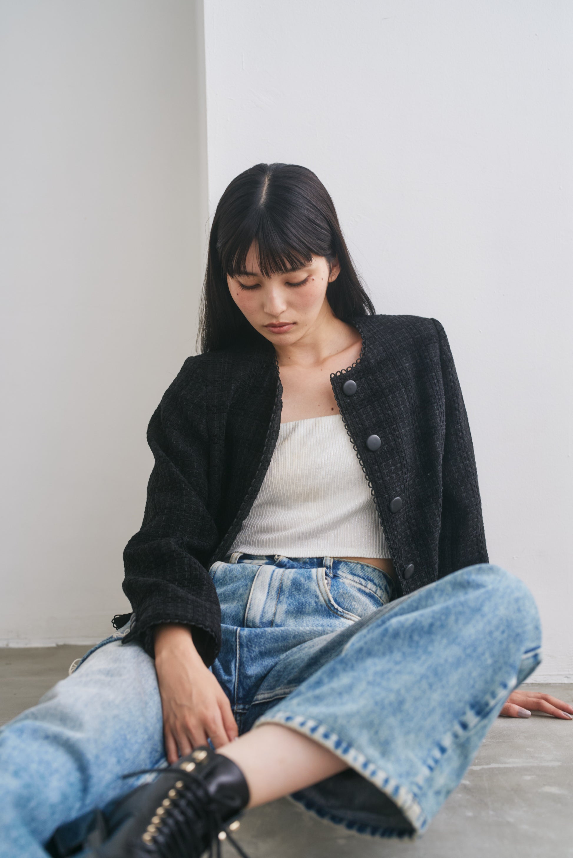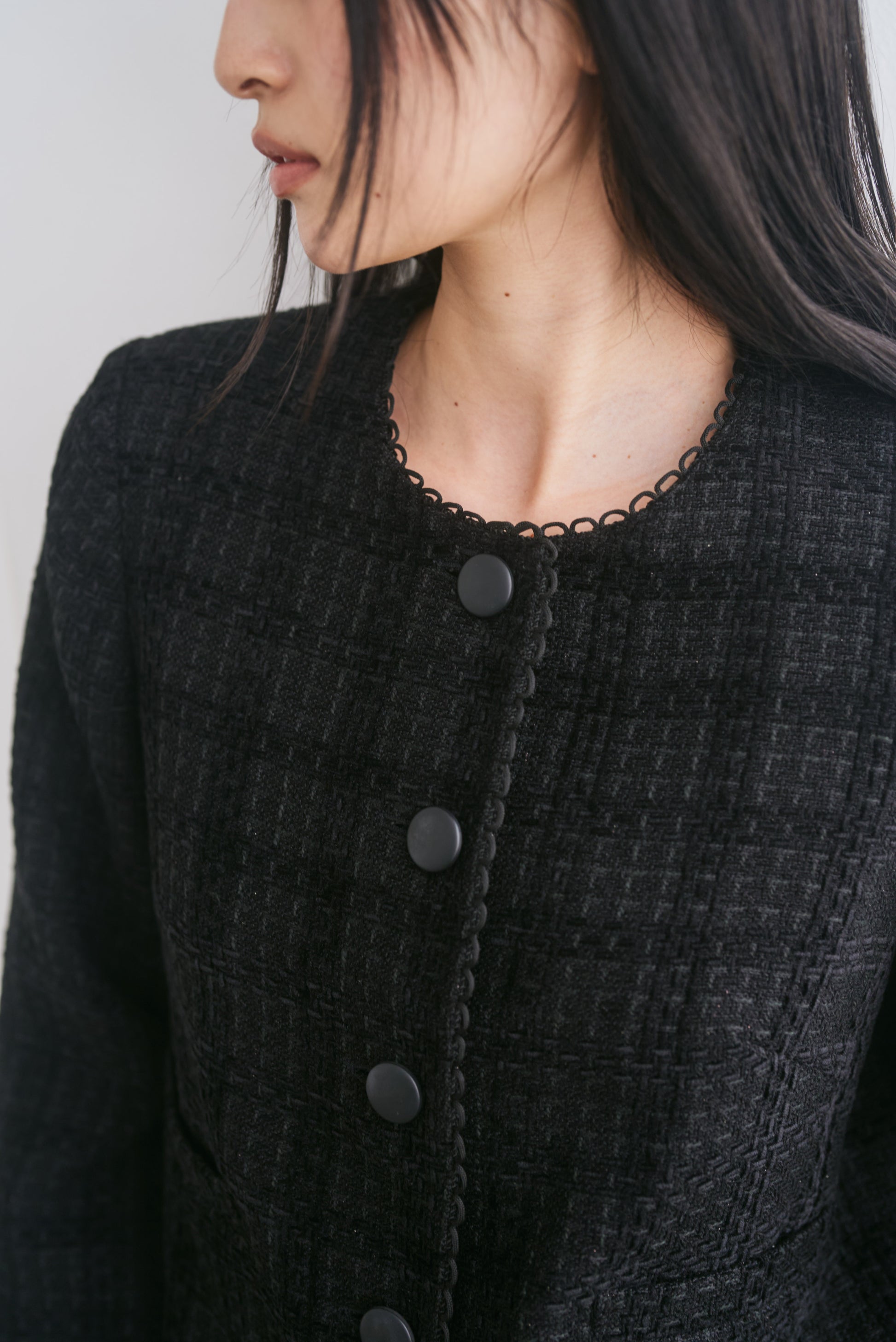 今期イチ押しのツイードシリーズ。丸いマット素材のBLACKボタンとスカラップエッジが際立つCONNSEらしいツイードジャケット。ストレートシルエットに仕上げました。上品な表情を持つツイード素材を使用。太番手と細番手を交互に織り込んだ凹凸感のある織りが、スタイリングに立体感と奥行きをプラスします。デニムやベロアパンツ、ミニ丈のボトムなどで合わせていただくと素敵です。