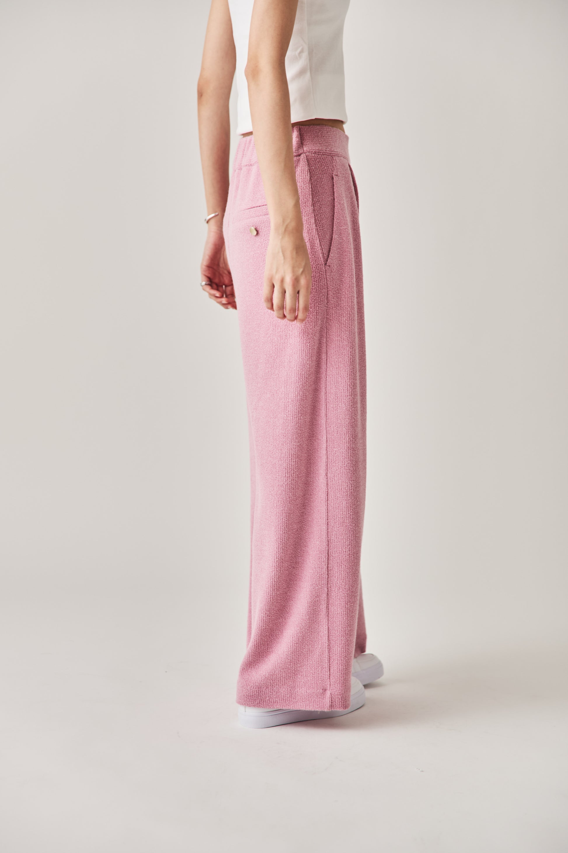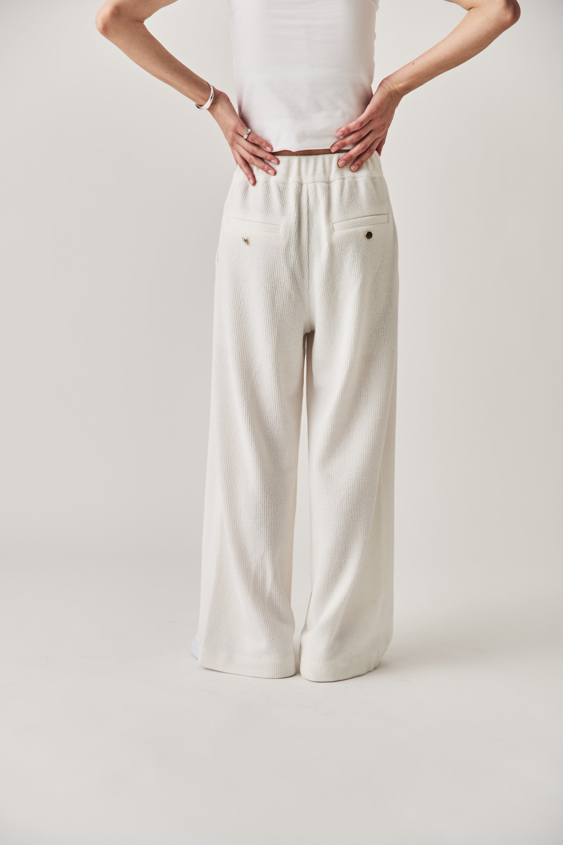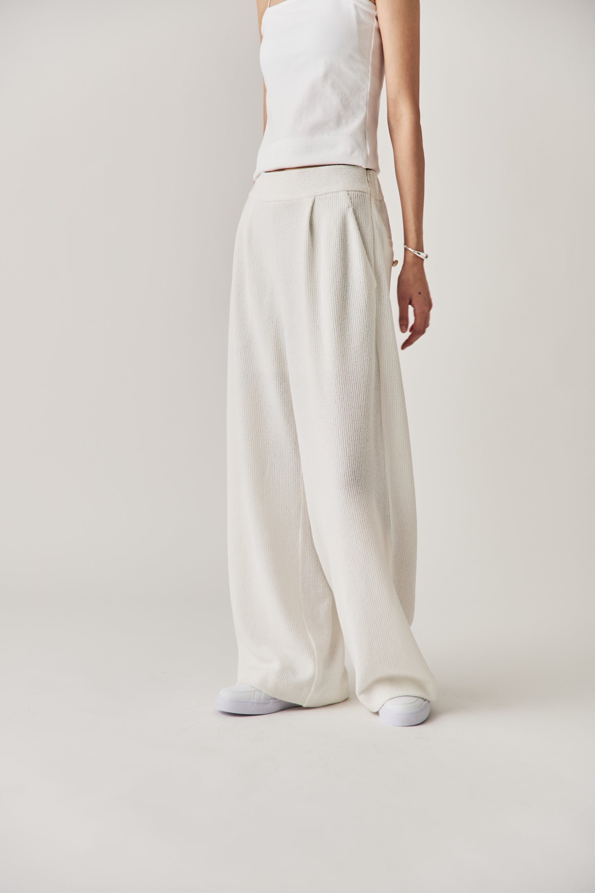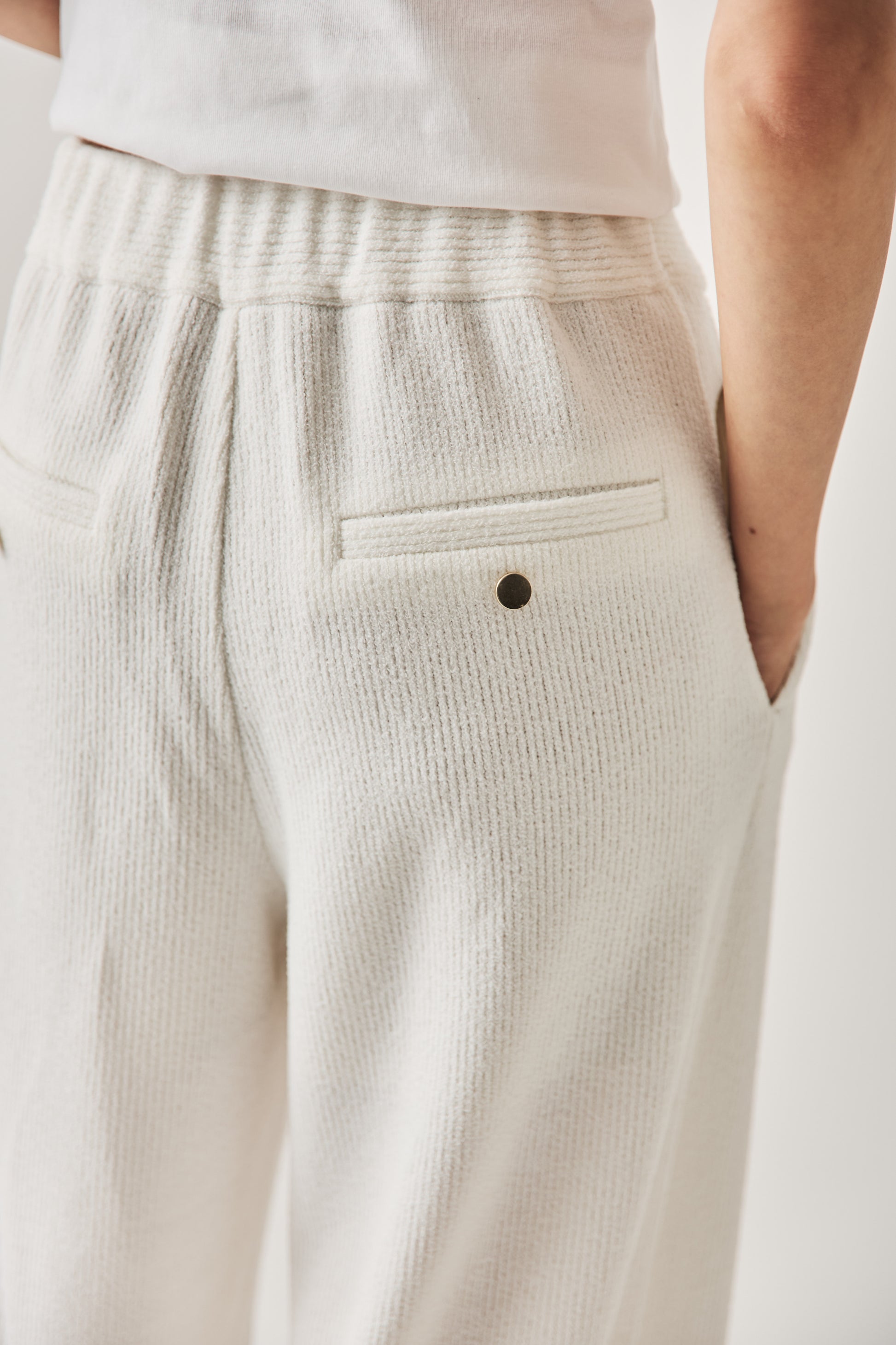 表情豊かなリブ素材を使い、リラックス感と上品さを決めたワイドパンツです。すとんとまっすぐに近いワイドシルエットが、脚のラインを拾わずにスタイルアップを叶えます。