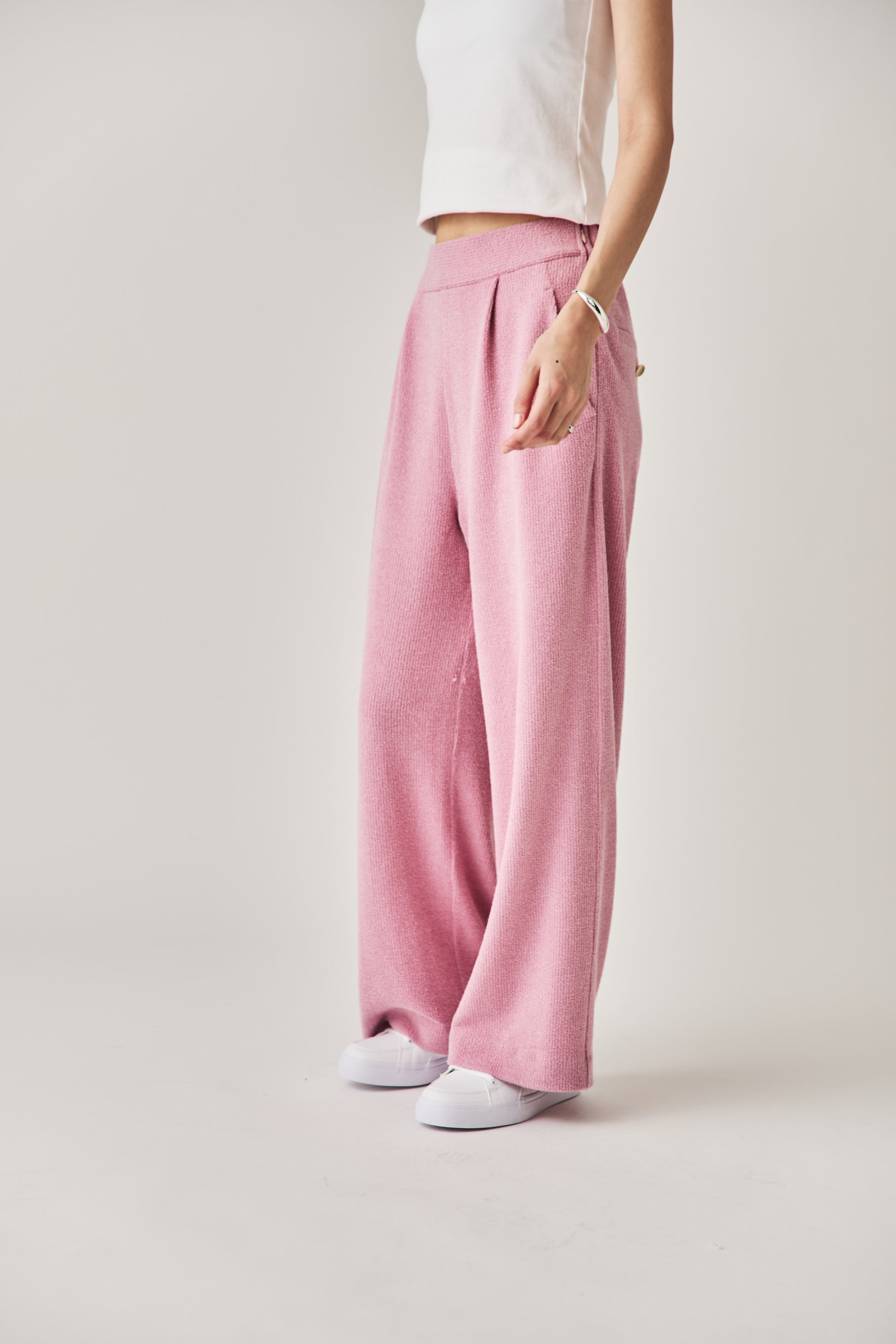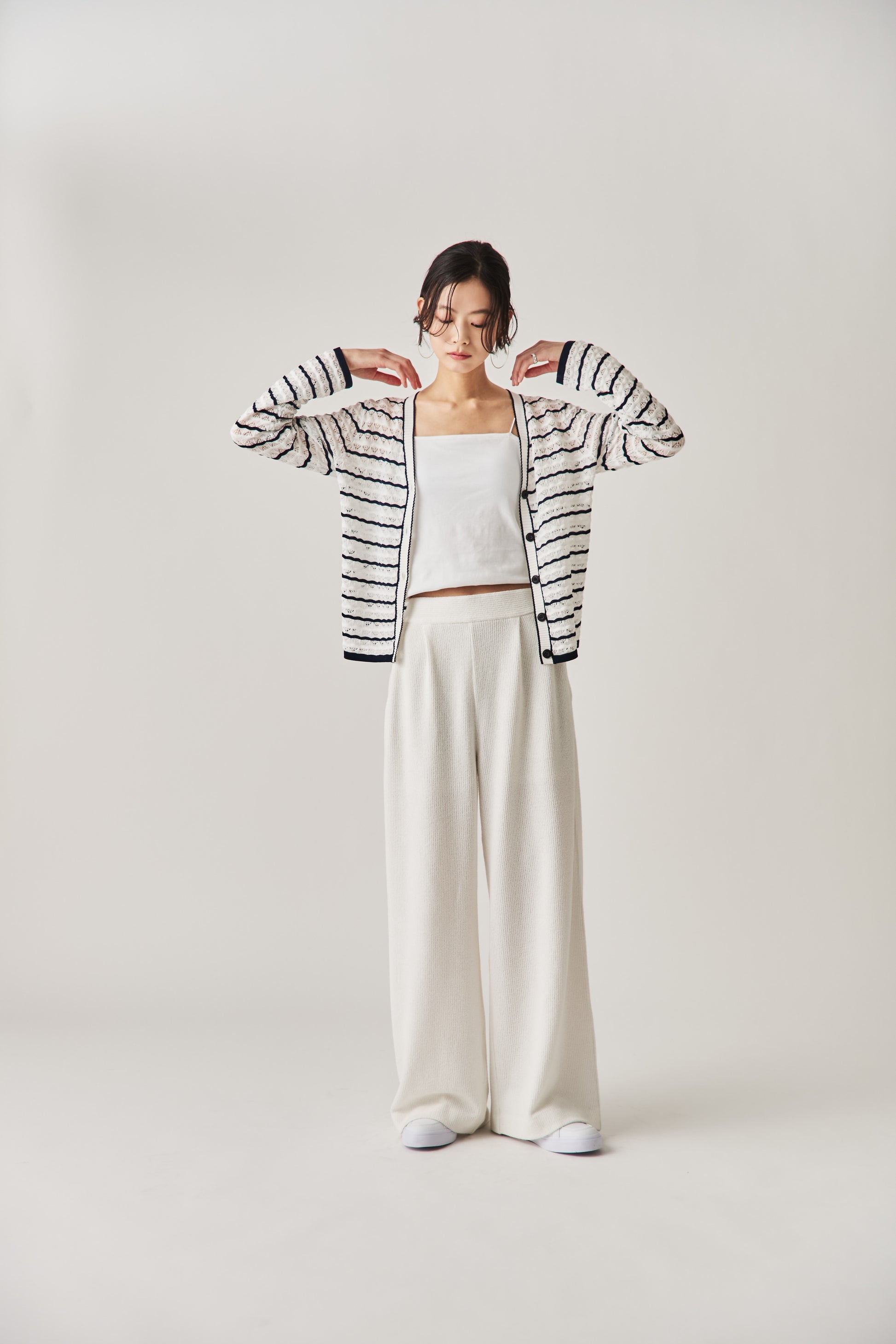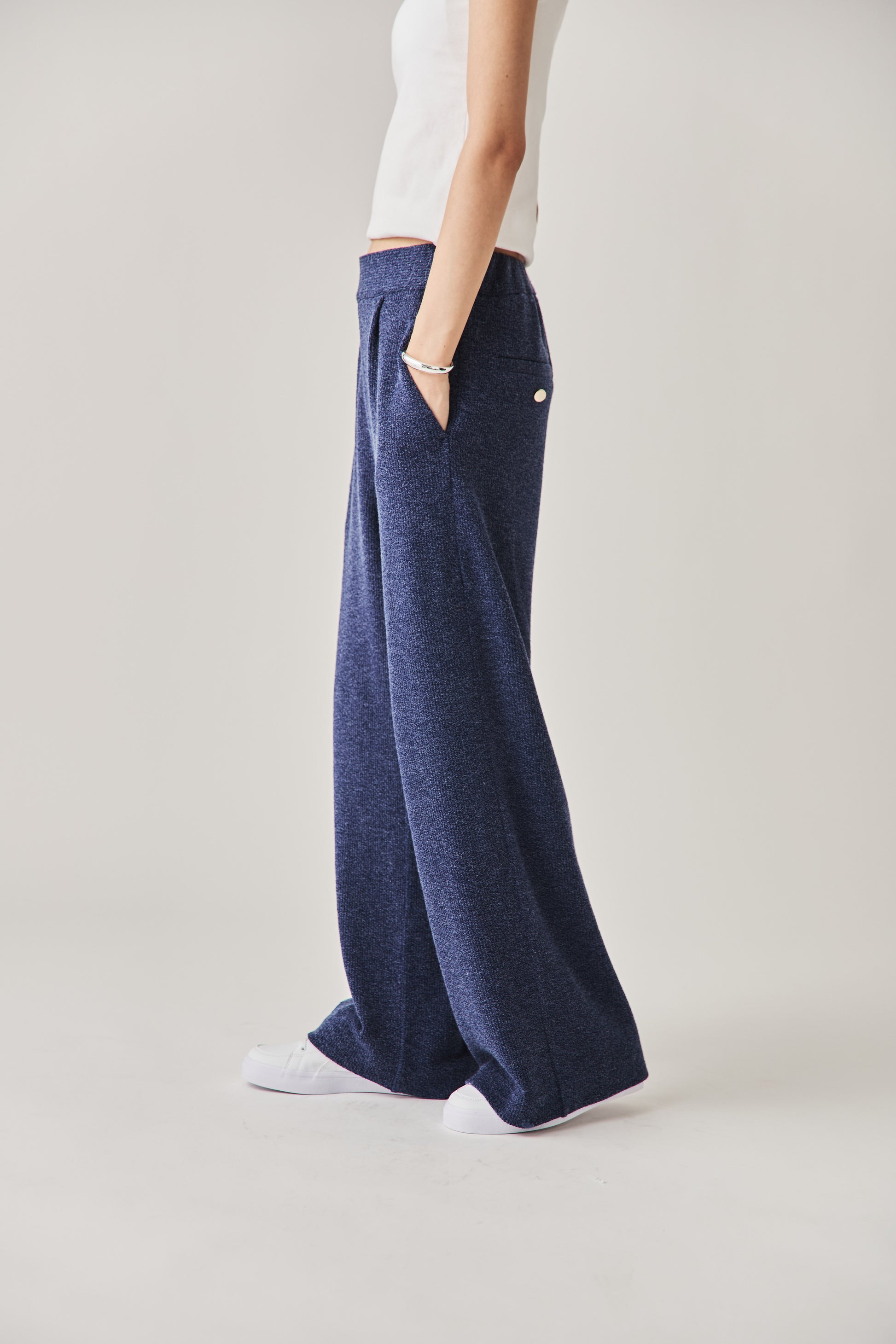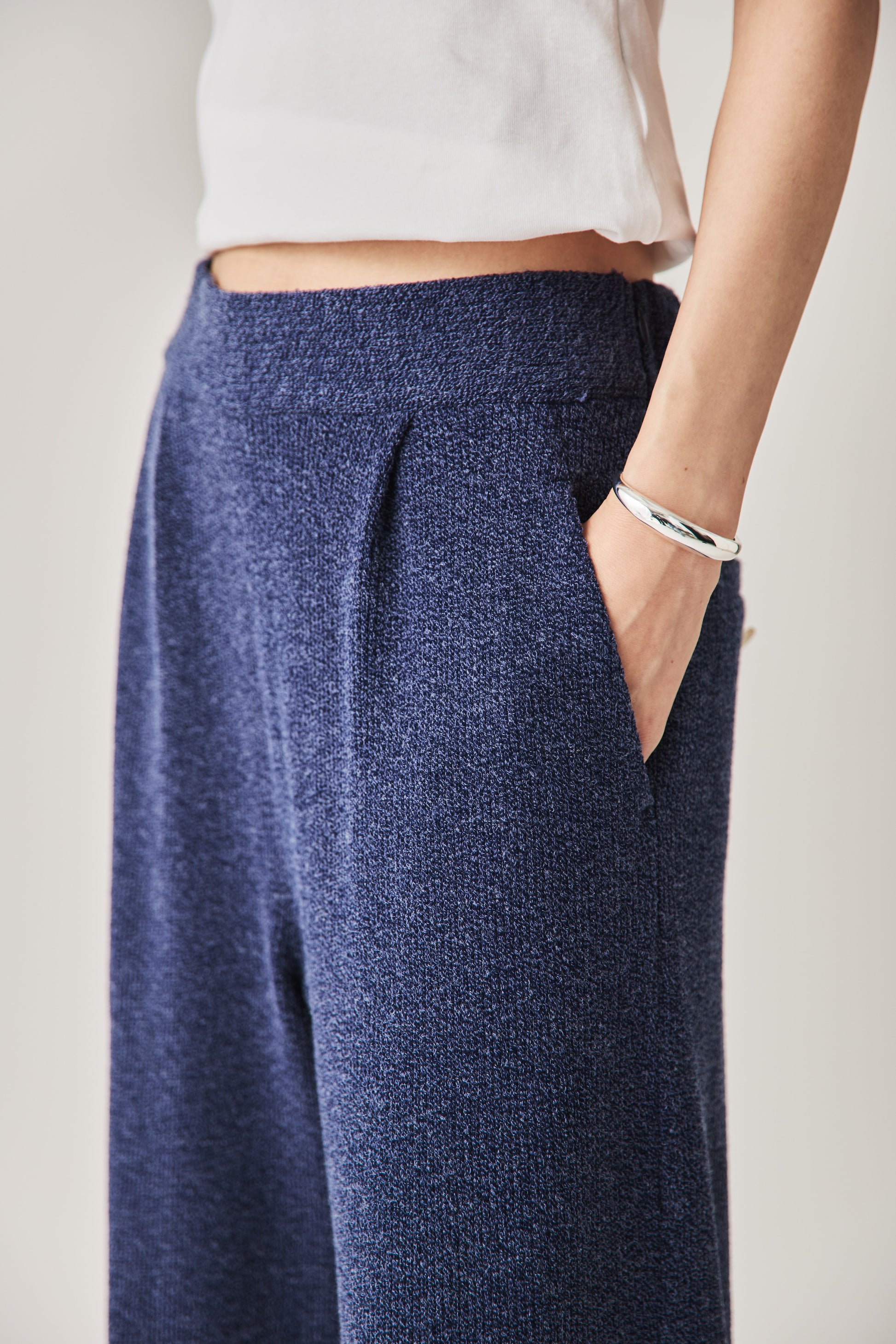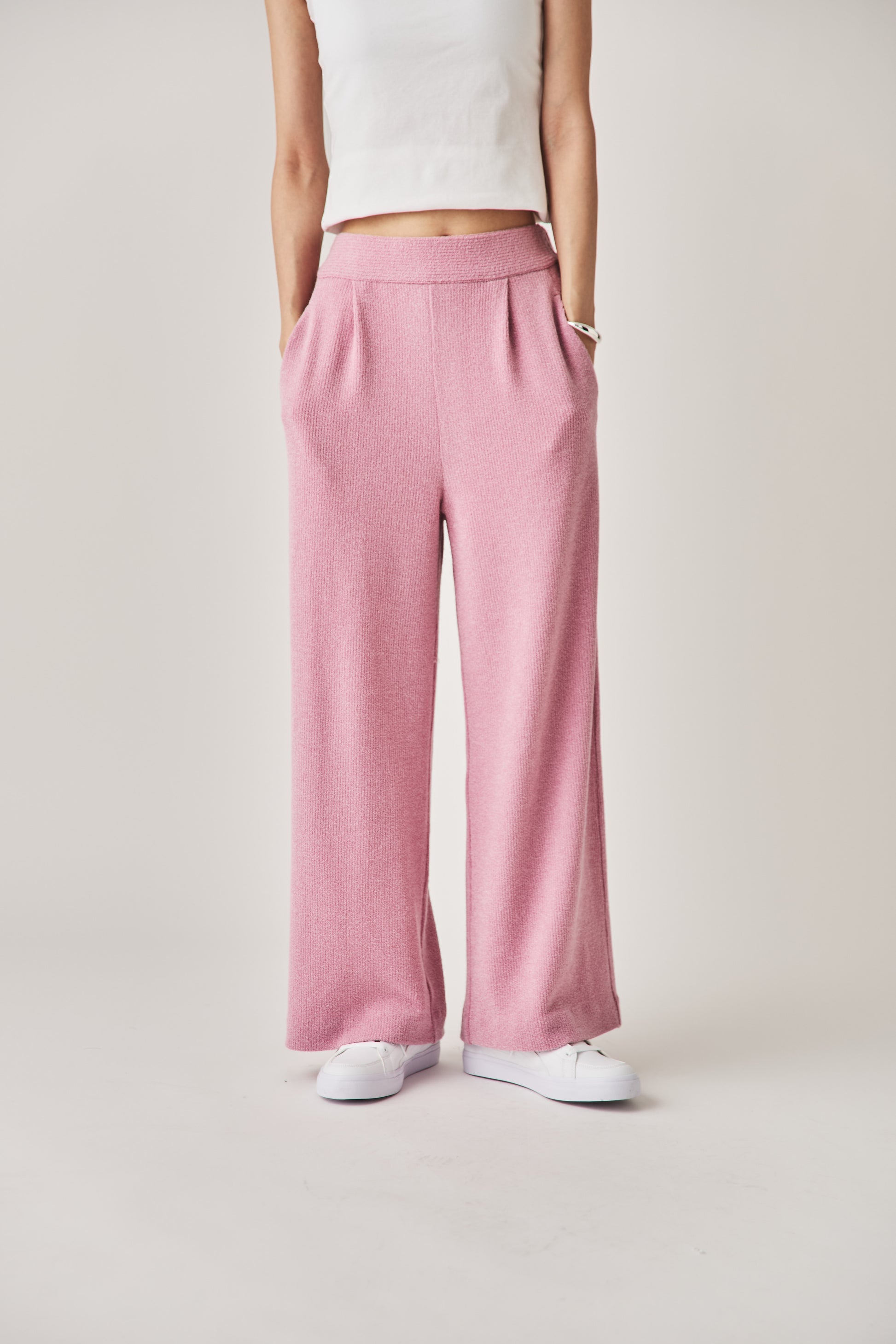 表情豊かなリブ素材を使い、リラックス感と上品さを決めたワイドパンツです。すとんとまっすぐに近いワイドシルエットが、脚のラインを拾わずにスタイルアップを叶えます。