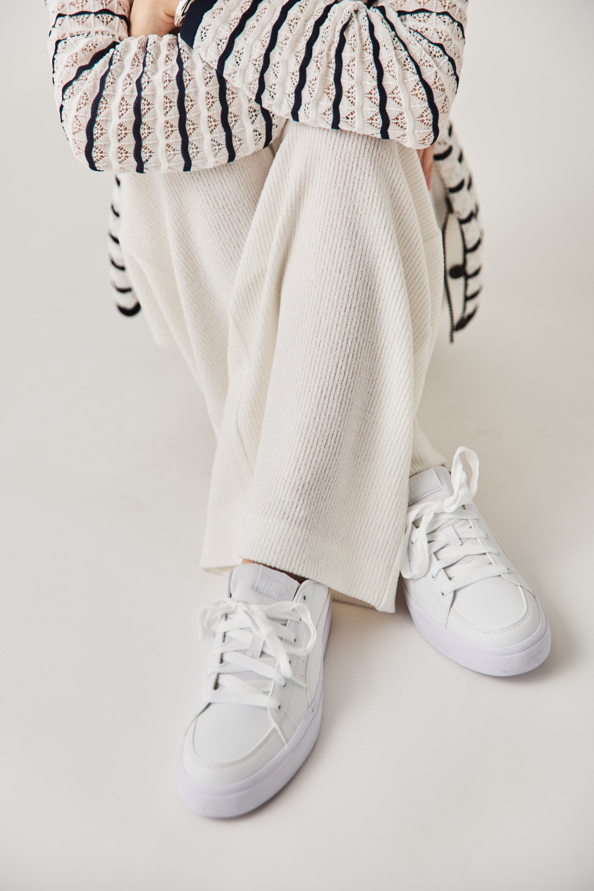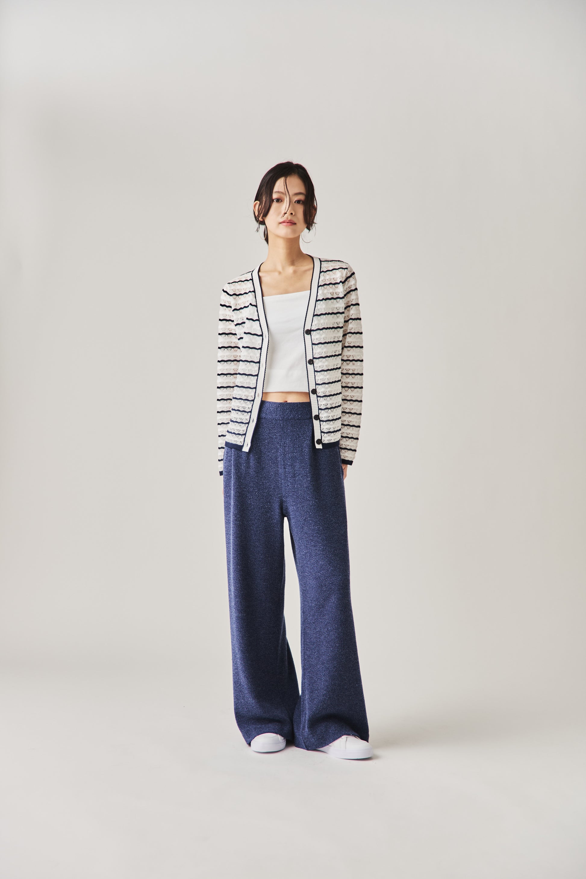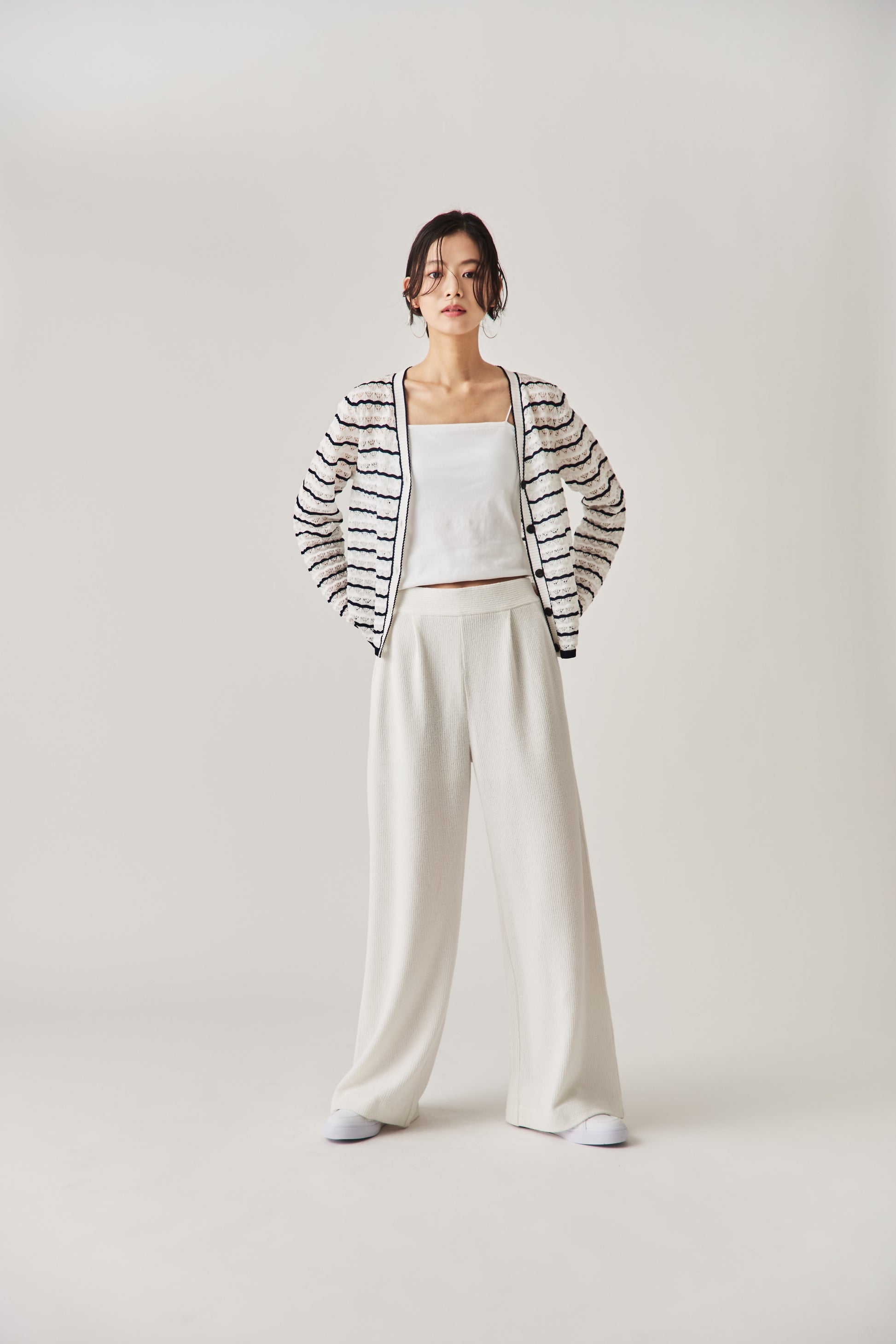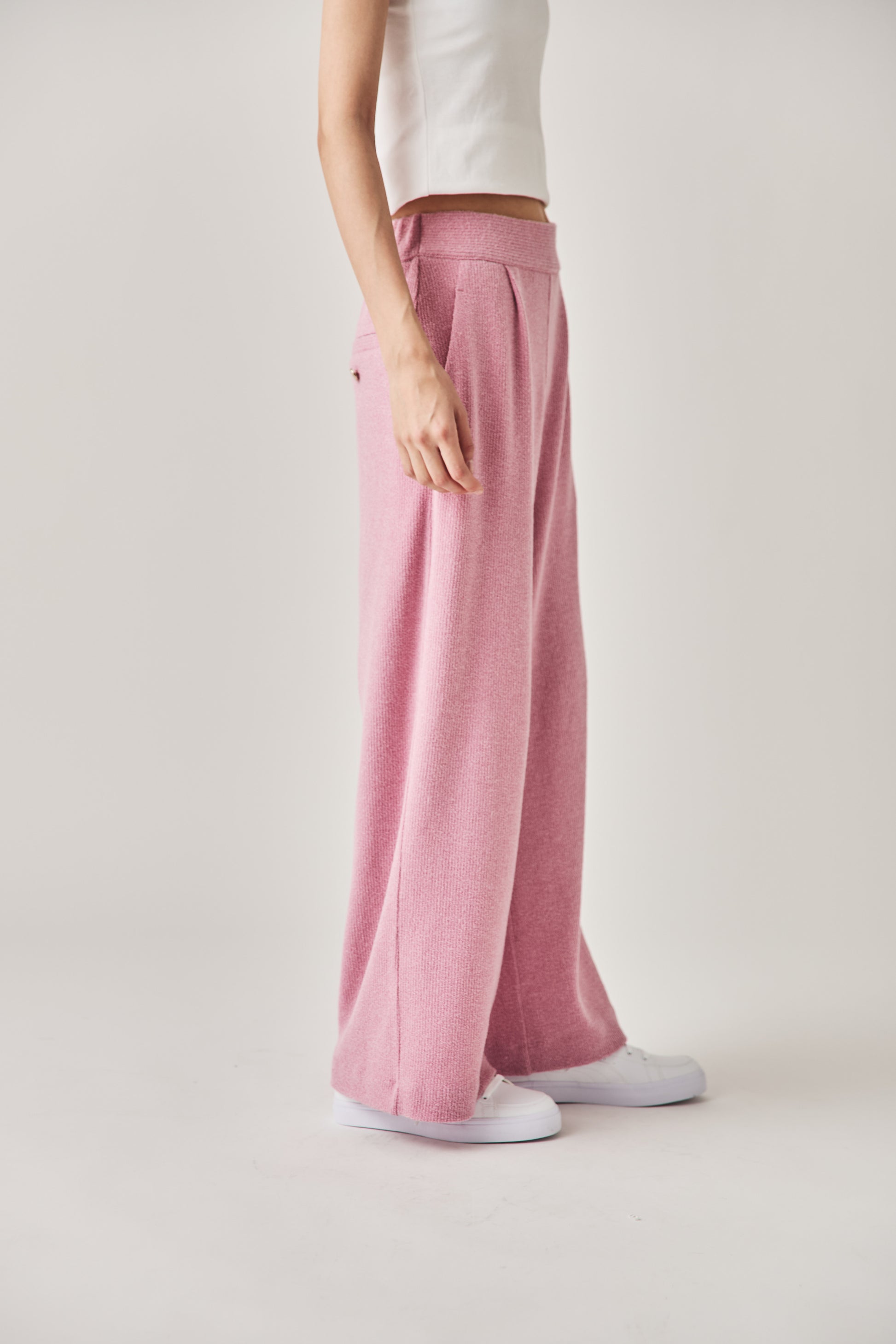 表情豊かなリブ素材を使い、リラックス感と上品さを決めたワイドパンツです。すとんとまっすぐに近いワイドシルエットが、脚のラインを拾わずにスタイルアップを叶えます。