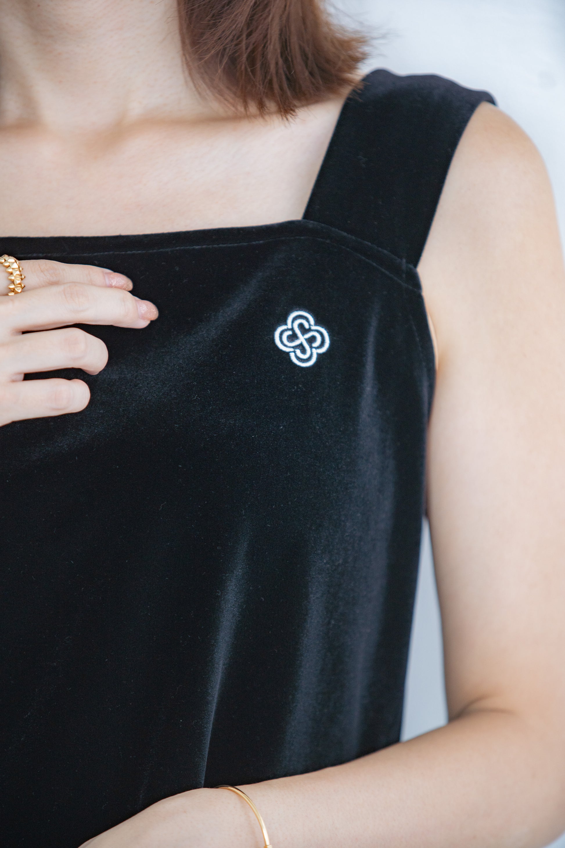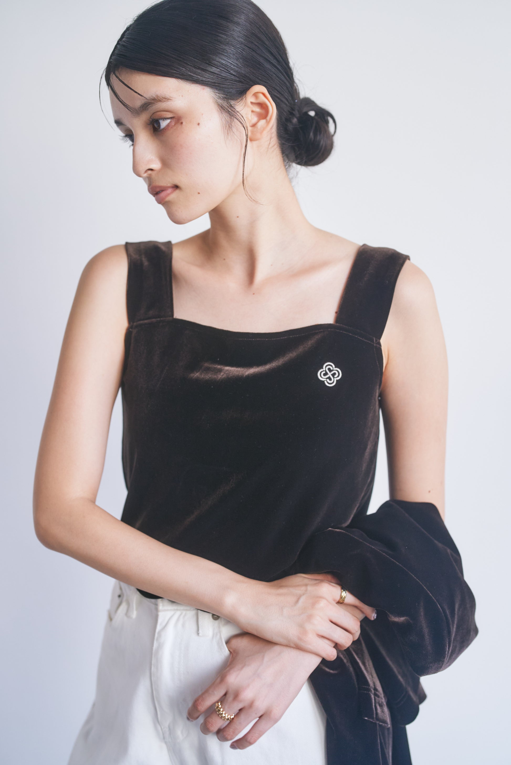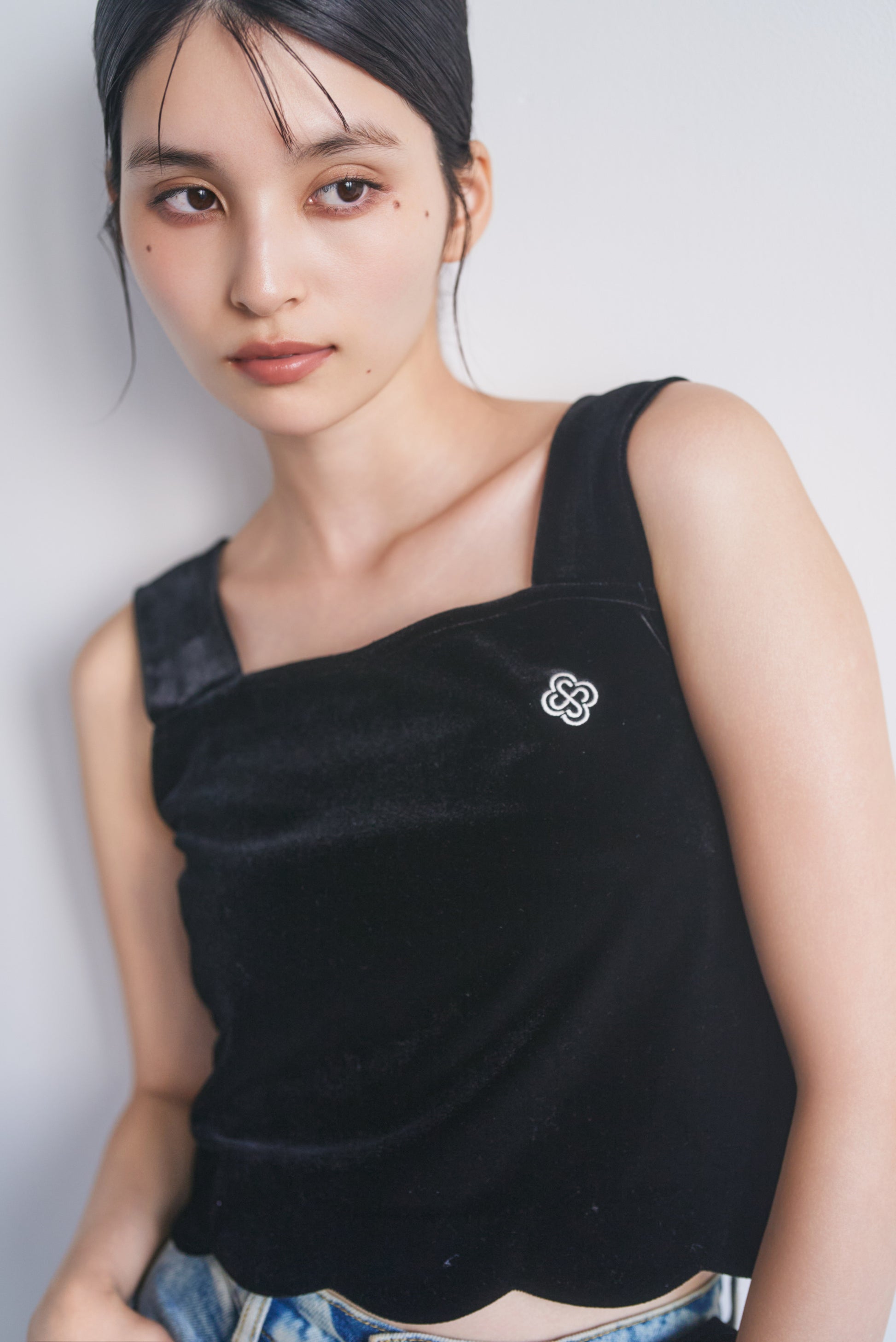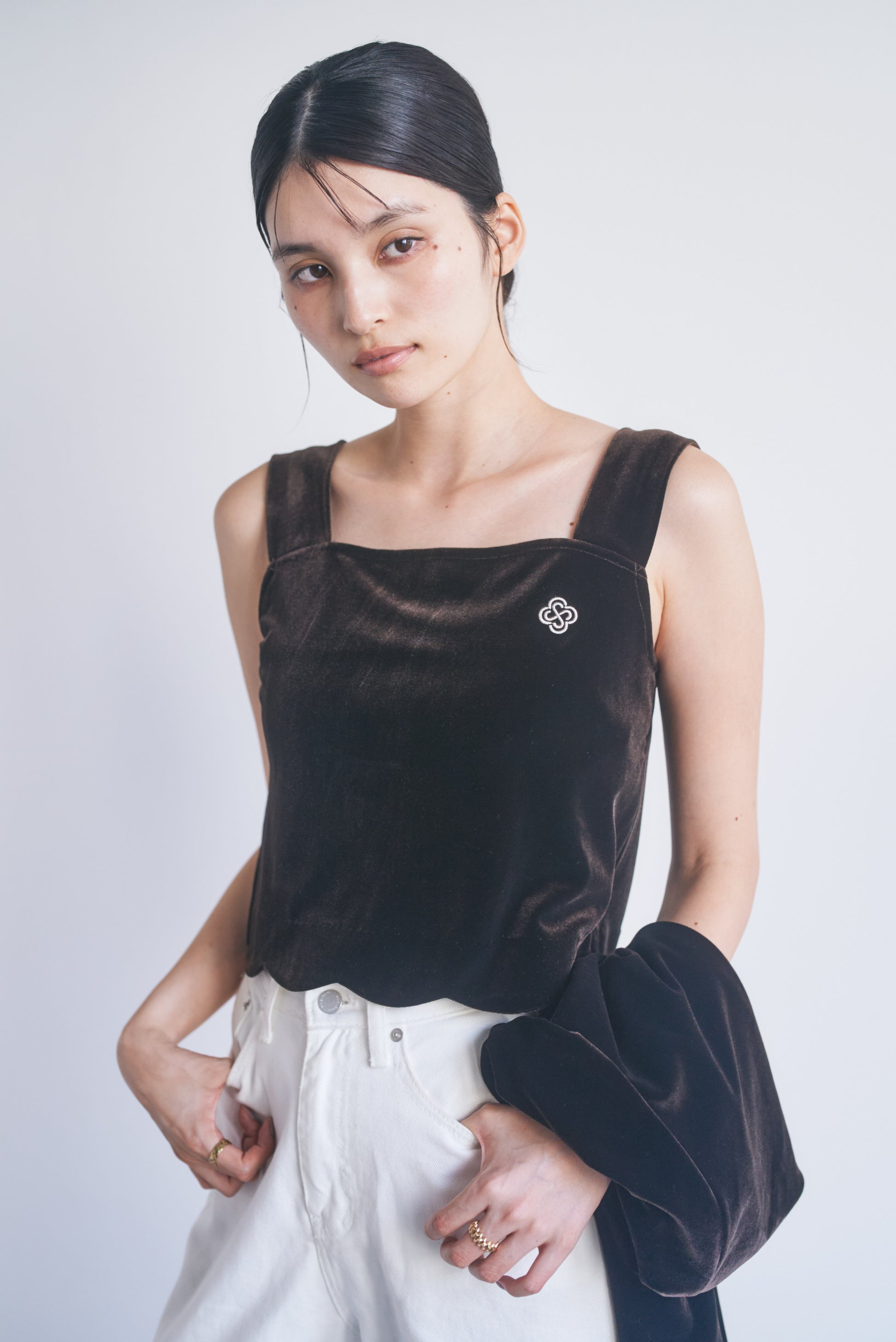 上品な光沢が特徴のベロア生地を使用し、裾にはフェミニンなスカラップカットが施されており、カジュアルながら洗練された印象を与えます。胸元にはCONNSEのオリジナルロゴマークが刺繍されており、さりげないアクセントとなっています。