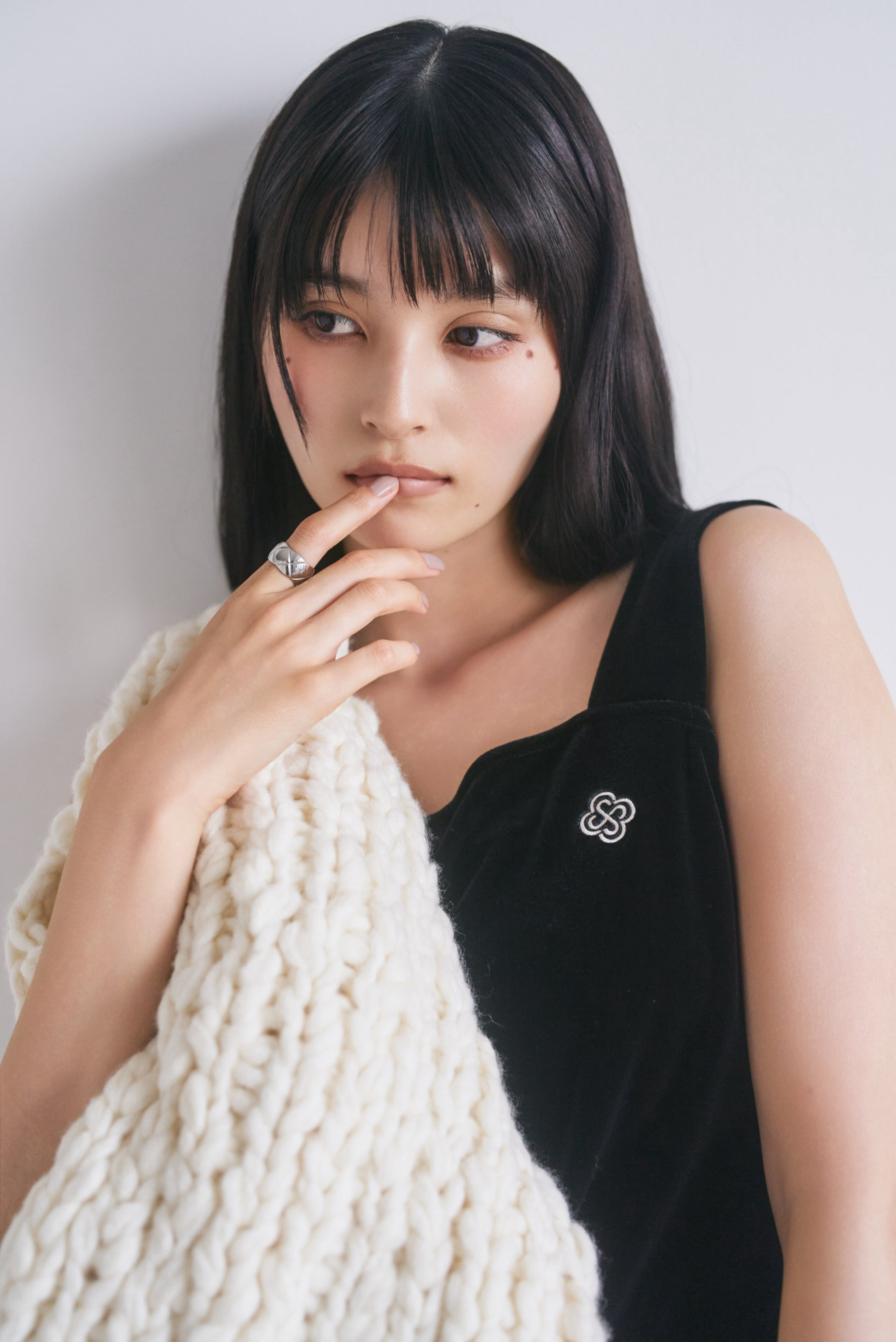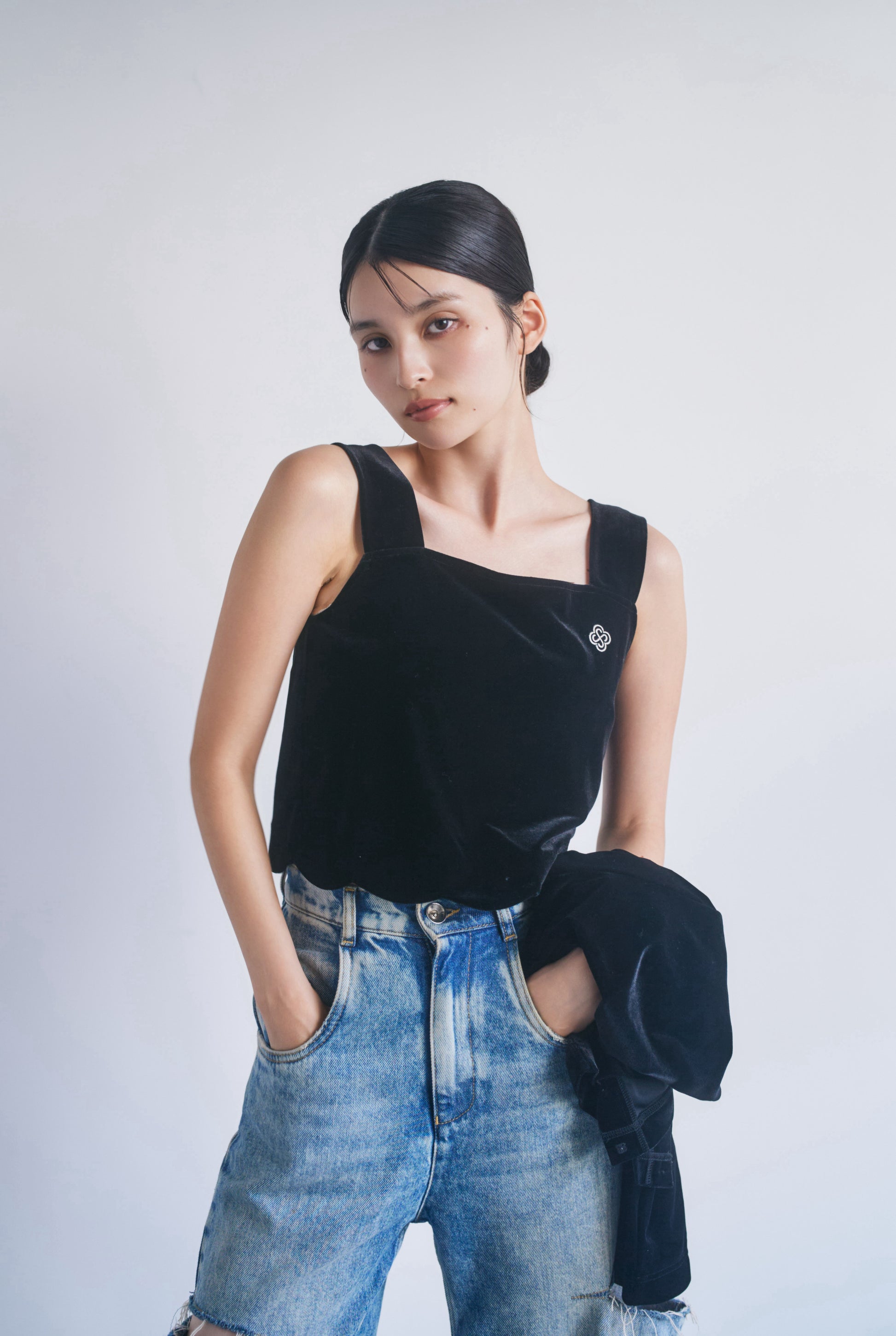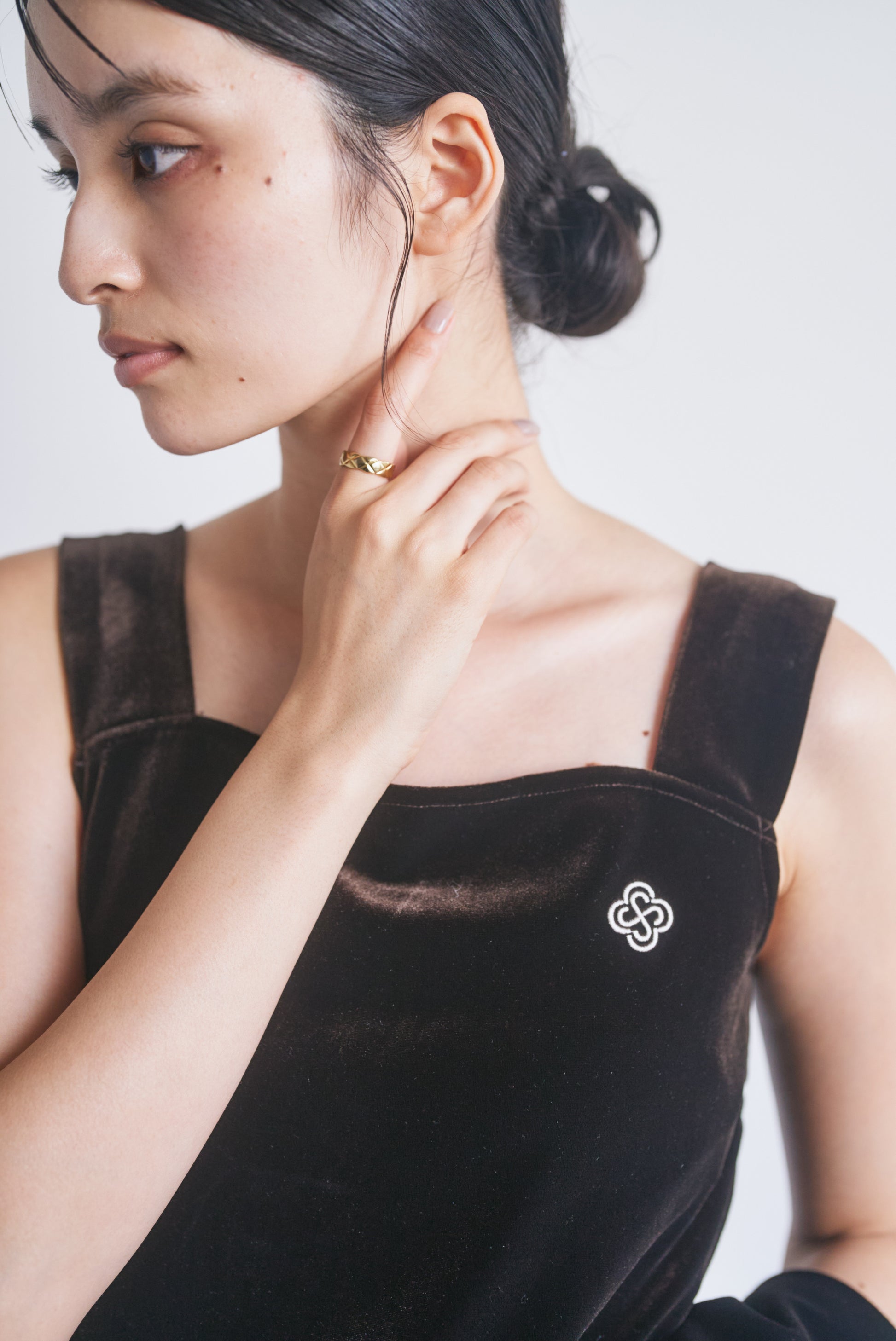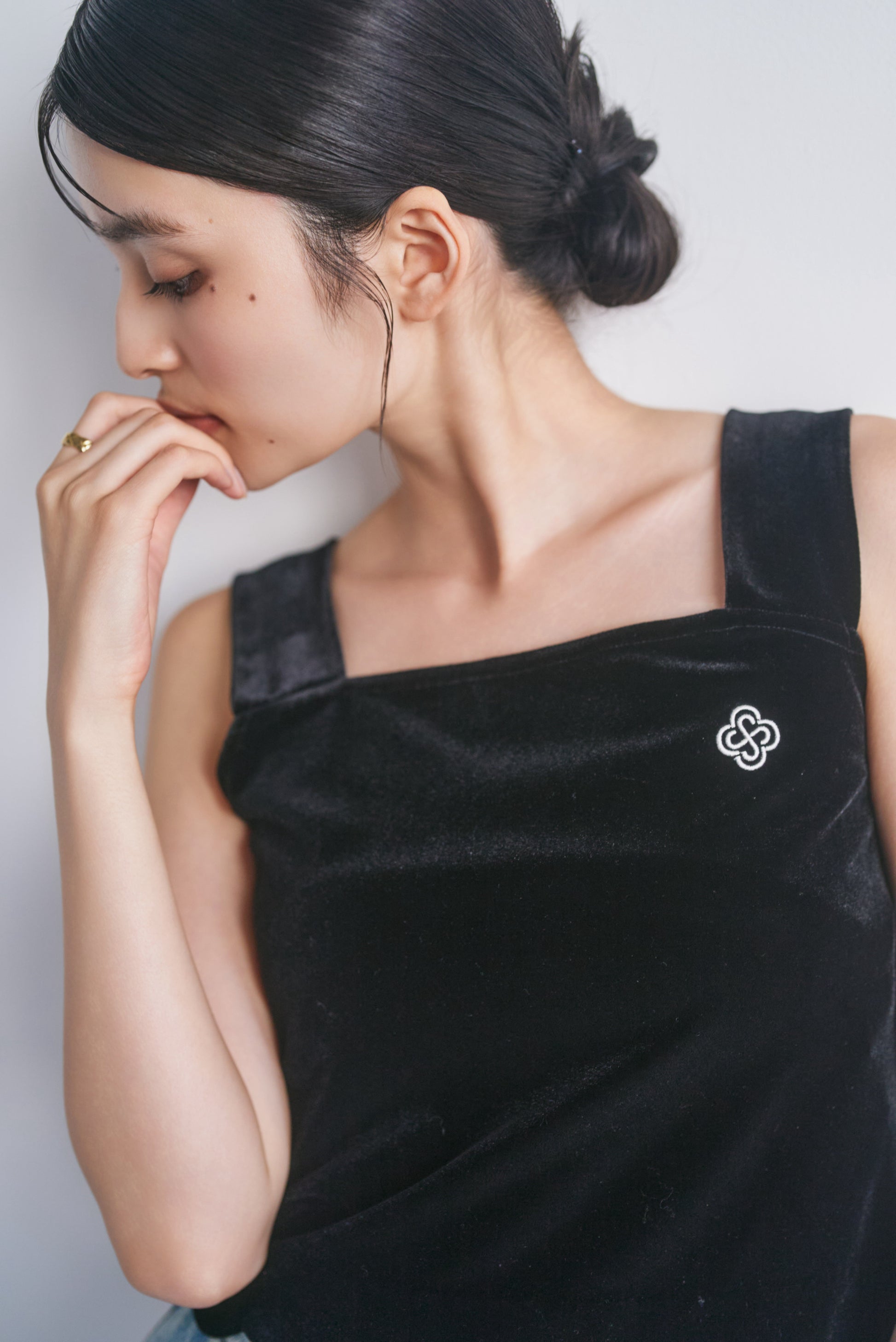 上品な光沢が特徴のベロア生地を使用し、裾にはフェミニンなスカラップカットが施されており、カジュアルながら洗練された印象を与えます。胸元にはCONNSEのオリジナルロゴマークが刺繍されており、さりげないアクセントとなっています。