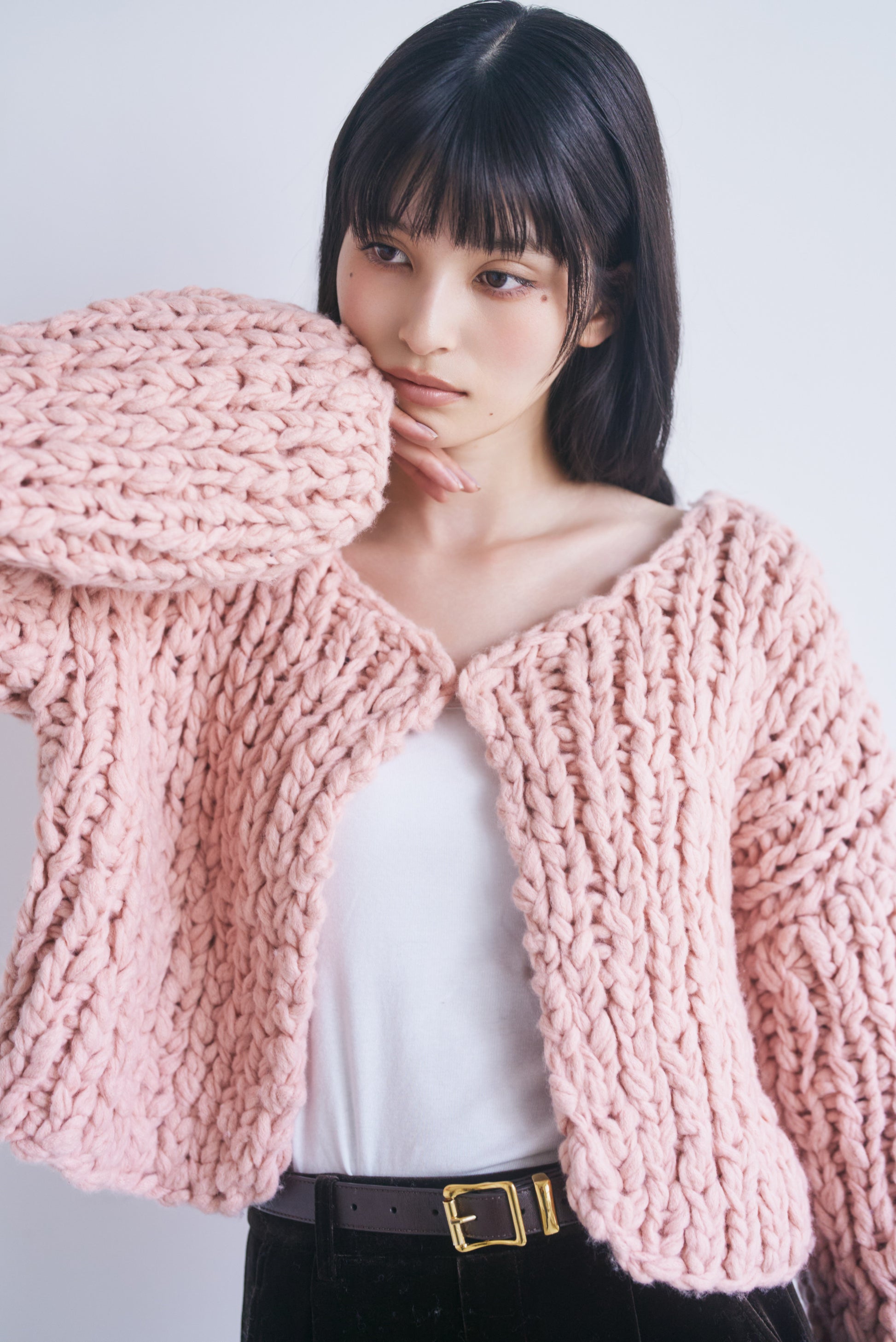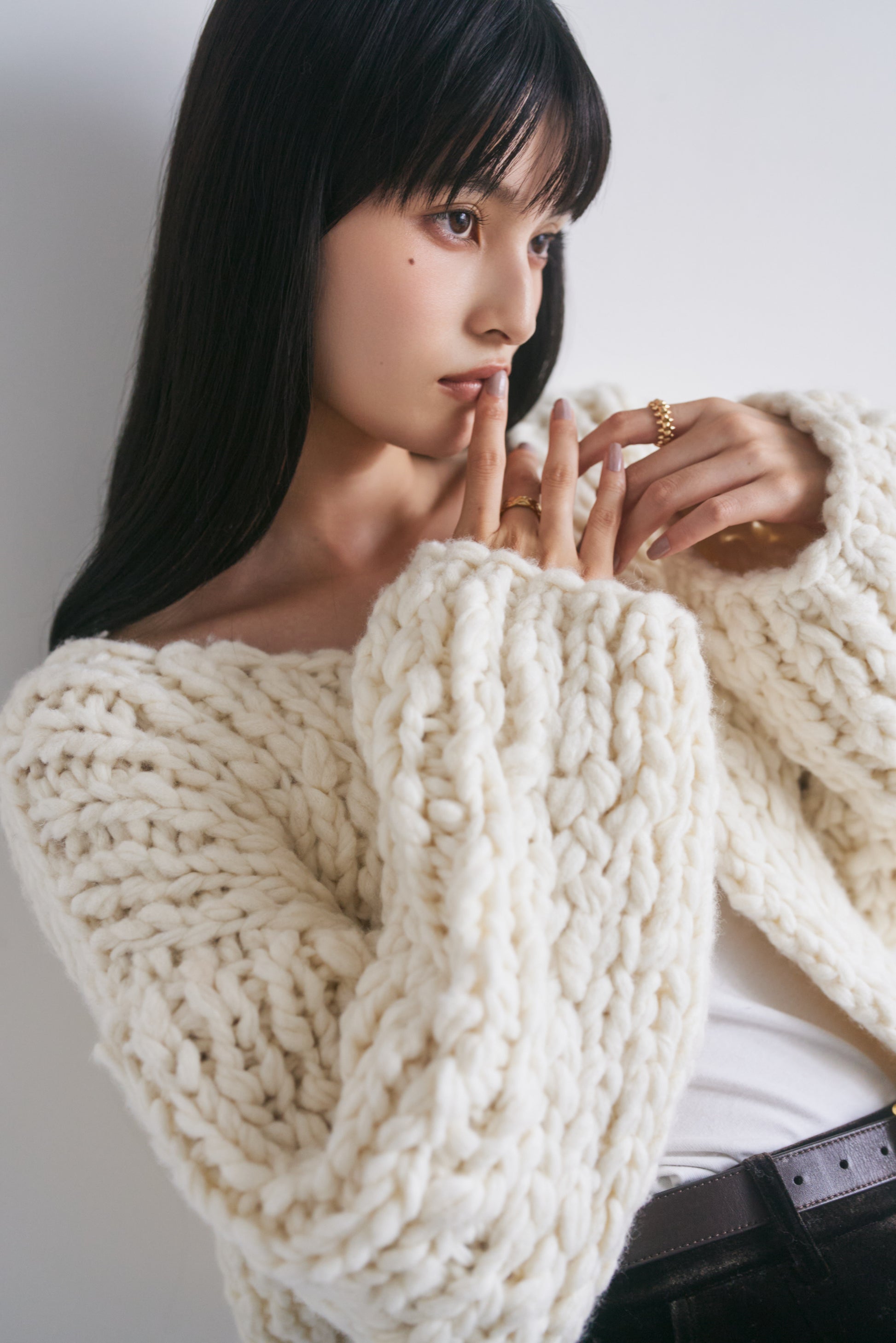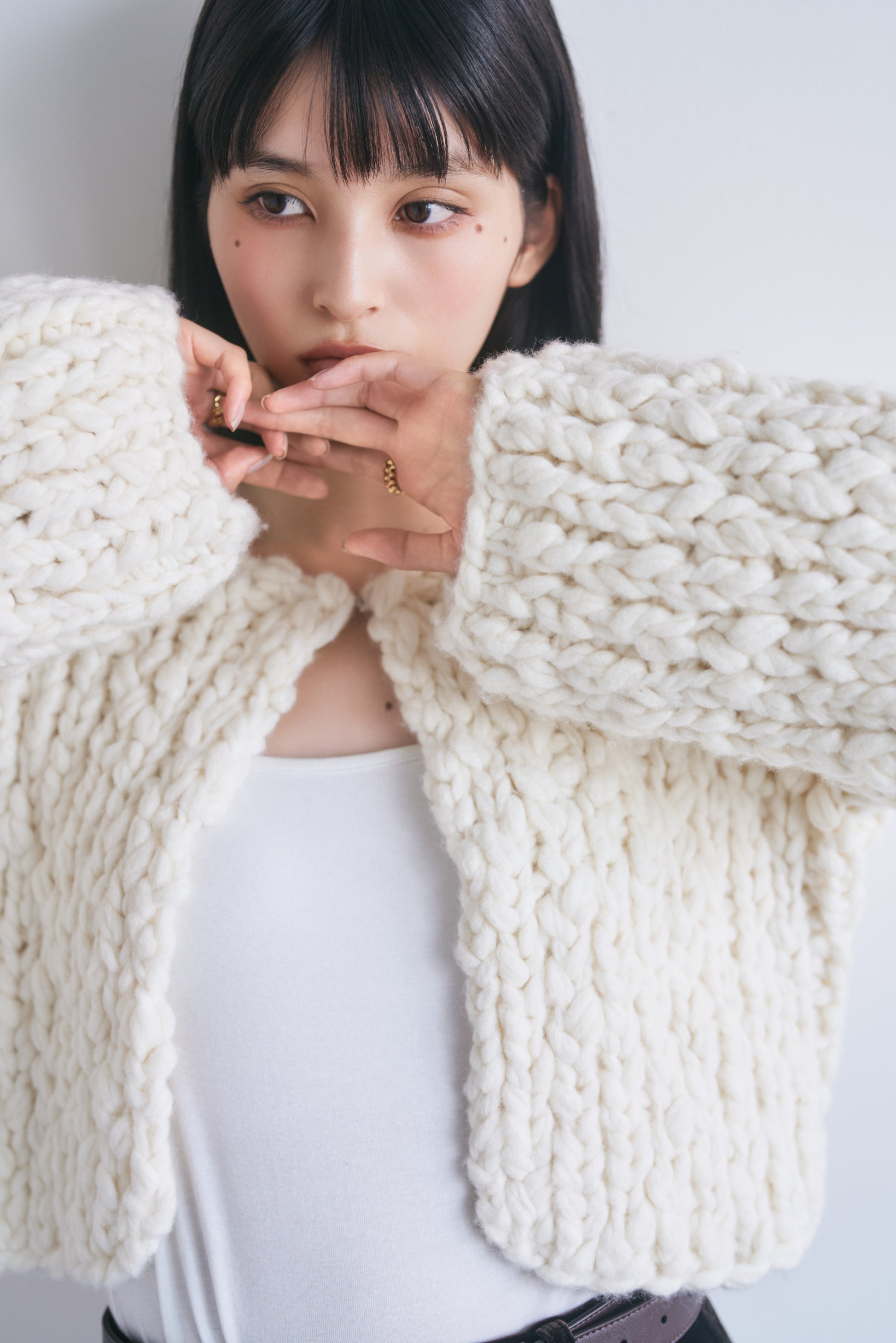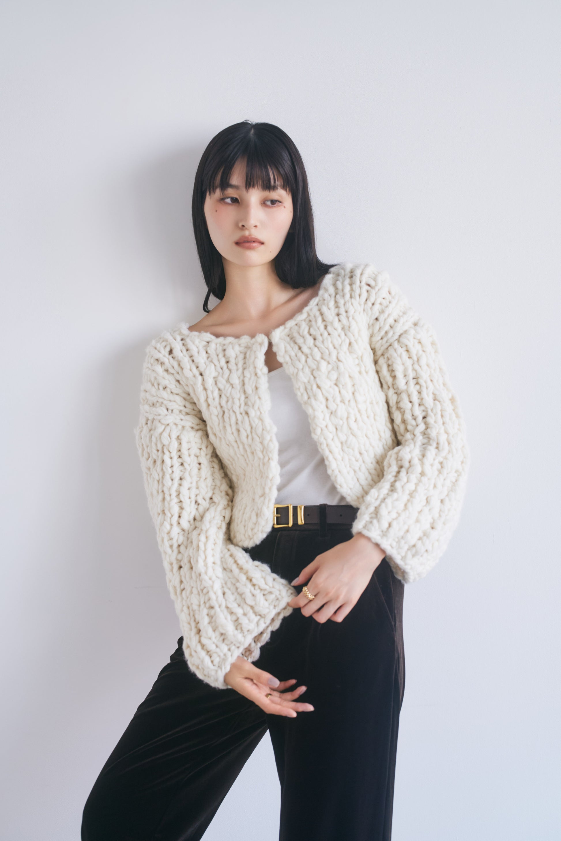 今期イチ押しの手編みにニットカーディガン。程よいボリュームをもたせた袖が特徴的。ボディーはコンパクトに仕上げることで、カジュアルながらも洗練された印象をプラスしています。ボタンを使用せずスッキリとした印象に仕上げることでデイリーから休日のリラックスシーンまで幅広いスタイリングにマッチする一枚です。