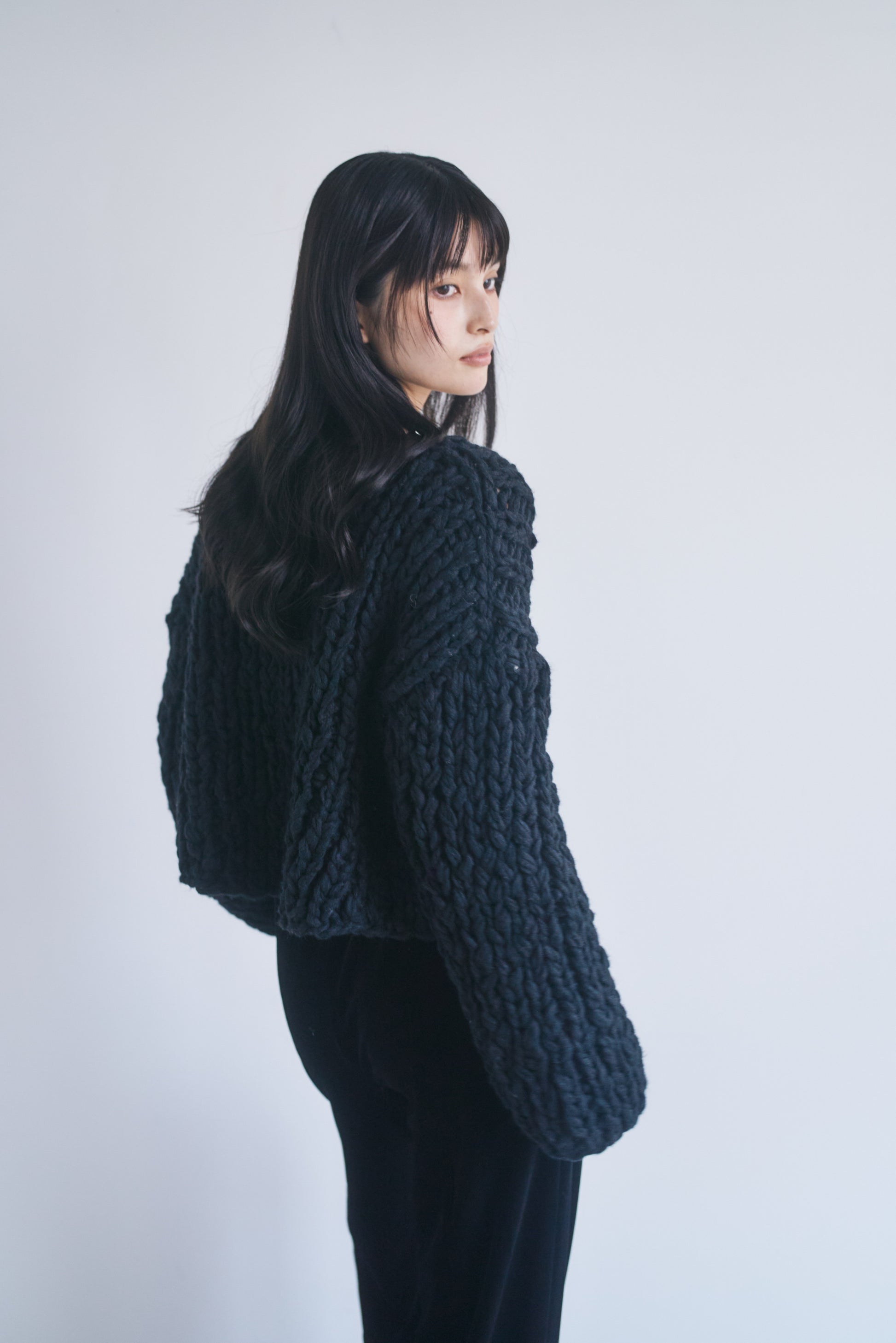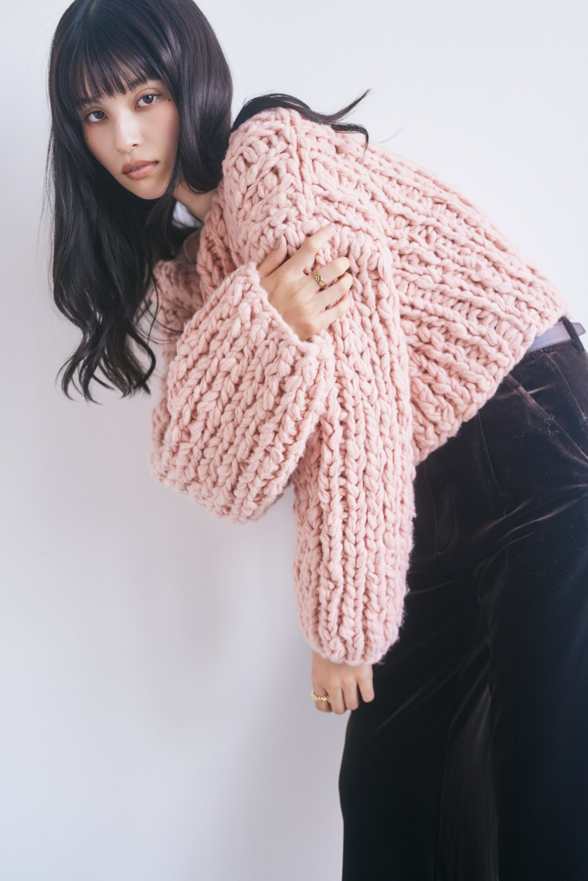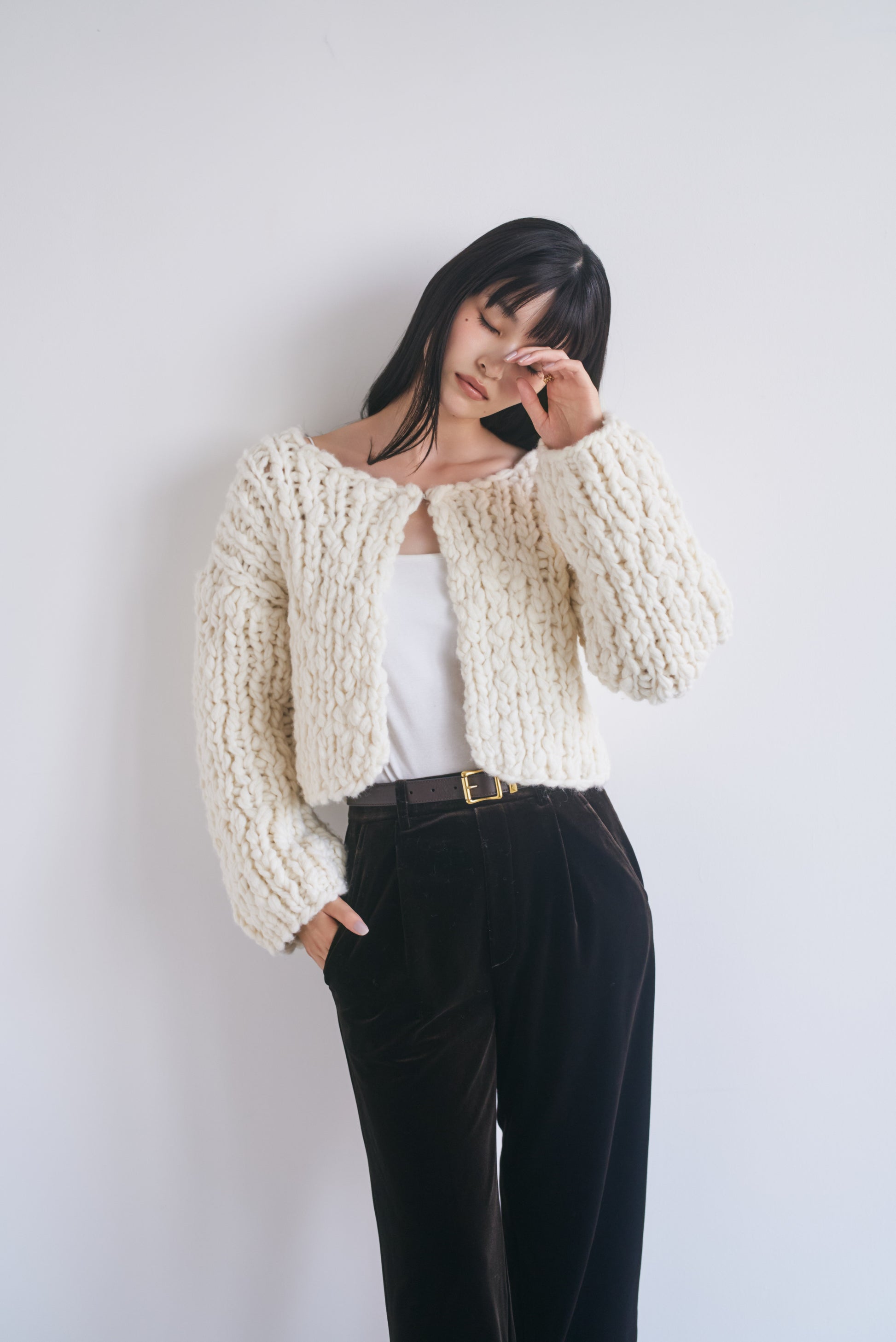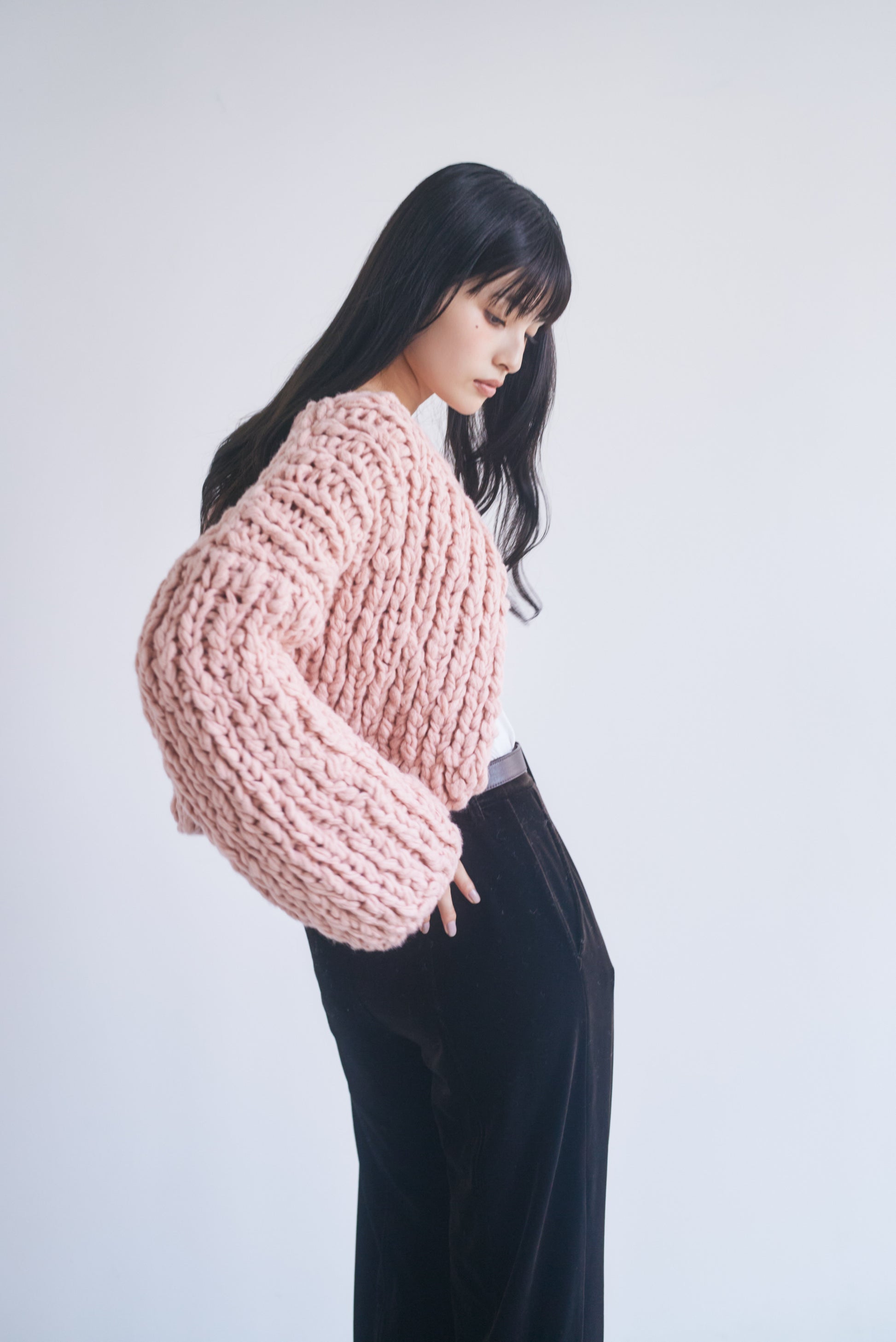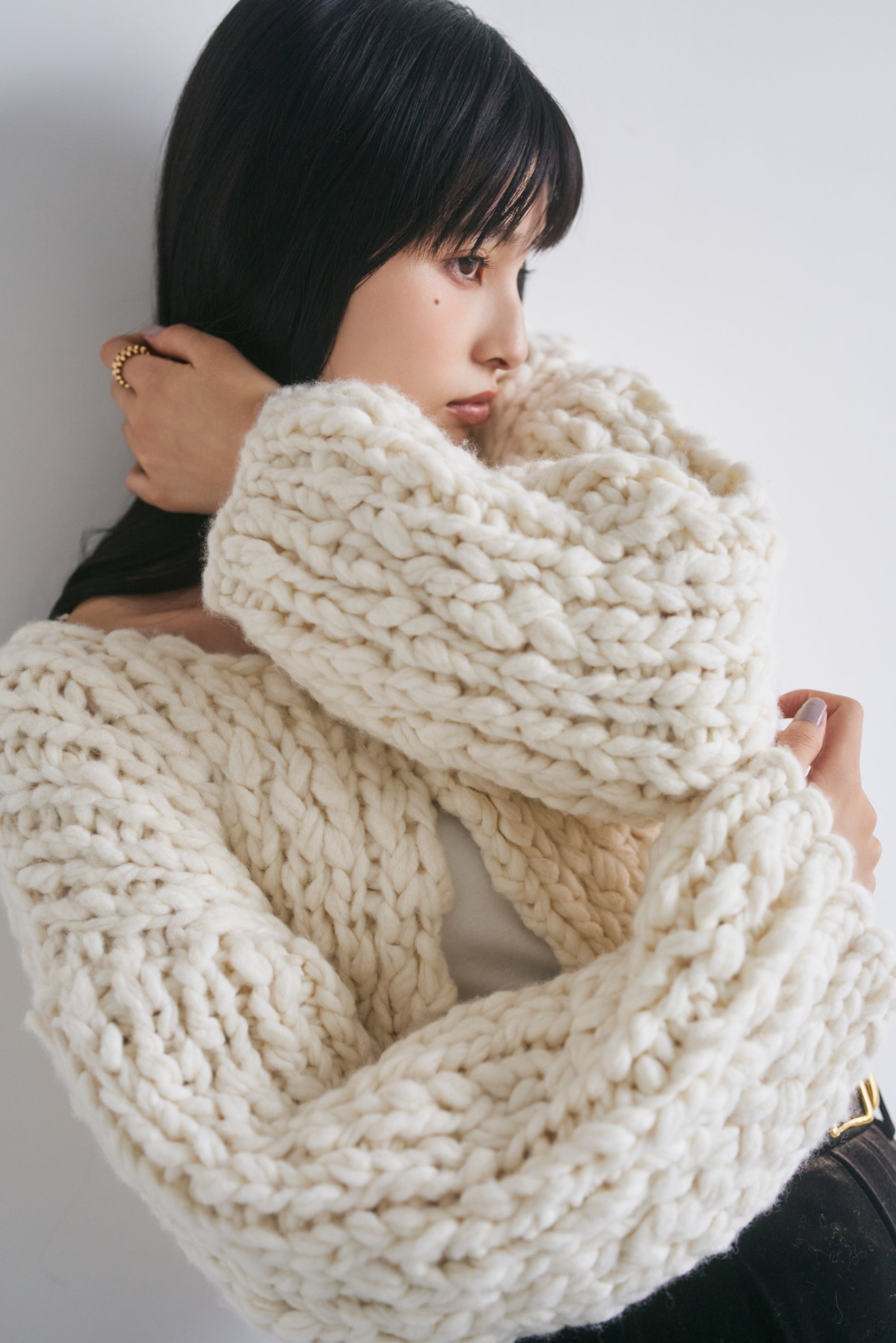 今期イチ押しの手編みにニットカーディガン。程よいボリュームをもたせた袖が特徴的。ボディーはコンパクトに仕上げることで、カジュアルながらも洗練された印象をプラスしています。ボタンを使用せずスッキリとした印象に仕上げることでデイリーから休日のリラックスシーンまで幅広いスタイリングにマッチする一枚です。