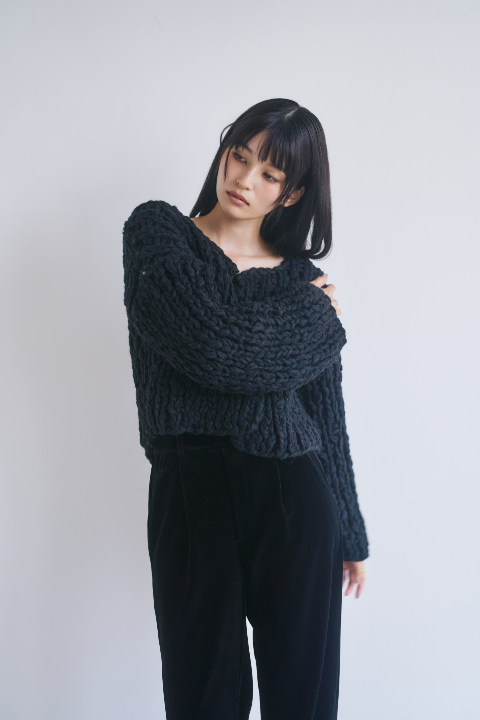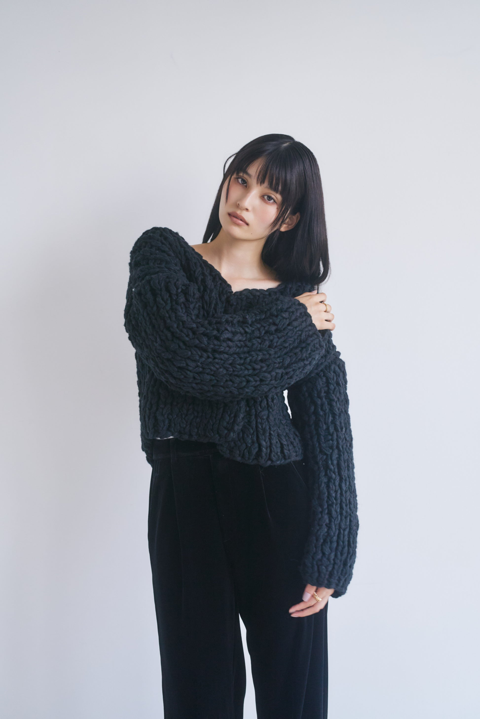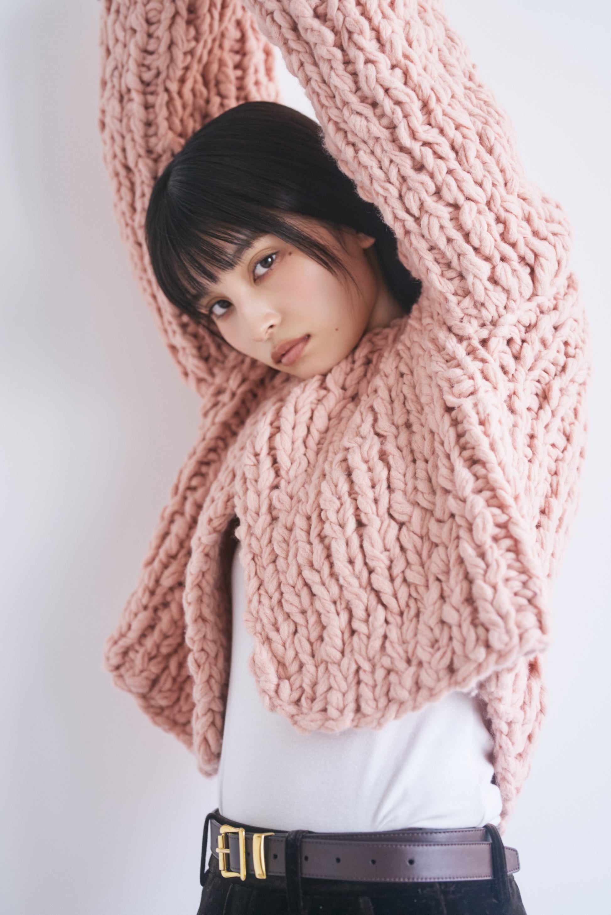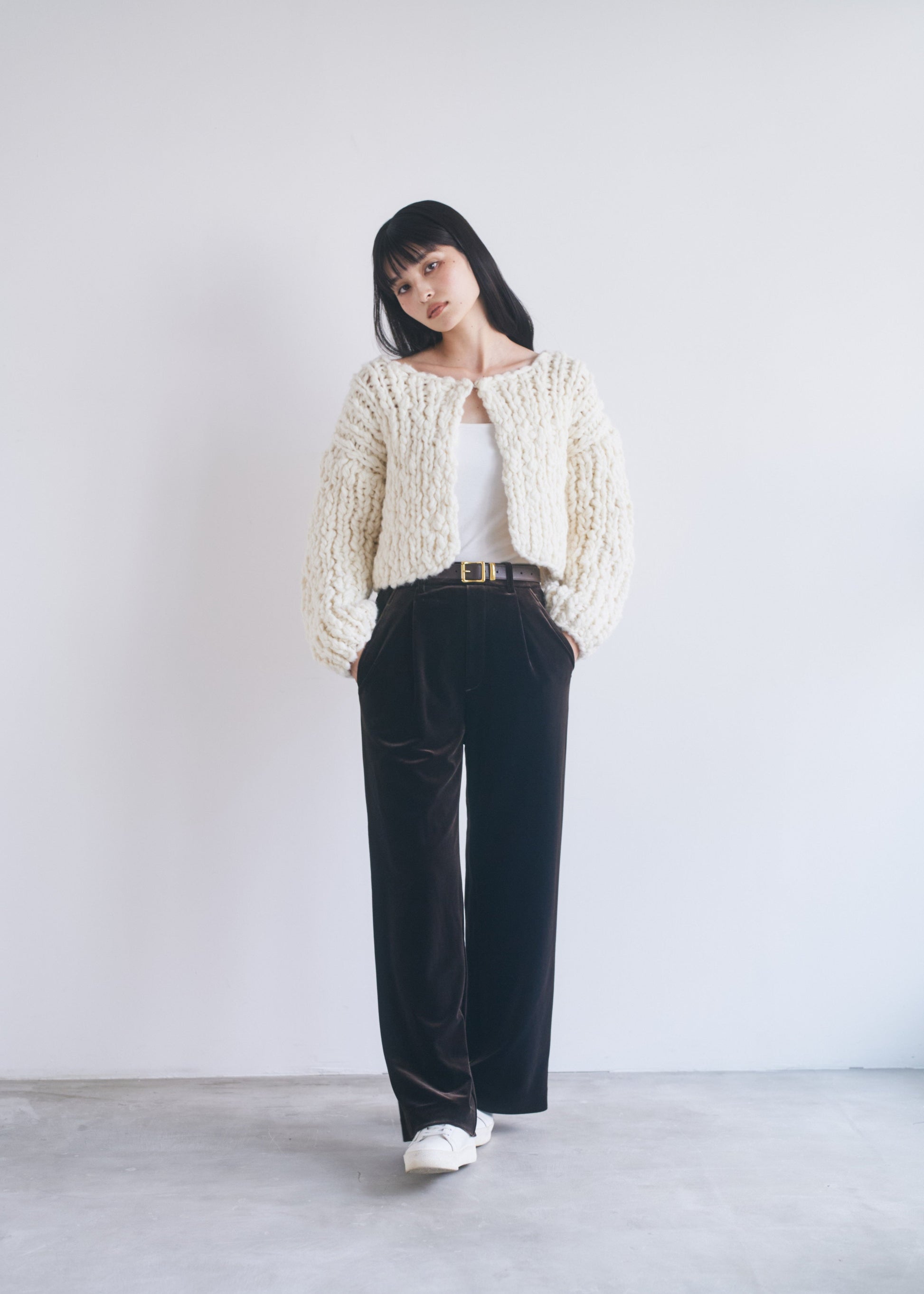 今期イチ押しの手編みにニットカーディガン。程よいボリュームをもたせた袖が特徴的。ボディーはコンパクトに仕上げることで、カジュアルながらも洗練された印象をプラスしています。ボタンを使用せずスッキリとした印象に仕上げることでデイリーから休日のリラックスシーンまで幅広いスタイリングにマッチする一枚です。